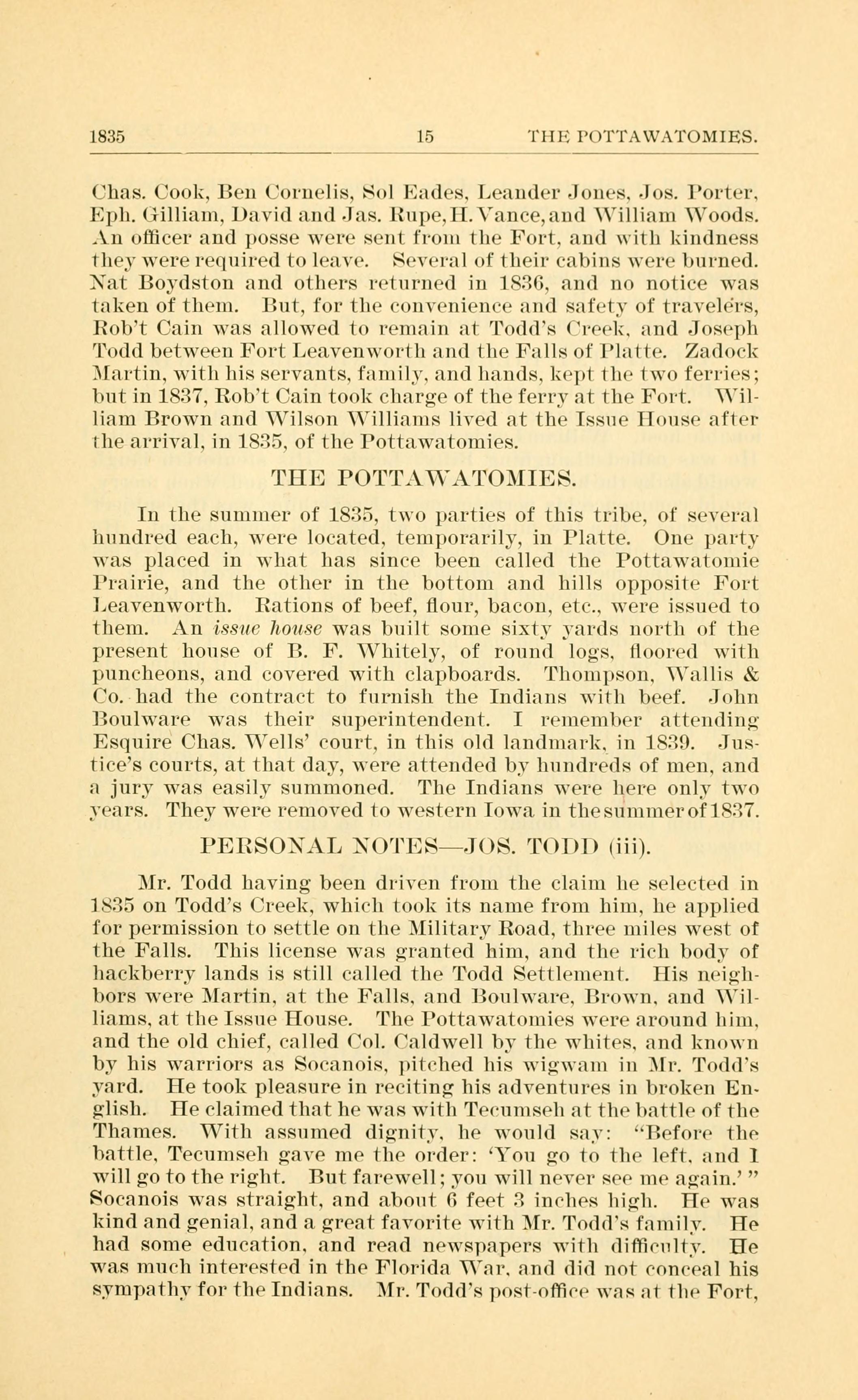 1835 15 THE POTTAWATOMIES Chas. Cook. Ben Cornelis, Sol Eades. Leander Jones. -Jos. Porter. Eph. Gilliam. David and Jas. Rupe H. Vance,and William Woods. . An officer and posse were sent from the Fort. and with kindness they were required to leave. Several of their cabins were burned. Nat Boydston and others returned in 1836. and no notice was taken of them. But, for the convenience and safety of travele1s, Robt Cain was allowed to remain at Todds Creek and Joseph Todd between Fort Leavenworth and the Falls of Platte. Zadock Martin. with his servants. family, and hands. kept the two ferries; but in 1837, Rob't Cain took charge of the ferrv at the Fort. William Brown and Wilson Wi1liams lived at the Issue House after the arrival, in 1835. of the Pottawatomies. THE POTTAWATOMIES In the summer of 1835, two parties of this tribe. of several hundred each, were located. temporarily, i11 Platte. One party was placed in what has since been called the Pottawatomie Prairie, a11d the other in the bottom and hills opposite Fort Leavenworth. Rations of beef, our, bacon. etc-.. were issued to them. An issue h01lS(3 was built some sixty yards north of the present house of B. F. Vhitely. of ro11nd logs. oored with puncheons, and covered with clapboards. Thompson, Vallis & Co. had the contract to fur11isl1 the Indians with beef. John Boulware was their superintendent. I remember attending: Esquire Chas. Wells court, i11 this old landmark. in 1839. Jus- tices courts, at that day, were attended by hundreds of men. and a jury was easily summoned. The Indians were here only two years. They were removed to western Iowa iii the summer of 1837. PERSONAL NOTES - JOS. TODD (iii) Mr. Todd having been driven from the claim he selected in 1835 on Todds Creek. which took its name from him. he applied for permission to settle on the Military Road, three miles west of the Falls. This license was granted him, and the rich body of hackberry lands is still called the Todd Settlement. His neigh- bors were Martin. at the Falls. and Boulware. Brown. and il- liams. at the Issue House. The Pottawatomies were around him, and the old chief, called Col. (aldwell by the whites. and known by his warriors as Socanois. pitched his wigzwam in Mr. Todds yard. He took pleasure in reciting his adventures in broken En- glish. He claimed that he was with Tecumseh at the battle of the Thames. With assumed dignitv. he would say: "Before the battle. Tecumseh gave me the order: You go to the left. and I will go to the right. But farewell; you will never see me again. Socanois was straight, and about 6 feet 3 inches higli. He was kind and genial, and a great favorite with Mr. lodds family. He had some education. and read newspapers with difficulty. He was much interested in the Florida War. and did not conceal his sympathy for the Indians. Mr. [odds post-office was at the Fort,