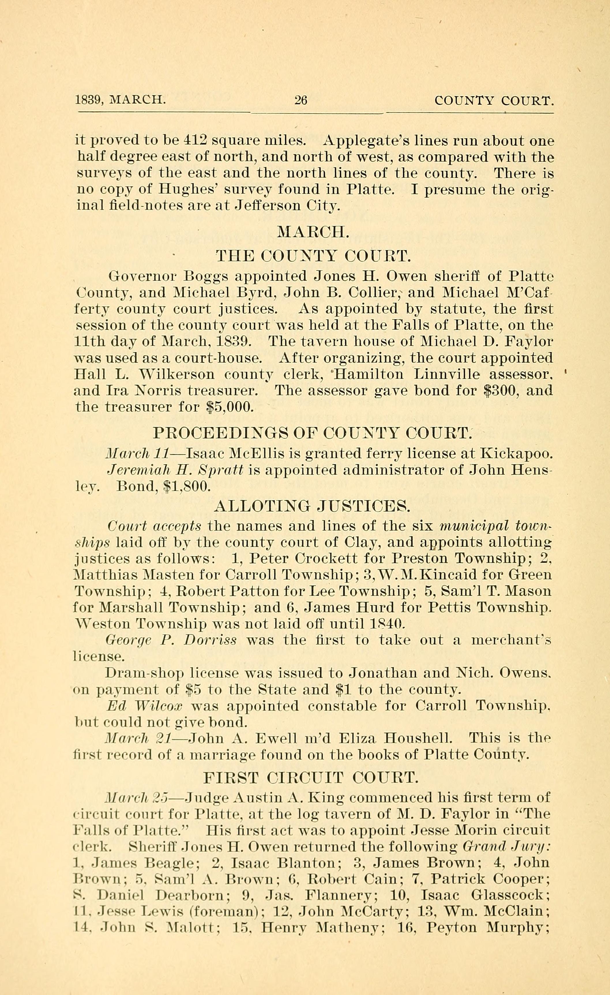 1839, MARCH. 26 COUNTY COURT. it proved to be 412 squa.re miles. Applegates lines run about one half degree east of north, and north of west, as compared with the surveys of the east and the north lines of the county. There is no copy of Hughes survey found in Platte. I presume the orig- inal eld-notes are at Jefferson City. MARCH. THE COUNTY COURT. Governor Boggs appointed Jones H. Owen sheri of Platte (founty, and Michael Byrd, John B. Collier; and Michael MCaf- ferty county court justices. As appointed by statute, the rst session of the county court was held at the Falls of Platte, on the 11th day of March, 1839. The tavern house of Michael D. Faylor was used as a court-house. After organizing, the court appointed Hall L. Wilkerson county clerk, Hamilton Linnville assessor. and Ira Norris treasurer. The assessor gave bond for $300, and the treasurer for $5,000. PROCEEDINGS OF COUNTY COURT. .l[mc-h11Isaac McEllis is granted ferry license at Kickapoo. Jeremiah H. Spraft is appointed administrator of John Hens- ley. Bond, $1.800. ALLOTING JUSTICES. Court accepts the names and lines of the six mumlcipal town~ ships laid off by the county court of Clay, and appoints allotting justices as follows: 1, Peter Crockett for Preston Township; 2. Matthias Masten for Carroll Township; M. Kincaid for Green Township; 4, Robert Patton for Lee Township; 5, Saml T. Mason for Marshall Township; and 6. James Hurd for Pettis Township. Yeston Township was not laid oft" until 1840. Gcorr/0 P. Dorriss was the rst to take out a mer(-hants license. Dram-shop license was issued to Jonathan and Nich. Owens. all payment of to the State and $1 to the county. Ed Wilmr was appointed constable for Carroll Township. but could not give bond. Jlarr-h :?IJohn A. Ewell n1d Eliza. Houshell. This is the rst rm-(ml of a niarriage found on the books of Platte County. FIRST CIRCUIT COURT. ,llmv:h .3.7-"Judge Austin A. King commenced his rst term of .-in-nit r-nnrt for Platte. at the log tavern of M. D. Faylor in The Fznlls of ]l:n1te. llis rst act was to appoint Jesse Morin circuit cl:-rlc. Sh:-ri Jom-s H. Owen returned the following Graml -Imjz/.- 1, Jaim-. Beagle; 2, Isaac Blanton; 3, James Brown: 4, John irownz 5. San1l .. Rrown; (3. Robert Cain; 7, Patrick Cooper; S. l):II1ivl l.)(-a1l)0111; 9, Jas. Flannery; 10, Isaac Glasscock; I I. Jes.~u- L:-wis (fol-einanlz :3, John McCarty; 13, Wm. McClain; I4. John S. .l:1lutt: 15. Henry Matheny: 16, Peyton Murphy;