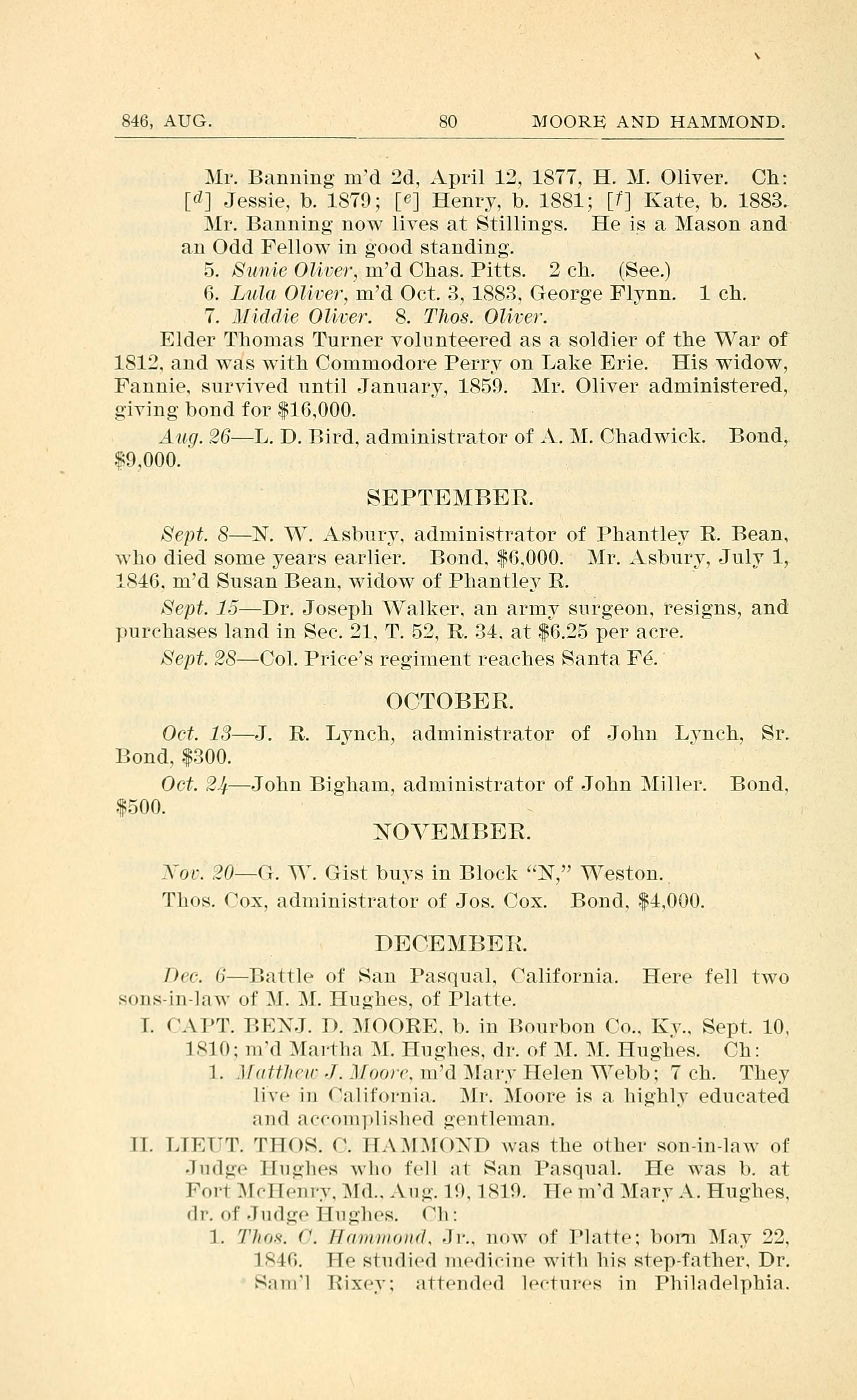 1846, AUG. 80 MOORE AND HAMMOND. Mr. Banning married second, April 123, 1877, H. M. Oliver. Children: [d] Jessie, b. 1879; [6] Henry, b. 1881; [T] Kate, b. 1883. Mr. Banning now lives at Stillings. He is a Mason and an Odd Fellow in good standing. 5. Sunie Oliver, md Chas. Pitts. 2 ch. (See) 6. Lula Oliver, md Oct. 3, 1883. George Flynn. 1 ch. 7. Middie Oliver. 8. Thos. Oliver. Elder Thomas Turner volunteered as a soldier of the War of 1812, and was with Commodore Perry on Lake Erie. His Widow, Fannie. survived until January, 1859. Mr. Oliver administered, giving bond for $16,000. Aug. 26 - L. D. Bird. administrator of A. M. Chadwick. Bond, $9.000. SEPTEMBER. Sept. 8 N. W. Asbury, administrator of Phantlev R. Bean, who died some years earlier. Bond. $3.000. Mr. Asbury. July 1, 1846. md Susan Bean. Widow of Phantley R. Sept. 15 Dr. Joseph Walker, an army surgeon. resigns, and purchases land in Sec. 21, T. 52, R. 34, at $6.25 per acre. Sept. 28 Col. Prices regiment reaches Santa Fe. OCTOBER. Oct. 13 J. R. Lynch, administrator of John Lynch, Sr. Bond. $300. Oct. 24 John Bigham, administrator of John Miller. Bond. $500. NOVEMBER. Nov. 20. G. W. Gist buys in Block N, Weston. Thus. Pox, administrator of Jos. Cox. Bond. $4,000. DECEMBER. Dec. 6 - Battle of San Pasqual, California. Here fell two, sons-in-law of M. M. Hughes, of Platte. I. CAPT. BENJ. D. MOORE, b. in Bourbon Co. Ky., Sept. 10, 1810; married Martha M. Hughes, dr. of M. M. Hughes. Children: 1. Matthew J. Moore, married Mary Helen Webb; 7 ch. They live in California. Mr. Moore is a highly educated and accomplished gentleman. II. LIEUT. THOS. C. HAMMOND was the other son-in-law of Judge Hughes who fell at San Pasqual. He was b. at Fort McHenry, Md., Aug. 19, 1819. He married Mary A. Hughes, daughter of Judge Hughes. Children: 1. Thos. C. Hammond, Jr., now of Platte; born May 22, 1846. He studied medicine with his step-father, Dr. Samuel Rixey; attended lectures in Philadelphia.