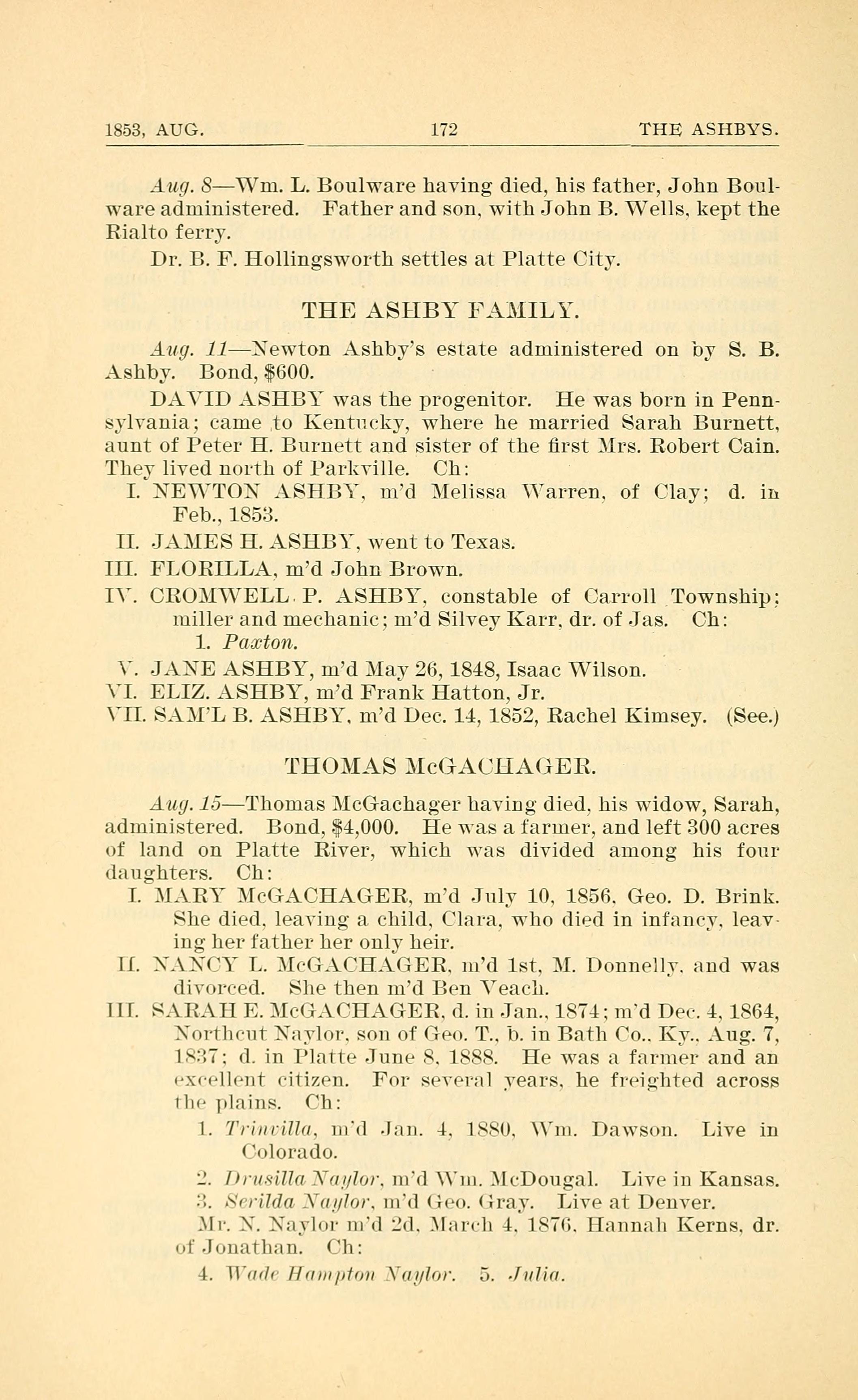 1853, AUG. 172 THE ASHBYS. Aug. 8 - William L. Boulware having died, his father, John Boulware administered. Father and son, with John B. Wells, kept the Rialto ferry. Dr. B. F. Hollingsworth settles a.t Platte City. THE ASHBY FAMILY. Aug. 11 - Newton Ashby's estate administered on by S. B. Ashby. Bond, $600. DAVID ASHBY was the progenitor. He was born in Penn- sylvania; came to Kentucky, Where he married Sarah Burnett. aunt of Peter H. Burnett and sister of the first Mrs. Robert Cain. They lived north of Parkville. Children: I. NEWTON ASHBY. n1d Melissa Yarren. of Clay; (1. in Feb.. 1853. II. JAMES H. ASHBY, went to Texas. III. FLORILLA, md John Brown. IV. CROMWELLP. ASHBY. constable of Carroll Township; miller and mechanic; md Silvey Karr. dr. of Jas. Children: 1. Paacton. V. JANE ASHBY, md May 26, 1848, Isaac Wilson. VI. ELIZ. ASHBY, md Frank Hatton, Jr. VII. SAMUEL B. ASHBY. md Dec. 14, 1852, Rachel Kimsey. (See.) THOMAS McGACHAGER. Aug.15 - Thomas McGachager having died, his widow, Sarah, administered. Bond, $4,000. He was a farmer, and left 300 acres of land on Platte River, which was divided among his four daughters. Children: I. MARY McGACHAGER. md July 10. 1856. Geo. D. Brink. She died. leaving a, child. Clara. who died in infaiicy. leav~ ing her father her only heir. II. NANCY L. McGACHAGER. 111d 1st. M. Donnell). and Was divorced. She then md' Ben Veach. III. SARAH E. McGACHAGER. d. in Jan., 1874; m'd Dec. 4, 1864, Northcut Naylor, son of George T. Naylor, b. in Bath Co., Ky., Aug. 7, 1837; d. in Platte June 8, 1888. He was a farmer and an excellent citizen. For several years, he freiged across the plains. Children: 1. Trinvilla Naylor, m'd Jan. 4, 1880, Willaim Dawson. Live in Colorado. 2. Drusilla Naylor, m'd William McDougal. Live in Kansas. 3. Serilda Naylor, m'd George Gray. Live in Denver. Mr. Northcut Naylor m'd 2d, March 4, 1876, Hannah Kerns, dr. of Jonathan. Children: 4. Wade Hampton Naylor 5. Julia