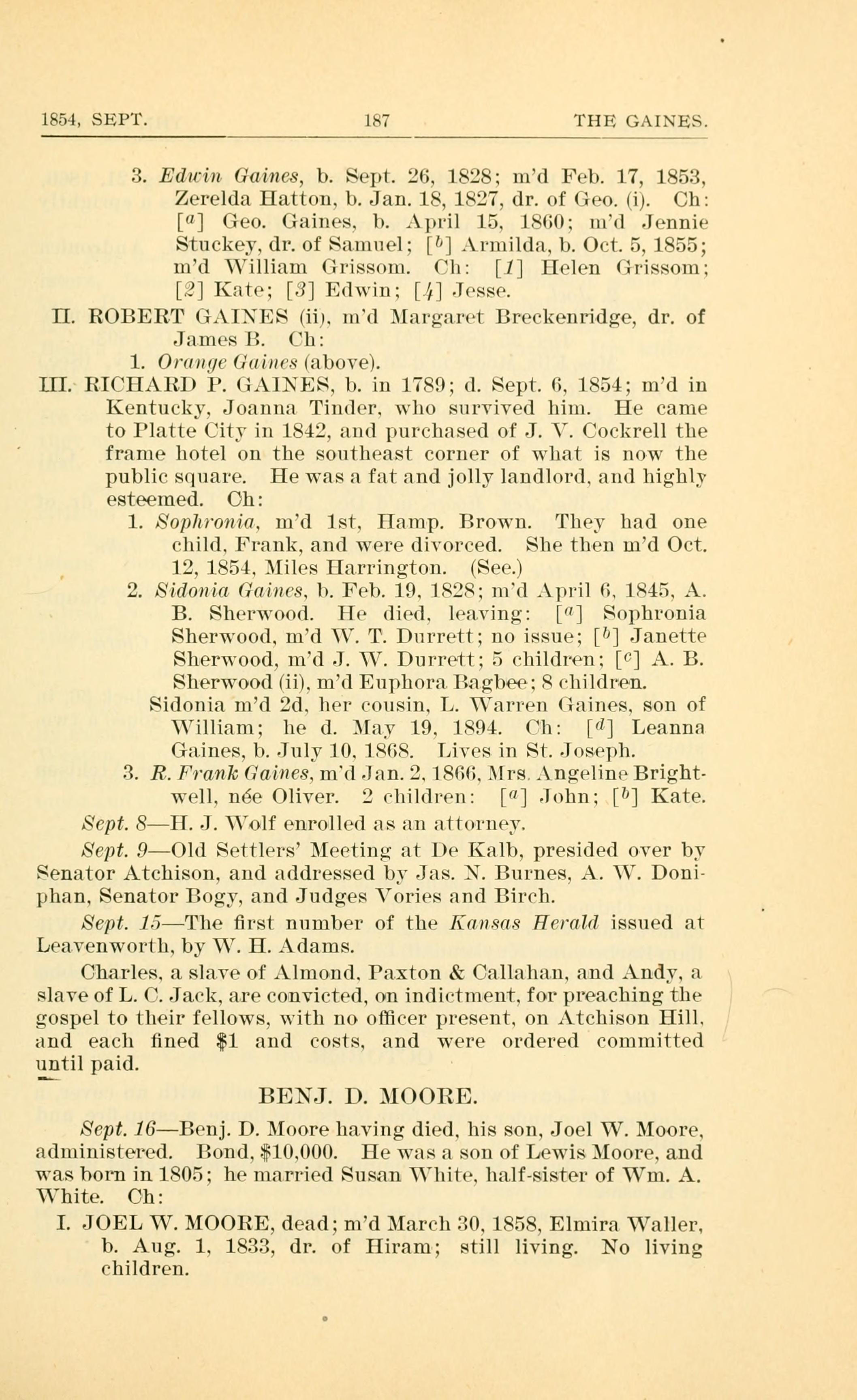 1854, SEPT. 187 THE GAINES. 3. Edzrirzi Gaines, b. Sept. 26, 1828; md Feb. 17, 1853, Zerelda Hatton, b. Jan. 18, 1827, dr. of Geo. (pi). Children: [1] Geo. Gaines, b. April 15, 18130; ml Jennie Stuckey, dr. of Samuel; [0] Armilda, b. Oct. 5, 1855; md William Grissom. (Th: [1] Helen Grissom; [.3] Kate; [3] Edwin; [1,] Jesse. H. ROBERT GAINES (ii). md Margaret Breckenridge, dr. of James B. Children: 1. Orange (}uimus- (above). III. RICHARD P. (JAINES, b. in 1789; d. Sept. 6, 1854; md in Kentucky, Joanna Tinder. wl1o survived him. He came to Platte City i11 1842, and purchased of J. V. Cockrell the frame hotel on the southeast corner of what is now the public square. He was a fat and jolly landlord, and highly esteemed. Children: 1. Sophromkz, md 1st. Hamp. Brown. They had one child. Frank, and were divorced. She then md Oct. 12, 1854, Wiles Harrington. (See.) 2. Sidonia G(une3, b. Feb. 19. 1929; n1d April (3. 1845. A. B. Sherwood. He die(l. leaving: [1] Sophronia Sherwood, md W. T. Durrett; no issue; [0] Janette Sherwood, md J. W. Durrett; 5 children: [0] A. B. Sherwood (ii), m(l Euphora. Bagbee; R (-hildren. Sidonia married second. her cousin. L. YVarren Gaines. son of William; he (1. May 19. 1894. (h: [(3] Leanna Gaines, b. July 10. 1..9(i8. Lives in St. Joseph. 3. R. Frank (lairnes, md Jan. 2. 1866, Mrs. Angeline Bright- well. ne Oliver. 2 children: [(1] John; ["] Kate. Sept. 8H. J. Wolf enrolled as an attorliey. Sept. 9Old Settlers Meeting at De Kalb, presided o-ver by Senator Atchison. and addressed by Jas. N. Burnes, A. V. Doni- phan, Senator Bogy, and Judges Vories and Birch. Sept. 15The rst number of the Kansas H(I(Il(I issued at Leavenworth, by W. H. Adams. Charles. a slave of Almond. Paxton & Callahan. and Andy. a slave of L. C. Jack, are convicted, on indictment. for preaching the gospel to their fellows, with no oicer present, on Atchison Hill. and each ned $1 and costs. and were ordered committed until paid. BENJ. D. MOORE. Sept. 16Benj. D. Moore having died, his son, Joel W. Moore. administered. ond, lF]0,()O0. He was a son of Lewis Moore. and wa.s born in 180 ; he married Susan Wl1ite. half-sister of Wm. A. White. Oh: I. JOEL W. MOORE, dead; md March 30, 1858, Elmira Waller, b. Aug. 1, 1833, dr. of Hiram; still living. No living children.