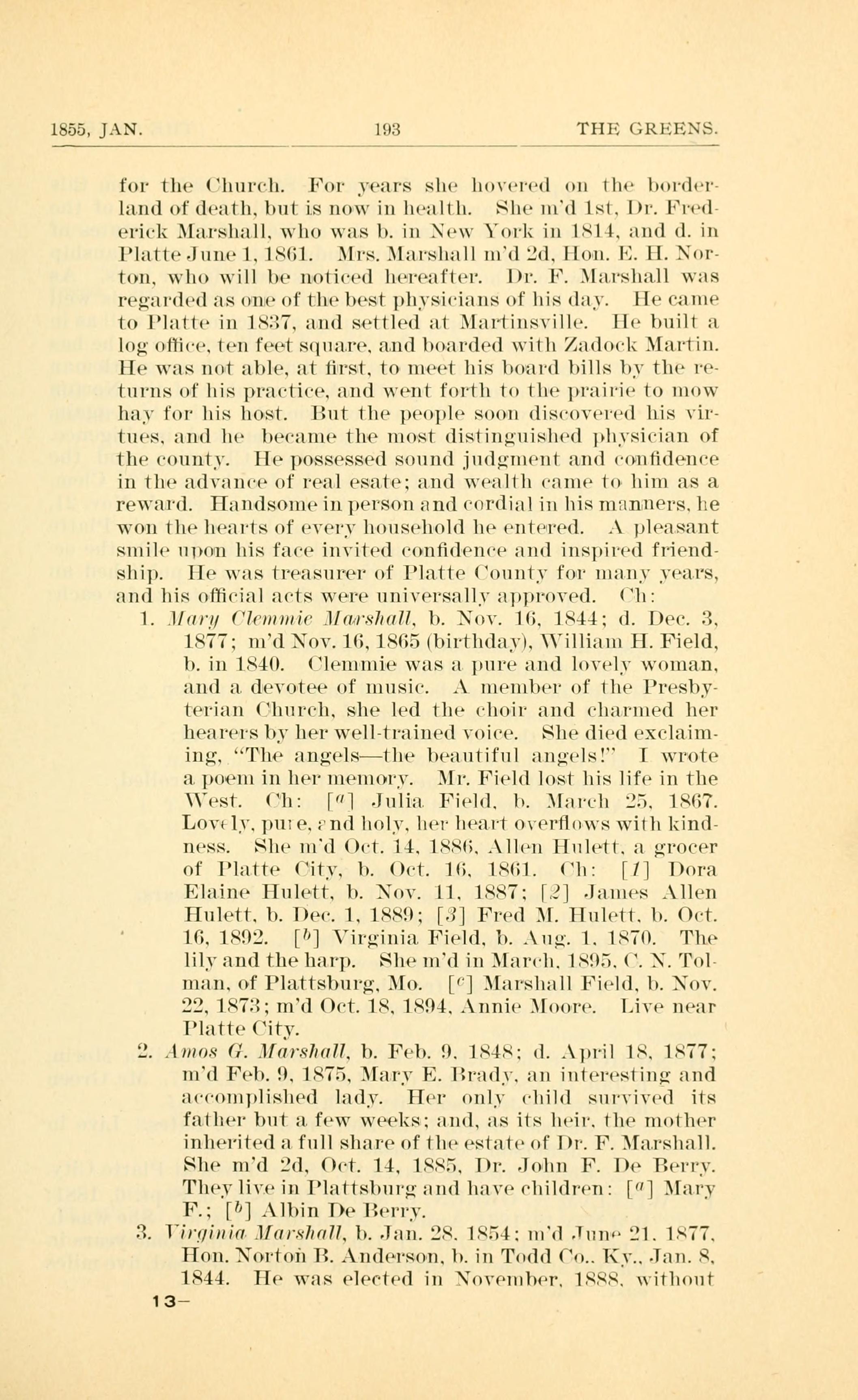 1855, JAN. 193 THE GREENS. Dr. Frederick Marshall, b. in New York in 1814, d. in Platte, June 1, 1861. Mrs. Marshall married 2nd, Hon. E. H. Norton. 1. Mary Clemmie Marshall, married William H. Field [a] Julia Field, married Allen Hulett, grocer of Platte City Dora Elain Hulett James Allen Hulett Fred M. Hulett [b] Virginia Field, married C. N. Tolman of Plattsburg [c] Marshall Field, married Annie Moore, live near Platte City 2. Amos G. Marshall, married Mary E. Brady Mary E. Brady married 2nd, Dr. John F. De Berry [a] Mary F. De Berry [b] Albin De Berry 3. Virginia Marshall, married Hon. Norton B. Anderson