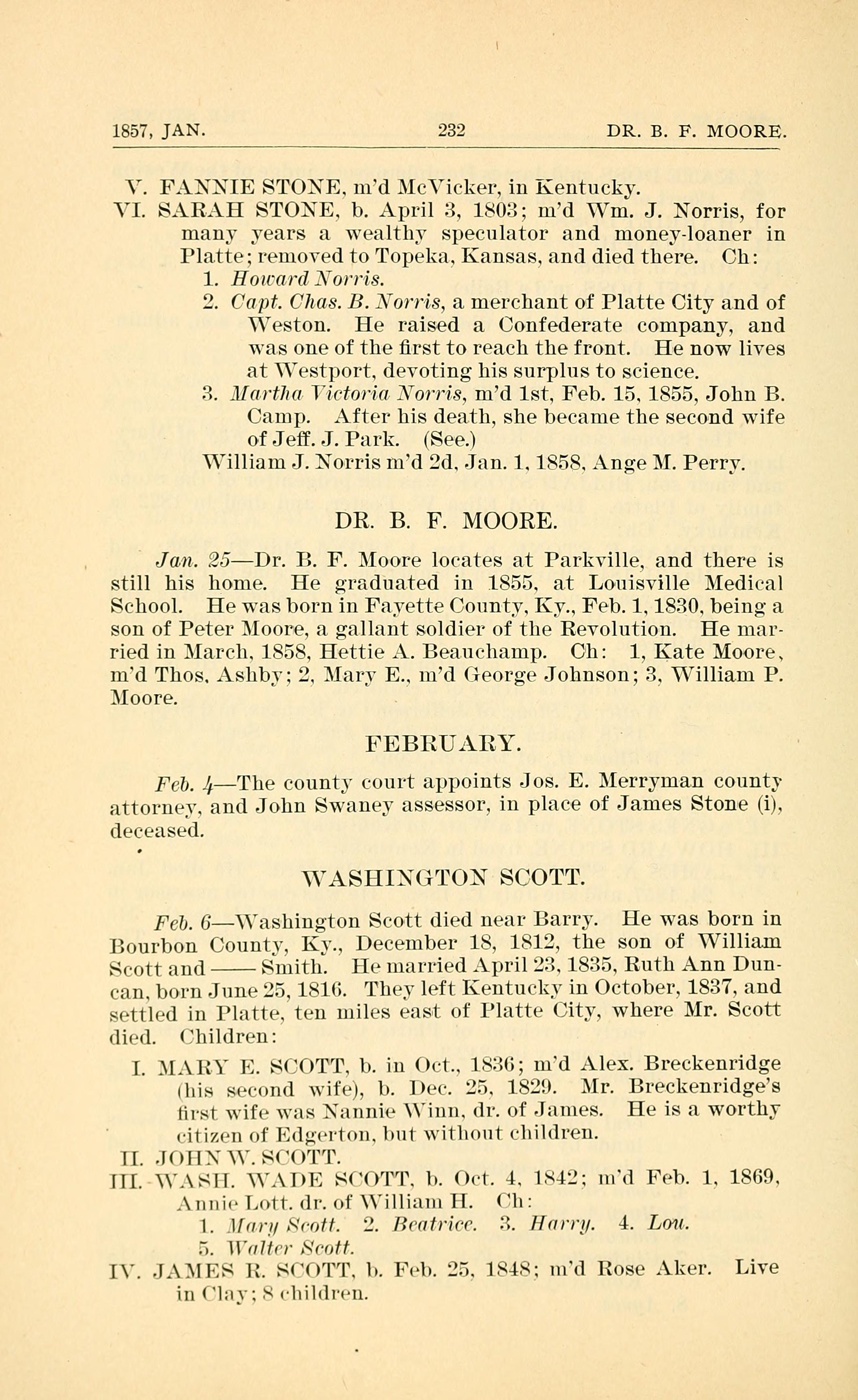 1857, JAN. 2322 DR. B. F. MOORE. V. FANNIE STONE, married McVicker, in Kentucky. VI. SARAH STONE. b. April 3, 1803; md Wm. J. Norris, for many years a wealthy speculator and money-loaner in Platte; removed to Topeka, Kansas, and died there. Children: 1. Howard Norris. 2. Capt. Chas. B. Norris, a merchant of Platte City and of Weston. He raised a Confederate company, and was one of the rst to reach the front. He now lives at Westport, devoting his surplus to science. 3. Martha Victoria Norris, md 1st, Feb. 15. 1855, John B. Camp. After his death, she became the second Wife of J eff. J. Park. (See) William J. Norris married second. Jan. 1. 1858. Ange M. Perry. DR. B. F. MOORE. Jam. 25Dr. B. F. Moore locates at Parkville, and there is still his home. He graduated in 1855. at Louisville Medical School. He was born in Fayette County. Ky., Feb. 1, 1830, being a son of Peter Moore, a gallant soldier of the Revolution. He married in March. 1858, Hettie A. Beauchamp. Children: 1, Kate Moore, md Thos. Ashby; 2, Mary E., md George Johnson; 3, William P. Moore. FEBRUARY. Feb. 4 The county court appoints Jos. E. Merryman county attorney. and John Swaney assessor, in place of James Stone (i), deceased. WASHINGTON SCOTT. Feb. 6 Washington Scott died near Barry. He was born in Bourbon County, KY, December 18, 1812, the son of William Scott and Smith. He married April 1835, Ruth Ann Duncan, born June 25, 1816. They left Kentucky in October, 1837, and settled in Platte, ten miles east of Platte City, where Mr. Scott died. Children: I. MARY E. SCOTT, b. in Oct., 1836; married Alex Breckenridge (his second wife), b. Dec. 25, 1829. Mr. Breckenridge's first wife was Nannie Winn, dr. of James. He is a worth citizen of Edgerton, but without children. II. JOHN W. SCOTT III. WASH. WADE SCOTT, b. Oct. 4, 1842; married Feb. 1, 1869, Annie Lott, dr. of William H. Lott. Children: 1. Mary Scott 2. Beatrice Scott 3. Harry Scott 4. Lou Scott 5. Walter Scott IV. JAMES R. SCOTT, b. Feb. 25, 1848; married Rose Aker. Live in Clay; 8 children.