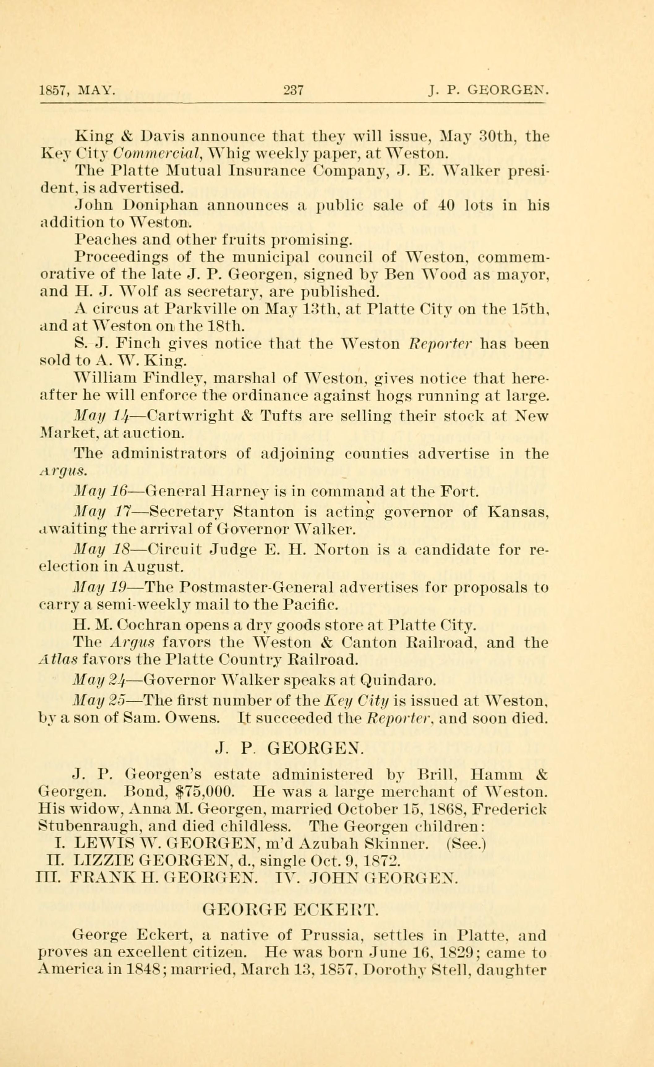 1857, MAY. 237 J. P. GEORGEN. King & Davis announce that they will issue, May 30th, the Key City Commcrcml, \hig weekly paper, at Weston. The Platte Mutual Insurance Coinpany, J. E. Valker presi- dent. is advertised. John Doniphan announces a. public sale of 40 lots in his addition to Weston. Peaches and other fruits promising. Proceedings of the municipal council of Weston. con11nem- orative of the late J. P. Georgen. signed by Ben \ood as I1lfl)0I. and II. J. Yolf as secretarv. are published. A circ11s at Parkville on May lfltli. a.t Platte City on the 15th. and at Weston on the 18th. S. J. Finch gives notice that the Weston Reporter has been sold to A. W. King. William Findley, marshal of Weston. gives notice that l1ere- after he will enforce the ordinance against hogs running at large. Ala}; ].lCartwright & Tufts are selling their stock at New Market. at auction. The administrators of adjoining counties advertise in the .~U(]ll8. Jlay 16Genera1 Harnev is in command at the Fort. Ma}; 17Secretarv Stanton is acting governor of Kansas, awaiting the arrival of Governor Walker. illay 18Circuit Judge E. H. Norton is a candidate for re- election in August. May 19The Postniaster-General advertises for proposals to carry a semi-Weekly mail to the Pacic. H. M. Cochran opens a drv goods store at Platte City. The Argzzs favors the Weston & Canton Railroad. and the A tlas favors the Platte Country Railroad. Mag; 2,Governor Va1ker speaks at Quinda.ro. May 25The rst number of the Key (ity is issued at Weston. by a son of Sam. Owens. It succeeded the Reporter. and soon died. J. P. GEORGEN. J. P. Geo-rgens estate administered by Brill. Hamm & Georgen. Bond, $75,000. He was a large lnercliant of \eston. His widow, Anna M. Georgen. married October 15. 1808. Frederick Stubenraugh, and died childless. The Georgen children: I. LEWIS W. GEORGEN, Ind Azubah Skinner. (See.l H. LIZZIE GEORGEN, d.. single Oct. 9. 1971.. III. FRANK H. (}EOR(i}E1. IV. JOHN (}EOI{.(iE.. GE()R(P}E ECKEI{l. George Eckert, a native of Prussia, settles in Platte. and proves an excellent citizen. He was born -June 10. 1829; came to America in 1848; married. March 13. 1857. l)orothy Stell. daughter