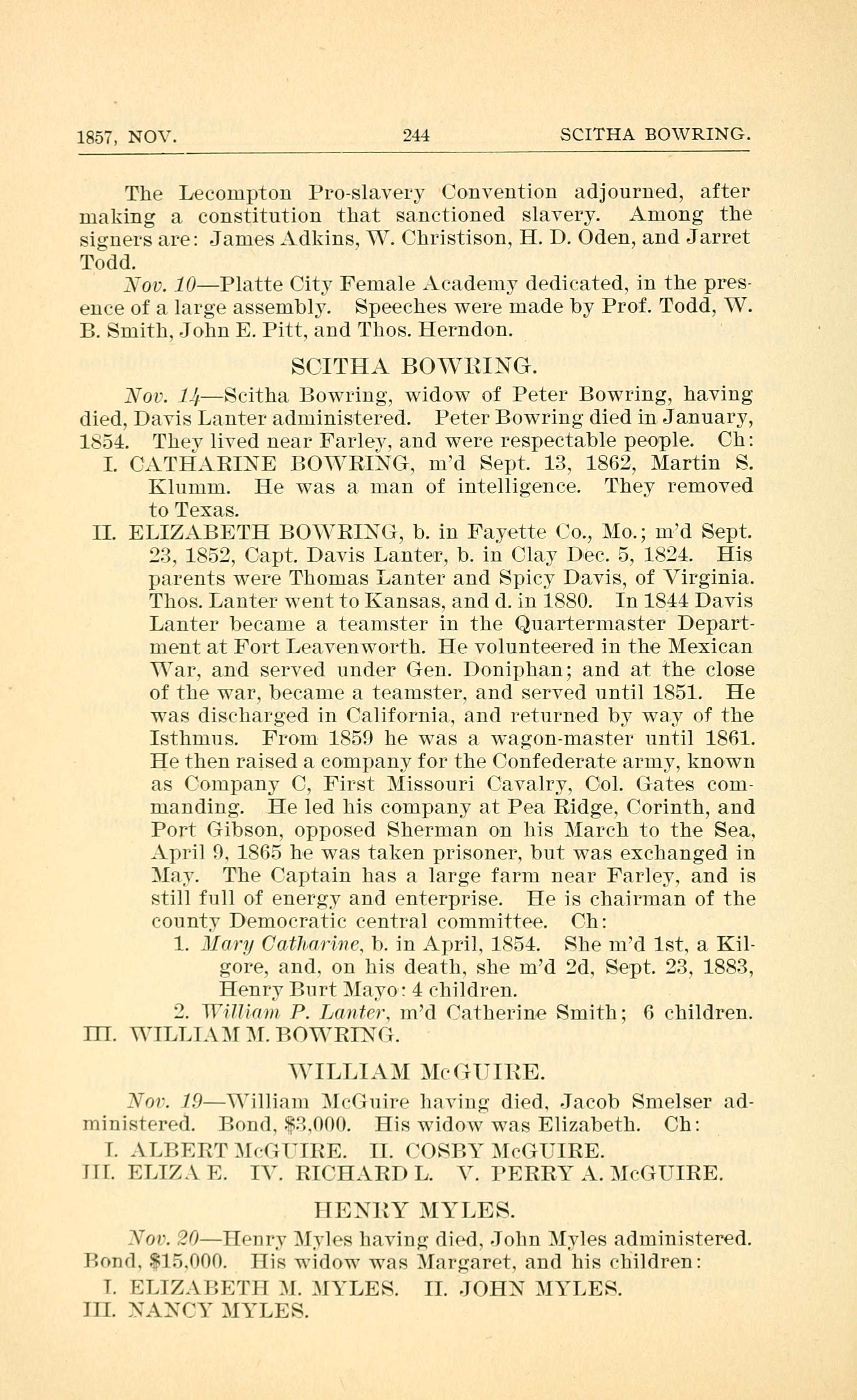 1857, NOV. 244 SCITI-IA BOWRING. The Lecompton Pro-slavery Convention adjourned, after making a constitution that sanctioned slavery. Among the signers are: James Adkins, XV. Christison, H. D. Oden, and Ja.rret Todd. Nor. 10Platte City Female Academy dedicated, in the pres- ence of a large assembly. Speeches were made by Prof. Todd, W. B. Smith, John E. Pitt, and Thos. Herndon. SC-ITHA BOWRING. Nov. 14Scitha Bowring, widow of Peter Bowring, having died, Davis Lanter administered. Peter Bowring died in January, 1854. They lived near Farley, and were respectable people. Children: I. CATHARINE BOXVRING, md Sept. 13, 1862, Martin S. Klumm. He was a man of intelligence. They removed to Texas. II. ELIZABETH BOVRING, b. in Fayette Co., 110.; md Sept. 23, 1852, Capt. Davis Lanter, b. in Clay Dec. 5, 182-1. His parents were Thomas Lanter and Spicy Davis, of Virginia. Thos. Lanter went to Kansas, and d. in 1880. In 1844 Davis Lanter became a teamster in the Quartermaster Depart- ment at Fort Leavenworth. He volunteered in the Mexican War, and served under Gen. Doniphan; and at the close of the war, became a teamster, and served until 1851. He was discharged in California, and returned by Way of the Isthmus. From 1859 he was a wagon-master until 1861. He then raised a company for the Confederate army, known as Company C, First Missouri Cavalry. Col. Gates com- manding. He led his company at Pea Ridge, Corinth, and Port Gibson, opposed Sherman on his March to the Sea. April 9, 1865 he was taken prisoner, but was exchanged in May. The Captain has a large farm near Farley, and is still full of energy and enterprise. He is chairman of the county Democratic central committee. Children: 1. J[my C(Il-II-(I7I~7I(, b. in April, 1854. She md 1st. a Kil- gore, and. on his death, she married second, Sept. 23, 1883, Henry Burt Mayo: 4 children. 2. William P. ,L(1nfnr. md Catherine Smith; 6 children. HI. WILLIAM M. P.()YRLG. \ILLIAM Mt-(}I"Il{E. Nor. 7.0\illiam .Ir(}11ire having died, Jacob Smelser ad- ministr-rt-d. Pmnd, $..0()0. His widow was Elizabeth. Children: I. .T.I.EI{lMt-GIII{E. II. (OSBY Mt-GUIRE. Ill. ELIZA E. IV. RICHARD L. V. PERRY A. .IcGUIRE. IIE.I{Y MYLES. Nor. 2fIIIcnry Myles having died. John Myles administered. Bond. $15,000. His widow was Margaret, and his children: T. ELI7..IlETH .l. MYLES. II. JOHN MYLES. III. NANCY MYLES.