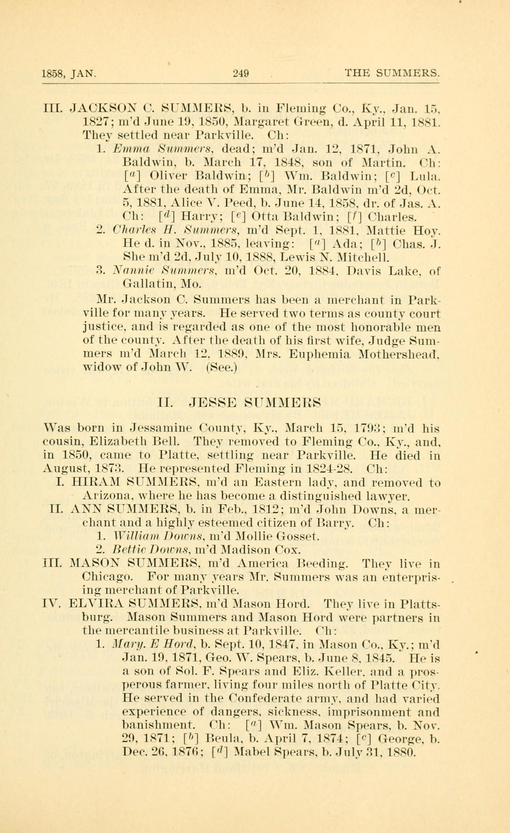1858, JAN. 249 THE SUMMERS III. JACKSON C. SUMMERS, married Margaret Green, settled near Parkville 1. Emma Summers, married John A. Baldwin [a] Oliver Baldwin [b] William Baldwin [c] Lula Baldwin After the death of Emma, Mr. Baldwin married second Alive V. Peed, dr. of Jas. A. Peed [d] Harry Baldwin [e] Otta Baldwin [f] Charles Baldwin 2. Charles H. Summers, married Mattie Roy [a] Ada Summers [b] Chas. J. Summers Mattie married second Lewis N. Mitchell 3. Nannie Summers, married Davis Lake, of Gallatin, Mo. Mr. Jackson C. Summers, Parkville merchant, county court justice married second Mrs. Euphemia Mothershead, widow of John W. Mothershead II. JESSE SUMMERS married Elizabeth Bell settled near Parkville I. HIRAM SUMMERS, married an Eastern lady II. ANN SUMMERS, married John Downs, merchant of Barry 1. William Downs, married Mollie Gosset 2. Bettie Downs, married Madison Cox III. MASON SUMMERS, married America Breeding, live in Chicago IV. ELVIRA SUMMERS, married Mason Hord, live in Plattsburg Mason Summers and Mason Hord were partners in the mercantile business at Parkville. 1. Mary E. Hord, married Geo. W. Spears, son of Sol. F. Spears and Elizabeth Keller, lived four miles north of Platte City Confederate Army [a] William Mason Spears [b] Beula Spears [c] George Spears [d] Mabel Spears