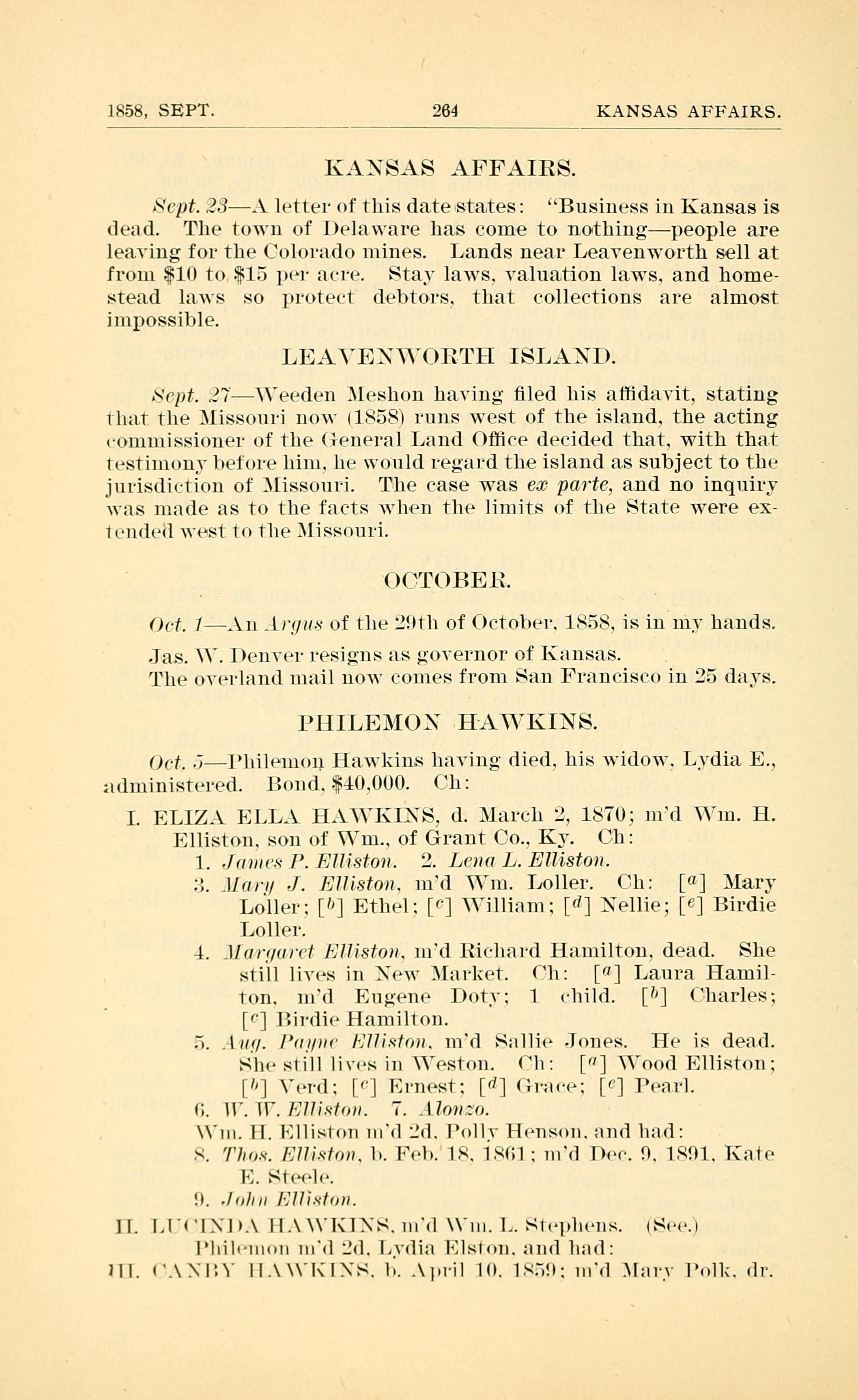 1858, SEPT. 264 KANSAS AFFAIRS. KANSAS AFFAIRS. Sept. 23 - A letter of this date states: Business in Kansas is dead. The town of Delaware has come to nothing-peop1e are leaving for the Colorado mines. Lands near Leavenworth sell at from $10 to $15 per acre. Stay laws. Valuation laws. and home- stead laws so protect debtors that collections are almost impossible. LEAVENWORTH ISLAND Sept. 27 - Weeden Meshon having led his affidavit, stating that the Missouri now (1858) runs west of the island, the acting commissioner of the General Land Office decided that. with that testimony before him. he would regard the island as subject to the jurisdiction of Missouri. The case was em parte, and no inquiry was made as to the facts when the limits of the State were ex- tended west to the Missouri. OCTOBER Oct. 1 - An Argus of the 29th of October, 1858, is in my hands. Jas. W. Denver resigns as governor Kansas. The overland mail now comes from San Francisco in 25 days. PHILEMON HAWKINS. Oct. 5 - Philemon Hawkins having died, his widow, Lydia E. Hawkins administered. Bond, $40,000. Children: I. ELIZA ELLA HAWKINS, d. March 2, 1870; married William H. Elliston, son of William, of Grant County, Ky. Children: 1. James P. Elliston 2. Lena L. Elliston 3. Mary J. Elliston, married William Loller. Children: [a] Mary Loller [b] Ethel Loller [c] William Loller [d] Nellie Loller [e] Birdie Loller 4. Margaret Elliston, married Richard Hamilton, dead. She still lives in New Market. Children: [a] Laura Hamilton, married Eugene Doty; 1 child. [b] Charles Hamilton [c] Birdie Hamilton 5. Aug. Payne Elliston, married Sallie Jones. He is dead. She still lives in Weston. Children: [a] Wood Elliston [b] Verd Elliston [c] Ernest Elliston [d] Grace Elliston [e] Pearl Elliston 6. W. W. Elliston 7. Alonzo Elliston William H. Elliston married second, Polly Henson and had: 8. Thos. Elliston, b. Feb 18, 1861; married Dec. 9, 1891, Kate E. Steele. 9. John Elliston II. LUCINDA HAWKINS, married William L. Stephens Philemon married 2nd, Lydia Elston and had: III. CANBY HAWKINS, b. April 10, 1859, married Mary Polk, dr.