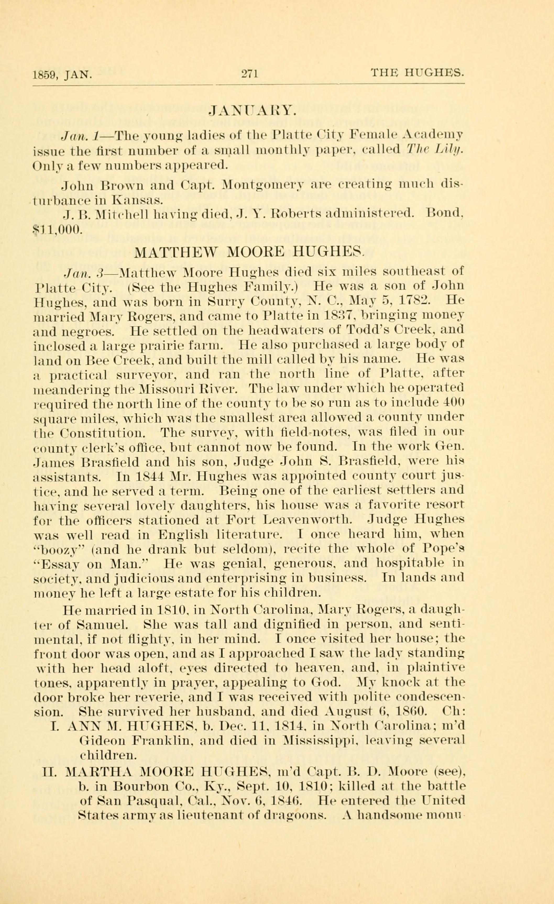 1859, JAN. 271 THE HUGHES JANUARY Jan. 1 - Platte City Female Academy The Lily John Brown and Capt. Montgomery J. B. Mitchell having died J. Y. Roberts MATTHEW MOORE HUGHES Jan. 3 - Matthew Moore Hughes died six miles southeast of Platte City. John Hughes Mary Rogers Samuel Rogers Todd's Creek Bee Creek Mill Gen. James Brasfield Judge John S. Brasfield County Court Justice I. ANN M. HUGHES Gideon Franklin II. MARTHA MOORE HUGHES Capt. B. D. Moore