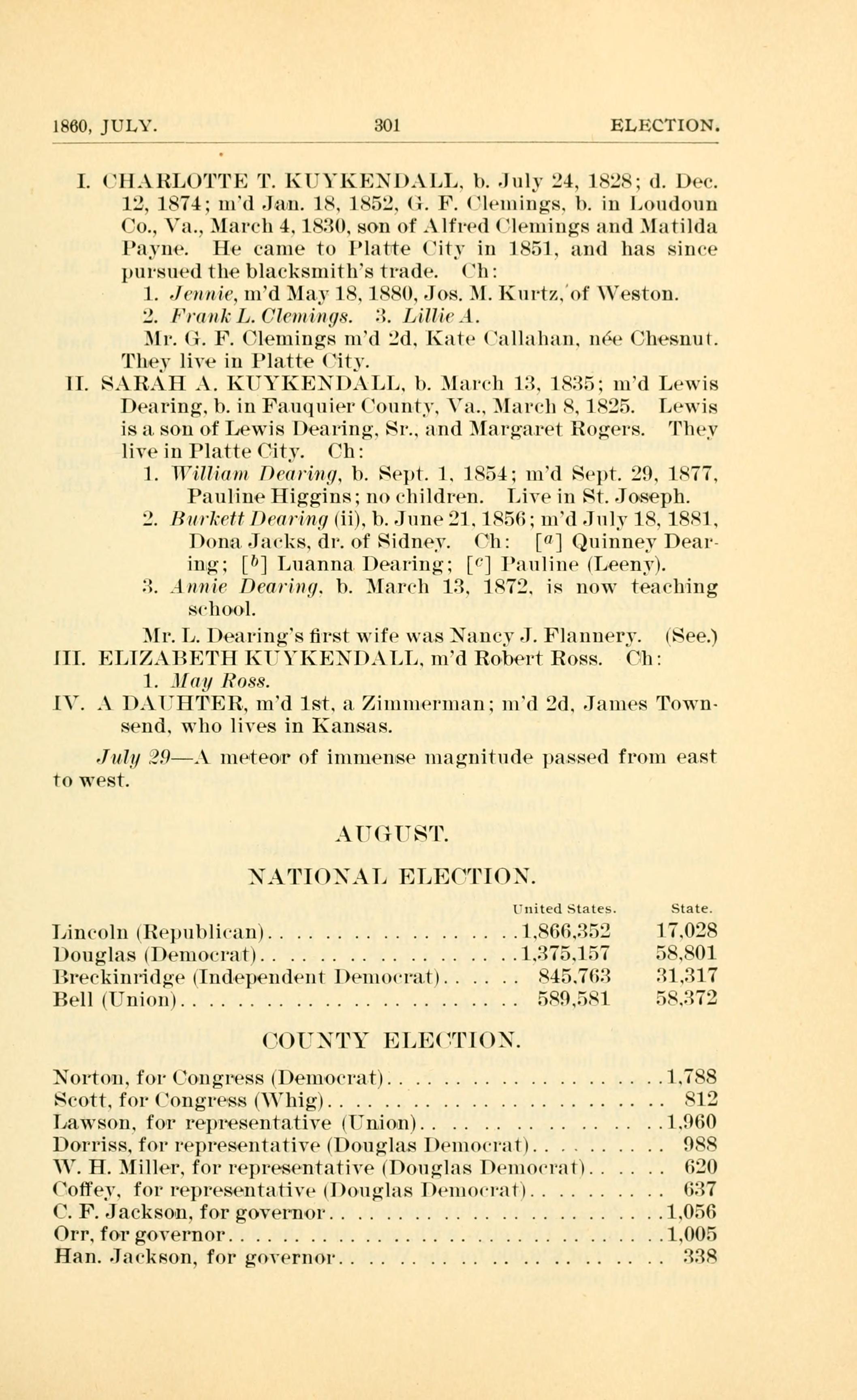1860, JULY. 301 ELECTION. I. (H.RrLUl"ll. T. l{UYl{ENI).l.L. ll. July 24, l.:..; d. l)-3. 123, 187-1; 1nd Jain. 18. 1852. (I. F. Plemings. l). in Loudoun C0,. Va., .1arcl1 4. 1830. son of Alfred (lemings and Matilda lavne. He canie to Platte (itv in 1851. and has sinee pursued the blac-ksniitlfs trade. (l1: 1. .lemne, n1d Ma.v 18. 1880, Jos. .I. Iiurtzjnf Westoli. 2. Frank L. (7I(nung.s. 2%. Lillie -1. 311. H. F. (./lemings married second. Kate (allal1an. nee (jhesnut. lliev live i11 Platte (itv. ll. SARAH .. KUYKEIl).LL, l). .Iar-11 13. 1835; 1nd Lewis Dearing. b. in Fauquier (0nnt,v. Va.. :l&ll(,l] R, 1825. Lewis is :1. son of Lewis I)earin;.;. Sr.. and Ma rgzaret Rogzers. llie,v live in Platte City. (ht 1. Wrillimn De(Iri7Ig/, b. Sept. 1. 1854; 1n(l Sept. 29. 1877. Pauline Higgins; no -liildren. Live in St. Joseph. L. I)mI.(tt Deari71(/ (ii). 1). June 2]. 1956; 1nd July 18. 18H]. Du11a.Jarl;s. dr. of Sidney. (hi [0] Quinnev Dear- illlg: [5] Lnanna.Dea1i11g; [v] Pauline (Leenyl. 3. A mzie Dearing. b. Ilarrl1 13. 1972. is now teaching S(l10()l. Mr. L. De21rings first wife was Nancy J. Fla lll](I). (See) III. ELIZ.~BElH KlYKE.I). LL. n1d Robert Ross. (iliz 1. Jlay Ross. IV. . D.lHTER., md 1st. :1. Zinnnerinan; married second. James Town- send. who lives in Kallsas. .7111}; .3.0. I11PlE"0I of immense inagnitnde passed from east to west. A IN lrl7Sl. .AlI().AL ELE("lIO.. Fnited States. State. Lincoln 1Rep111)li-mi). . . . . . . . . . . . . . . . . .1.R6G.35:3 17.028 Douglas (Den10:ratl. . . . . . . . . . . . . . . . . 1.375.157 58.801 liret-ki11ridg,e llndependeiit l)e11nwra.t). . . . . . 845.763 31.317 Bell (Unimn.. .. .. .. .. .. .. .. .. .. .. .. 599,581, 5..3T:3 (}()INlY ELE(-ll(i).. N01to~n. fur Congress (I,)en1~0~(-rat). . . . . . . . . . . . . . . . . . . .l.7S8 Scott. for (o11gre-ss (\l1igi).. .. .. .. .. .. . . .. .. .. .. .. R12 Lawson, for 1ep1~esenta.tiVe 1l711i0n). . . . . . . . . . . . . . . .1.fl60 Dorriss, for representative thougzlas I)en1m-mt). . . . . . . . . . 088 V. H. Miller. for representative (D011glas l)e1n0-rail. . . . . . 620 (0tfe.v. for representative (I)0~11glas I)e1nm-rzm. . . . . . . . . . (337 C. F. Jackson, for governor. . .. .. .. .. .. .. .. .. .. .. ..1.056 Orr.f01-governmn. .. .. .. .. .. .. .. .. .. .. .. .. .. .. ..1.005 Han. Jar-kson, for gnvernmu. .. .. .. .. .. .. .. .. .. .. 338