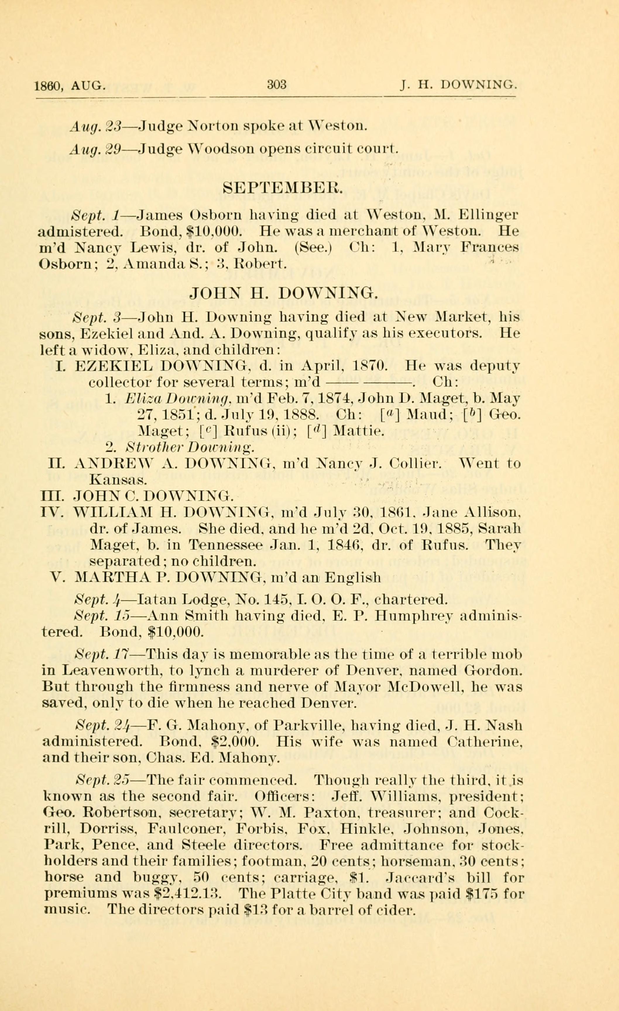1860, AUG. 303 J. H. nowsmo. A/lt(]. .2.3-Jtidgc Norton spoke at \eston. Aug. 9J11dge Voo(lson opens circuit court. SEPTEMBE R. Sept. 1 Jzunes Osborn hztving died at \eston. .l. Ellinger admistered. Bo11d,tF10.000. He was :1 n1er(:ha~n~tof Weston. He md Nancy Lewis. dr. of John. (Seer Children: 1. .l:1r 1ru.nces Osborn: :3..I11;u1(l:iS.: 3. Robert. " JOHN H. DOWNING. Sept. J-John H. Downing having died at New Market, his sons, Ezekiel and And. A. Downing, qualif as his executors. He left :1 widow. Eliza. and children: I. EZEKIEL DOWNING. d. in April. 1.970. He was dep11tv collector for several terms; md . Children: 1. 1~.li.:a l)ozrmtn[/. md Feb. 7. 1874. John 1). Maget. b. Hay 27, 1.851;d.-I11ly1.0.1888. Children: [um] ll:111d; [0] Greo. Mzlget: [F] Rufus (ii); [1] Mattie. 2. StrotlrerD0umng. II. ..DRE\ .. I)()VN[. }. md .:1n(-y J. Collier. Vent to Kallsas. A III. JOHN C. DOWNING. IV. WILLIAM H. I)C)\NI.(}, 1nd .1111) 30. 1.961. -lune Allison. dr. of James. She died. and he married second. Oct. 10. 1885. Sarah Maget. b. in Tenn-essee Jan. 1. 1840, dr. of Rufus. The) separated; no children. V. MAR1HA P. DOWNING. 1nd an English Sept. .9Iatan Lodge. No. 145. I. O. 0. F., cllartered. Sept. 1.3Ann Smith llaving died. E. I. Humpllrey adminis- tered. Bond. $10,000. Sept. ]7This day is meinorable as the time of :1 terrible mob in Leavenworth. to lynch a murderer of Denver. named (rordon. But through tl1e rmness and nerve of .Iao~1 McDowell. he was saved, only to die when he reached Denver. Sept. .24F. G. )I:1l1onv. of Pfl.1l{Vl11P. h:1ing died, J. H. Nash administered. Bond. $2.000. His wife was named (t:1tlu-rine. and their son. Chas. Ed. Maliony. Scpt..25Tl1efz1ircomment-ed. lhou;:h really the third. it is known as the second fair. ()tce~rs: Jeff. Willian1s. president; Geo. Robertson. secretarv; W. )1. Paxton. treasurer: and Cock- rill, Dorriss. F:u1lco~ner. Forbis. Fox. Hinkle. Johnson. Jones. P:1.rk, Pence. and Steele directors. Free admittance for stock- holders and their families; footman. 20 cents: horseinaln, 30 cents: horse and buggv. 50 cents; carriage. $1. Jm-t-m-ls bill for premiums was $2.412.lfl. The Platte City bzmd w.1.sp:1id $175 for music. The directors paid $13 for :1. barrel of cider.