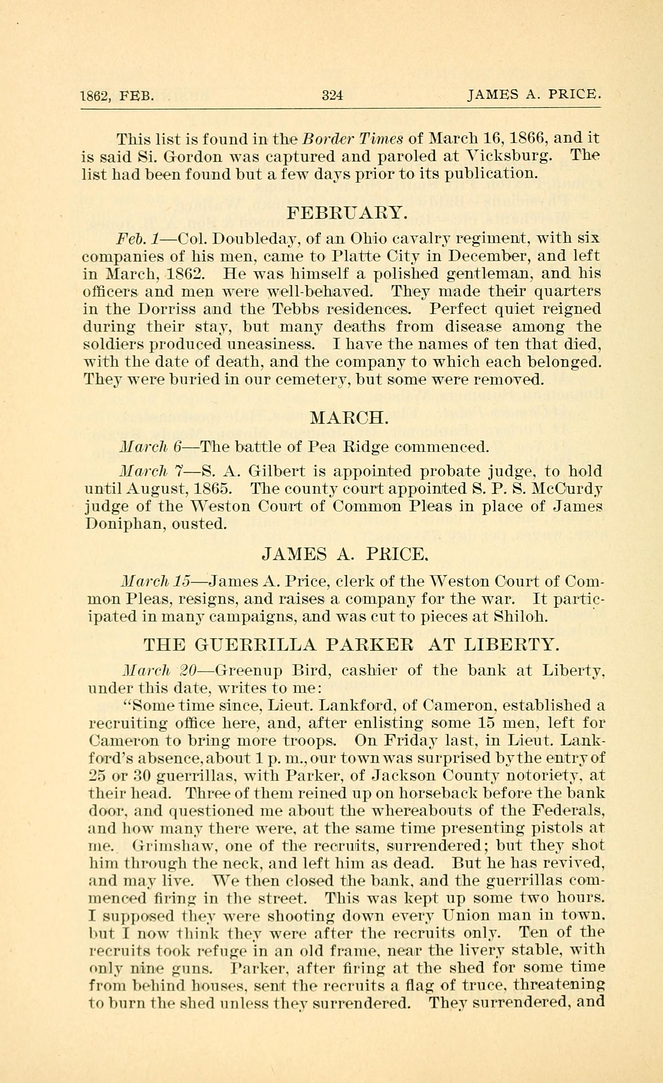 1862, FEB. 324 JAMES A. PRICE. This list is found in the Border Times of March 16, 1866, and it is said Si. Gordon was captured and paroled at Vicksburg. The list had been found but a few days prior to its publication. FEBRUARY. Feb. 1Col. Doubleday. of an Ohio cavalry regiment, with six companies of his men, came to Platte City in December, and left in March, 1862. He was himself a polished gentleman, and his ofcers and men were wellbehaved. They made their quarters in the Dorriss and the Tebbs residences. Perfect quiet reigned during their stay, but many deaths from disease among the soldiers produced uneasiness. I have the names of ten that died, with the date of death, and the company to which each belonged. They were buried in our cemetery, but some were removed. MARCH. J10-rch 6The battle of Pea Ridge cominenc-ed. JI arc-71 7S. A. Gilbert is appointed probate judge. to hold until August, 1865. The county court appointed S. P. S. McCurdy judge of the Weston Court of Coinmotn Pleas in place of James Doniphan, ousted. JAMES A. PRICE. J1 arch 15James A. Price, clerk of the Weston Court of Com- mon Pleas, resigns, a.nd raises a company for the War. It partic- ipated in many campaigns, and Was cut to pieces a.t Shiloh. THE GUERRILLA PARKER AT LIBERTY. .l[u(-h .20Greenup Bird, cashier of the bank at Liberty, under this date, writes to me: Some time since. Lieut. Lankford. of Cameron. established a recruiting office here, and, after enlisting some 15 men, left for Cainei-on to bring more troops. On Friday last. in Lieut. Lank- foi-ds absence. about 1 p. m.. our town was surprised bythe entry of or 30 guerrillas. with Parker. of Jackson County notoriety. a.t their head. Three of them reined up on horseback before the bank door. and questioned me about the whereabouts of the Federals, and how many there were. at the same time presenting pistols at me. (illIl1Sll{lW., one of the recruits. surrendered; but they shot him through the neck, and left him as dead. But he has revived, and may live. We then closed the bank. and the guerrillas com- meneed ring in the street. This was kept up some two hours. I supposed they were shooting down every Union man in town. but I now think they were after the recruits only. Ten of the recruits took refuge in an old frame. near the livery stable, with only nine guns. Parker. after ring at the shed for so-me time from behind houses. sent the recruits a ag of truce. threatening to burn the shed unless they surrendered. They surrendered, and
