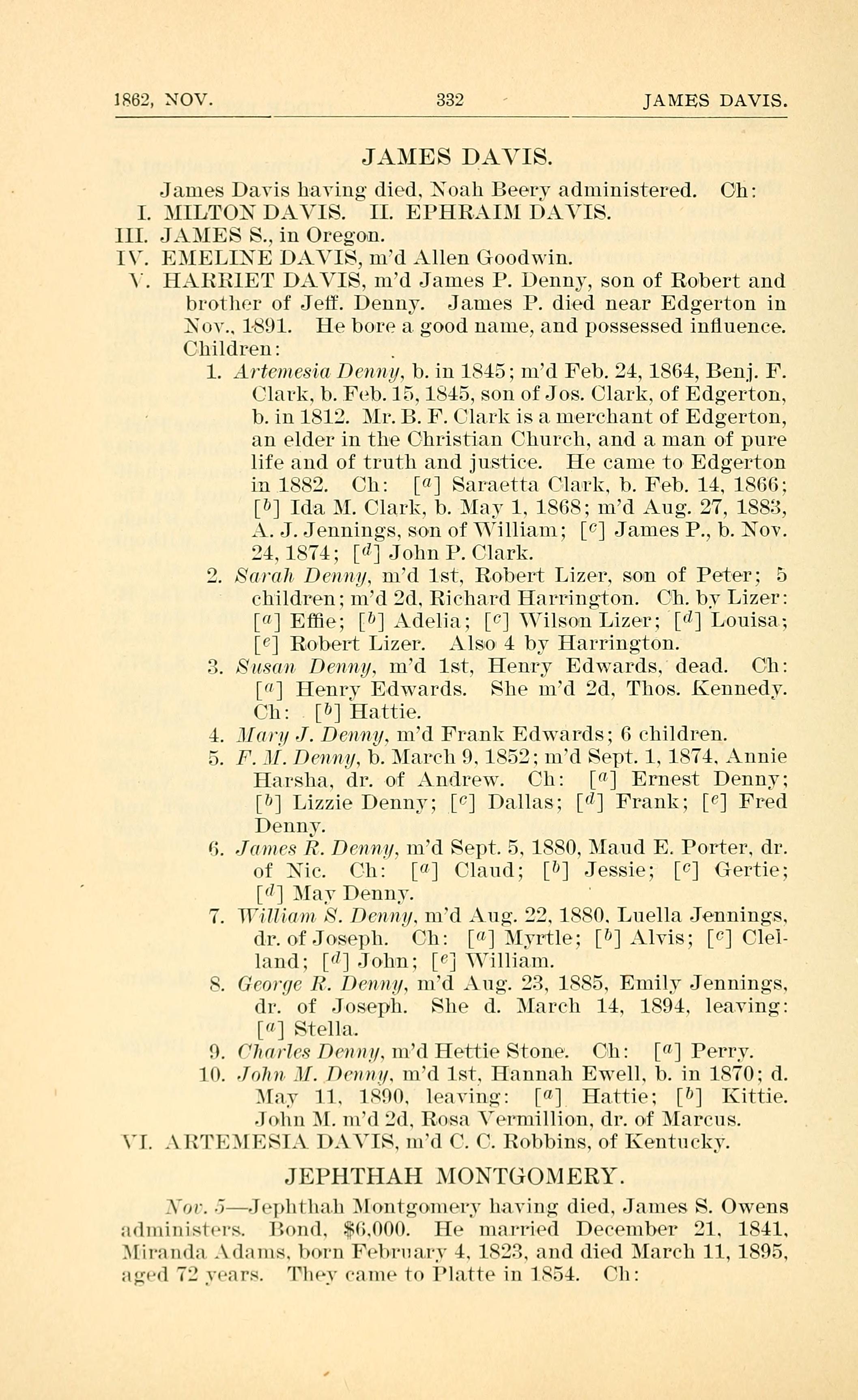 1862, NOV. 332 JAMES DAVIS. JAMES DAVIS. James Davis having died, Noah Beery administered. Children: I. MILTON DAVIS II. EPHRAIM DAVIS III. JAMES S. DAVIS, in Oregon. IV. EMELINE DAVIS, married Allen Goodwin V. HARRIET DAVIS, married James P. Denny, son of Robert and brother of Jeff. Denny. James P. died near Edgerton in Nov. 1891. He bore a good name, and possessed influence. Children: 1. Artemesia Denny, b. in 1845; married Feb. 24, 1864, Benj. F. Clark, b. Feb. 15, 1845, son of Jos. Clark, of Edgerton, an elder in the Christian Church, and a man of pure life and of truth and justice. He came to Edgerton in 1882. Children: [a] Saraetta Clark, b. Feb. 14, 1866 [b] Ida M. Clark, b. May 1, 1868, married Aug. 27, 1883, A. J. Jennings, son of William; [c] James P. Clark, b. Nov. 24, 1874 [d] John P. Clark 2. Sarah Denny, married 1st, Robert Lizer, son of Peter; 5 children; married 2nd, Richard Harrington. Children by Lizer: [a] Effie Lizer [b] Adelia Lizer [c] Wilson Lizer [d] Louisa Lizer [e] Robert Lizer Also 4 by Harrington. 3. Susan Denny, married 1st, Henry Edwards, dead. Children: [a] Henry Edwards She married second, Thos. Kennedy. Children: [b] Hattie Kennedy 4. Mary J. Denny, married Frank Edwards; 6 children 5. F. M. Denny, b. March 9, 1852; married Sept. 1, 1874, Annie Harsha, dr. of Andrew. Children: [a] Ernest Denny [b] Lizzie Denny [c] Dallas Denny [d] Frank Denny [e] Fred Denny 6. James R. Denny, married Sept. 5, 1880, Maud E. Porter, daughter of Nic. Porter. Children: [a] Claud Denny [b] Jesse Denny [c] Gertie Denny [d] May Denny 7. William S. Denny, married Aug. 22, 1880, Luella Jennings, daughter of Joseph Jennings. Children: [a] Myrtle Denny [b] Alvis Denny [c] Cleland Denny [d] John Denny [e] William Denny 8. George R. Denny, married Aug. 23, 1885, Emily Jennings, daughter of Joseph Jennings. She d. March 14, 1894, leaving [a] Stella Denny 9. Charles Denny, married Hettie Stone. Children: [a] Perry Denny 10. John M. Denny, married 1st Hannah Ewell, b. in 1870; d. May 11, 1890, leaving [a] Hattie Denny [b] Kittie Denny John M. married second, Rosa Vermillion, daughter of Marcus Vermillion. VI. ARTEMESIA DAVIS, married C. C. Robbins of Kentucky. JEPHTHAH MONTGOMERY Nov. 5 - Jephthah Montgomery having died, James S. Owens administers. Bond, $6,000. He married December 21, 1841, Miranda Adams, born February 4, 1823, and died March 11, 1895, aged 72 years. They came to Platte in 1854. Children:
