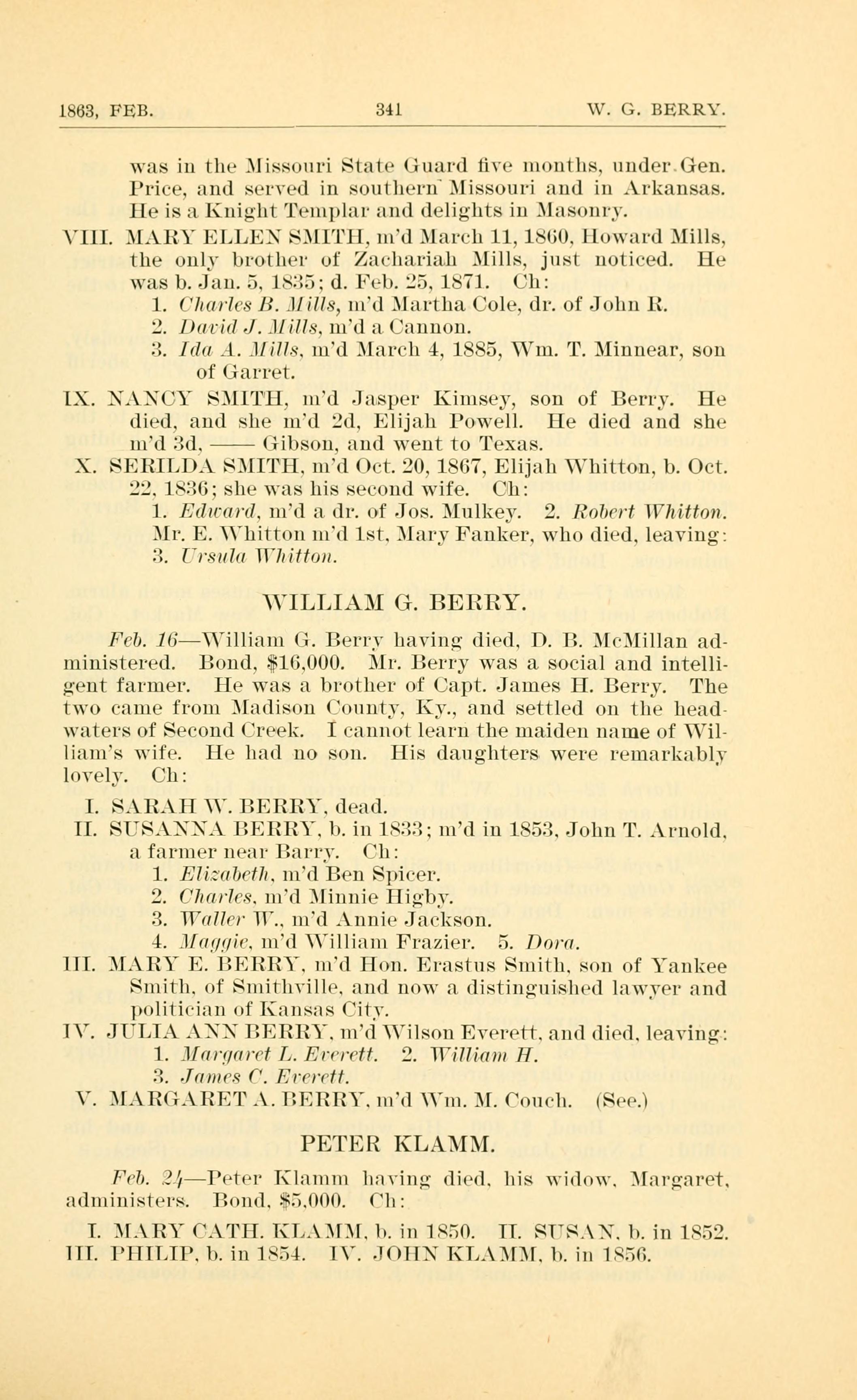 1863, FEB. 341 V. G. BERRY. was in the .lissoll1i State Guard re months. nndei-.Gen. Price, and served in southern Missouri and in Arkansas. He is a Knight Teinplar and delights in Masom-. VIII. MARY ELLEN SMI1H. n1d March 11, 1861). Howard Mills. the only brother of V/Al(,ll2l.1lil.l1 Mills, just noticed. He was b. -Jan. 5. 18215: d. Feb. 1571. Children: 1. (IzarIc.s- B. Jlills, 1nd Martha Cole. dr. of John R. 2. I)(lll(I J. Jlills. n1d a Cannon. 3. [da .1. Jlills. 1nd March 4. 1885, W1n. T. Minnear, son of Garret. IX. NAXUY SMITH, 1nd Jasper Kinisey, son of Berry. He died, and she 1nd .d. E1ija.l1 Powell. He died and she n1d 3d. Gibson. and went to Texas. X. SERILDA SMITH. 1nd Oct. 20, 1867, Elijah Vhitto~n. 1). Oct. 2;. 1836; she was his second wife. Children: 1. Eduwrd. n1d a dr. of Jos. Mnlkey. 2. Iohmt Whitton. Mr. E. \hitton 1n4l 1st. Mary Fanker. who died. leaving: 3. IrSuI(( UIIiffon. WILLIAM G. BERRY. Fob. 16Villia1n G. BerrV having: (lied. D. R. Mt-Millan ad- ininistered. Bond, $516,000. Mr. Berry was a social and intelli- gelit farmer. He was a brother of Capt. James H. Berry. The two came from Madison County. I{).. a11d settled on the head- waters of Second Creek. I cannot lear11 the maiden name of Wi1- liams wife. He had no son. His dangliters were lLl11Il{:ll)lV lovely. Children: I. SARAH \. BERRY. dead. II. SUSAl.A BERRY. 1). iii 1CI.~}; 1nd in 1853. John I. Arnold. a farmer near Rarr. Children: 1. EIi.:r1be1. md Ben Spicer. 2. CImrIc.e. n1d Minnie IIi;:b. 3. Waller UK. 1nd Annie Jackson. 4. J[a/(/ir. 1nd Villia1n Frazier. Dora. llI. MARY E. BERRY. 1nd Hon. Erastus Sinith. son of Yankee Sinith. of [1nitlnille. and now a (listilignislied lawyer and pOli1i(iI1 of Kansas Cit. IV. JULIA A .. BERRY. n1d Vilson Everett. and died. leaving: 1. .l[((r/ru(f L. Errreff. 2. Willimu H. 3. James F. Erereff. V. MARGARET A. RERRY. md \m. M. (o11(h. (See) PETER KLAMM. Feb. 2,5Ieter Klamm lmving: died. his widow. Margaret. adniiiiisters. Ro11(l.3iFe.000. (h: T. MA RY CATH. KLAMM, 1). in 1.950. II. SVR.T. l. in 1.952. lII. PHILIP. 1). in 1854. l. JOHN KLA MM. 1). in 1956.
