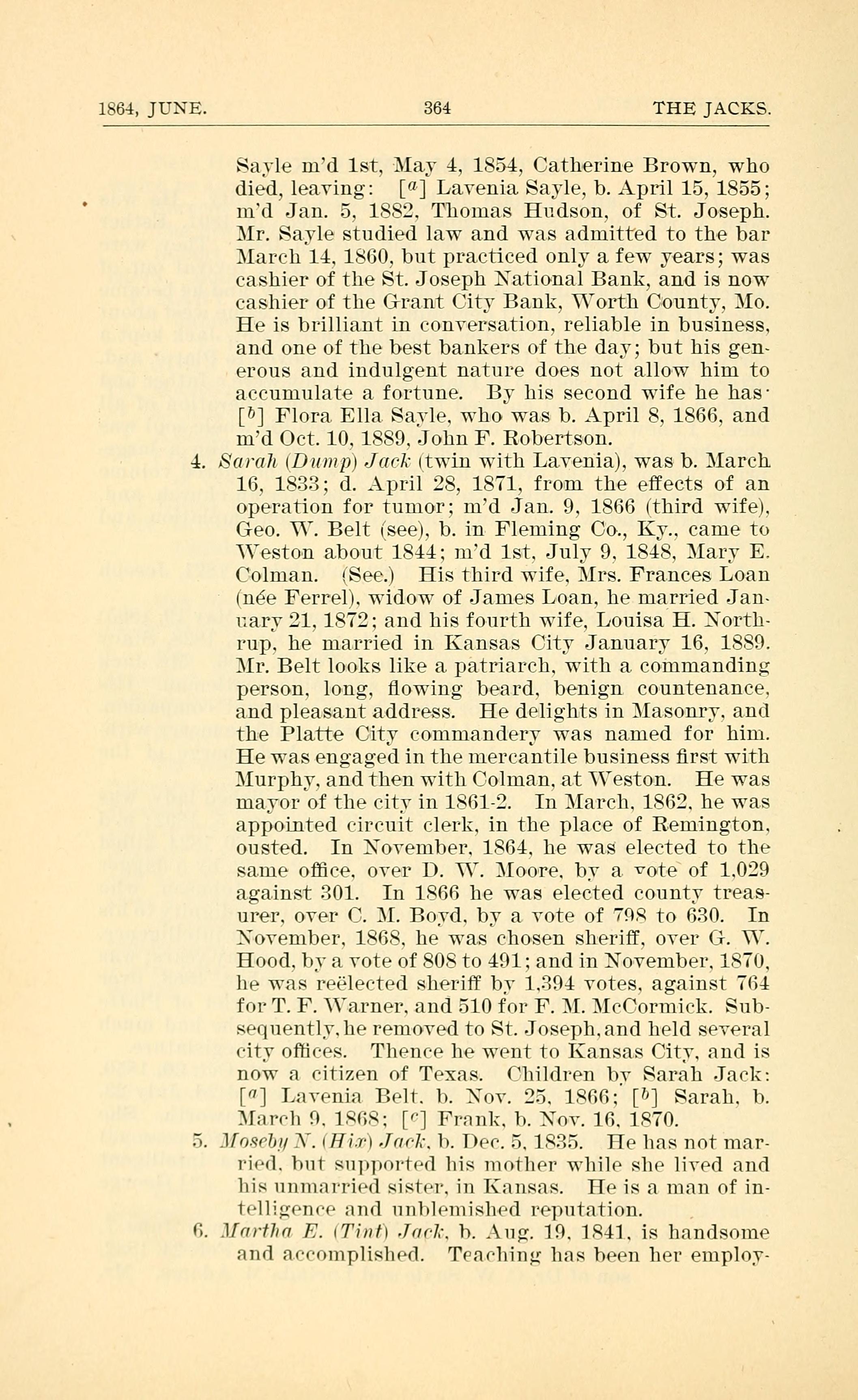 1864, JUNE. 364 THE JACKS. Sayle md 1st, May 4, 1854, Catherine Brown, who died, leaving: [1] Layenia Sayle, b. April 15, 1855; md Jan. 5, 1882. Thomas Hudson, of St. Joseph. Mr. Sayle studied law a.nd was admitted to the bar March 14. 1860, but practiced only a few years; was cashier of the St. Joseph National Bank, and is now cashier of the Grant City Bank, Worth County, Mo. He is brilliant in conversation, reliable in business, and one of the best bankers of the day; but his gen- erous and indulgent nature does not allow him to accumulate a fortune. By his second wife he has [1] Flora. Ella. Sayle. who was b. April 8, 1866, and md Oct. 10, 1889. John F. Robertson. -1. Sarah (Dump) J ac}: (twin with Layenia), was b. March 5. .l/o.9ebu . Him-) JnrI.. li. Dee. 1825. 16, 1833; d. April 28, 1871, from the effects of an operation for tumor; md Jan. 9, 1866 (third wife), Geo. IV. Belt (see), b. in Fleming Co., Ky.. came to Weston about 1844.; md 1st, July 9, 1848. Mary E. Colman. (See.) His third wife. Mrs. Frances Loan (nee Ferrel). widow of James Loan, he married Jan- uary 21, 1872; and his fourth wife, Louisa H. North- rup. he married in Kansas City January 16, 1889. Mr. Belt looks like a patriarch. with a commanding person, long, owing beard, benign countenance. and pleasa.nt address. He delights in Masonry. and the Platte City commandery was named for him. He was engaged in the mercantile business rst with Murphy, and then with Colman, at Weston. He was mayor of the city in 1861-2. In March. 1862. he was appointed circuit clerk, in the place of Remington. ousted. In November. 1864. he was elected to the same oice. over D. IV. ;Ioo-re. by a. vote of 1.029 against 301. In 1866 he was elected county treas- urer. oyer C. M. Boyd. by a yote of 798 to 630. In November. 1868. he was chosen sheri, oyer G. W. Hood. by a vote of 808 to 491; and in November, 1870, he was reelected sheriff by 1.394 votes. against 764 for T. F. \arner. and 510 for F. M. 1IcCorn1ick. Sub- sequently. he removed to St. Joseph.and held seyeral vii) oices. Tlience he went to Kansas City. and is now a citizen of Texas. Children by Sarah Jack: ["] Layenia Belt. b. Nov. 25. 1866; [1] Sarah. 1). 3l:lrrlI 9. 1868: ["] Frank. b. Nov. 16. 1870. He has not mar- ried. but supported his motlier while she lived and his uiiniarried sister. in Kansas. He is a man of in- Tvll;r(Il(P and unblemished reputation. 6. .l[rn-m F. 17inIl Jar-Ir. b. Aug. 19. 1841. is handsome and f1((0l]lpllS1lP(l. TPl(lllll.{ has been her employ-