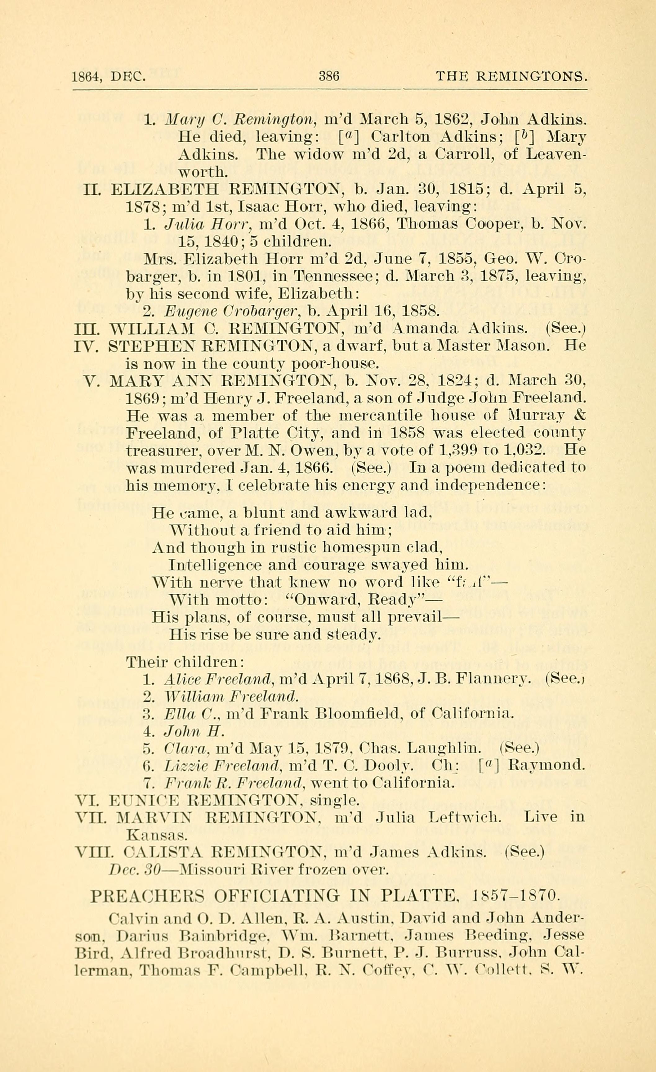 1864, DEC. 386 THE REMINGTONS. 1. J1 (my 0. Remington, md March 5, 1862, John Adkins. He died, leaving: [ft] Carlton Adkins; [5] Mary Adkins. The widow married second, a. Carroll, of Leaven- worth. II. ELIZABETH REMINGTON, b. Jan. 30, 1815; d. April 5, 1878; 1nd 1st, Isaac Horr, who died, leaving: 1. Jvuliya Hon, md Oct. 4, 1866, Thomas Cooper, b. Nov. 15, 1840; 5 children. lIrs. Elizabeth Horr married second, June 7, 1855, Geo. XV. Gro- barger, b. in 1801, in Tennessee; d. March 3, 1875, leaving, by his second wife, Elizabeth: 2. Eugene Cr0ba4ge~r, b. April 16, 1858. III. WILLIAM O. REMINGTON, md Amanda. Adkins. (See) IV. STEPHEN REMINGTON, a dwarf, but a Master Mason. He is now in the county poorhouse. V. MARY ANN REMINGTON, b. Nov. 28, 1821; d. March 30, 1869; md Henry J. Freeland, a son of Judge John Freeland. He was a member of the mercantile house of IIurrav & Freeland, of Platte City, and in 1858 was elected county treasurer. over M. N. Owen, by a vote of 1.399 to 1,032. He was murdered Jan. 4, 1866. (See) In a poem dedicated to his memo-r,v. I celebrate his energy and independence: He came, a blunt and awkward lad. Without a. friend to aid him; And though in rustic homespun clad. Intelligence and courage swayed him. With nerve that knew no word like fr il- With motto: Onward. Ready His plans, of course, must all prevail His rise be sure and steady. Their children: 1. Alice Freeland, married April 7, 1868, J. B. Flannery. (see) 2. William Freeland 3. Ella C. Freeland, married Frank Bloomfield, of California 4. John H. Freeland 5. Clara Freeland, married May 15, 1879, Chas. Laughlin (see) 6. Lizzie Freeland, married T. C. Dooly Children: Raymond Dooly 7. Frank R. Freeland, went to California VI. EUNICE REMINGTON, single VII. MARVIN REMINGTON, married Julia Leftwich. Live in Kansas. VIII. CALISTA REMINGTON, married James Adkins (see) Dec. 30 - Missouri River frozen over. PREACHERS OFFICIATING IN PLATTE 1857 - 1870 Calvin and O. D. Allen R. A. Austin David and John Anderson Darius Bainbridge William Barnett James Beeding Jesse Bird Alfred Broadhurst D. S. Burnett P. J. Burrus John Callerman Thomas F. Campbell R. N. Coffey C. W. Collett