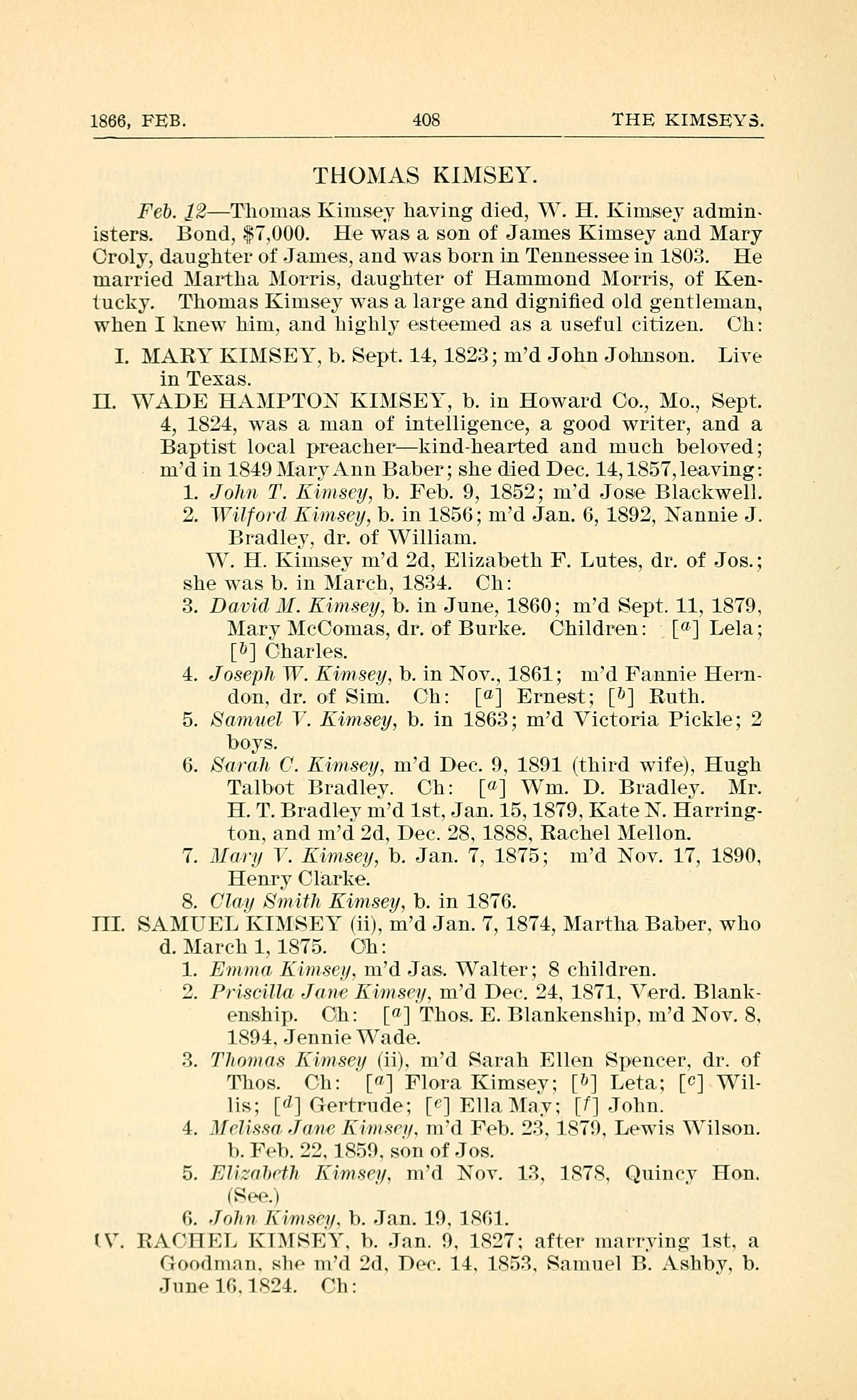 1866, FEB. 408 THE KIMSEYS. THOMAS KIMSEY. Feb. 12Tl1o1nas Kimsey having died, W. H. Kinmsey admin~ isters. Bond, $57,000. He was a son of James Kimsey and Mary Croly, daughter of James, and was born in Tennessee in 1803. He married Martha Morris, daughter of Hammond Morris, of K-en- tucky. Thomas Kimsey was a large and dignied old gentleman, when I knew him, a.nd highly esteemed as a useful citizen. Children: I. MARY KIMSEY, b. Sept. 14, 1823; md John Johnson. Live in Texas. I1. WADE HAMPTON KIMSEY, b. in Howard C0,, Mo., Sept. 4, 1824, was a man of intelligence, a good Writer, and a Baptist loca.l preacherkind-hearted and much beloved; md in 1849 Mary Ann Baber; she died Dec. 14,1857,leaving: 1. John T. K12".-msey, b. Feb. 9, 1852; md Jose Blackwell. 2. Wilford Kiinsey, b. in 1856; md Jan. 6, 1892, Nannie J. Bradley, dr. of Wil1ia.m. V. H. Kimsey married second, Elizabeth F. Lutes, dr. of Jos.; she was b. in March, 1834. Children: 3. David M. K/imsey, b. in June, 1860; md Sept. 11, 1879, Mary McComas, dr. of Burke. Children: [0] Lela; [17] Charles. 4. Joseph W. K/imsey, b. in Nov., 1861; md Fannie Hern- don, dr. o-f Sim. Children: [(1] Ernest; [11] Ruth. 5. Samuel T. Kimsey, b. in 1863; md Victoria Pickle; 2 bo-ys. 6. Sarah C. K/imsey, md Dec. 9, 1891 (third wife), Hugh Talbot Bradley. Children: [0] Wm. D. Bradley. Mr. H. T. Bradley md 1st, Jan. 15, 1879, Kate N. Harring- ton, and married second, Dec. 28, 1888. Rachel Mellon. 7. 1]I(I}/ T. Kimsey, b. Jan. 7, 1875; md Nov. 17, 1890, Henry Clarke. 8. Clay Sm~ifh Kimsey, b. in 1876. III. SAMUEL KIMSEY (ii), md Jan. 7, 1874, Martha Baber. who (1. March 1, 1875. Children: 1. Emma. Kinzsez/, md Jas. Walter; 8 children. 2. Pri.scilla- Jam Ifivnsil/. md Dec. 24, 1871. Verd. Blank- enship. Children: [0] Thos. E. Blankenship, md Nov. 8. 1894. Jennie Wade. 3. Ihomn.s Kim.se,1/ (ii). md Sarah Ellen Spencer. dr. of Thos. Children: [0] Flora Kimsey; [1] Leta.: [0] Wil lis; [(1] Gertrude: [0] Ella May; [f] John. 4. .l[rIi.s-.9-r1..T(1mKhnsrjl/. md Feb. 23. 1879, Lewis Wils011. 1. Feb. 22. 1859, son of Jos. 5. fllicrtiwtlz ]{in2.s-cg/, md Nov. 1?. 1878, Quincy Hon. (St(.l 6. John Iimsr;2/. b. Jan. 19. 1861. IV. RA(THF.l. KIBISEY. b. Jan. 9, 1827: after marrying 1st, :1 Goodnizm. she married second. Dec. 14. 1853. Samuel B. Ashby, b. June 16. 1824. Children: