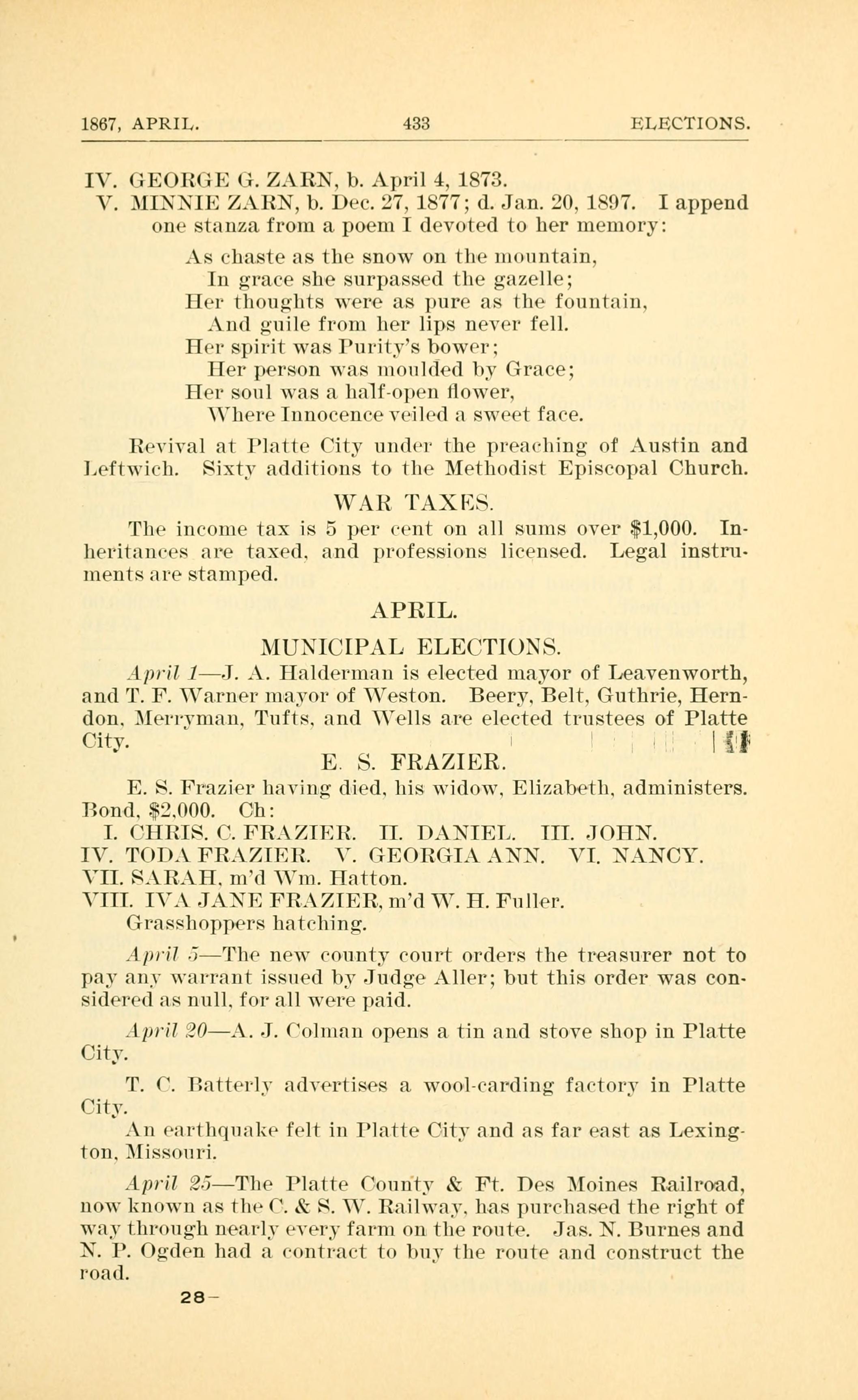 1867, APRIL. 433 ELECTIONS. IV. GEORG E G. ZARN. b. April 4, 1873. V. MINNIE Z.-XRN, b. Dec. 27, 1877; d. Jan. 20, 1897. I append one stanza fr0n1 a poem I devoted to her niemoryz As chaste as the snow on the mountain. In grace she surpassed the gazelle; Her thoughts were as pure as the fountain. And gzuile from her lips never fell. Her spirit was Puritvs bower; Her person was moulded by Grace; Her soul was a half-open ower. Vhere Innocence veiled a sweet face. Revival at Platte City under the preaching of Austin and Leftwich. Sixty additions to the Methodist Episcopal Church. WAR IAXES. The income tax is 5 per cent on all sums over $1,000. In- lieritances are taxed. and professions licensed. Legal instru- ments are stamped. APRIL. MUNICIPAL ELECTIONS. April 1J. A. Halderman is elected mayor of Leavenworth, and T. F. Wa.rn~er n1-ayor of Weston. Beery. Belt, Guthrie, Hern- don. lIerrvman. Tufts. and Vells are elected trustees of Platte City. l V l E. S. FRAZIER. E. S. Frazier having died. his widow. Elizabeth. administers. Bond. $2.000. Children: I. CHRIS. C. FRAZIER. II. DANIEL. III. JOHN. IV. TODA FR.-XZIER. V. GEORGIA ANN. VI. NANCY. VII. SARAH. md Vm. Hatton. VIII. IVA JANE FR.-IER. md W. H. Full-er. Grasshoppers hatching. April Jlhe new county court orders the treasurer not to pay any warrant issued by Judge Aller; but this order was con- sidered as null. for all were paid. April 20A. J. (olman opens a tin and stove shop in Platte City. T. F. Patte1-1) advertises a wool-carding factory in Platte Citv. An earthquake felt in Platte City and as far east as Lexing- ton. Missouri. April 25The Platte (ountv & Ft. Des Moines Railroad. now known as the f. & R. IV. Railway. has purchased the right of way through nearly every farm on the route. Jas. N. Burnes and N. P. Ogden had a contract to buy the route and construct the road. 28-