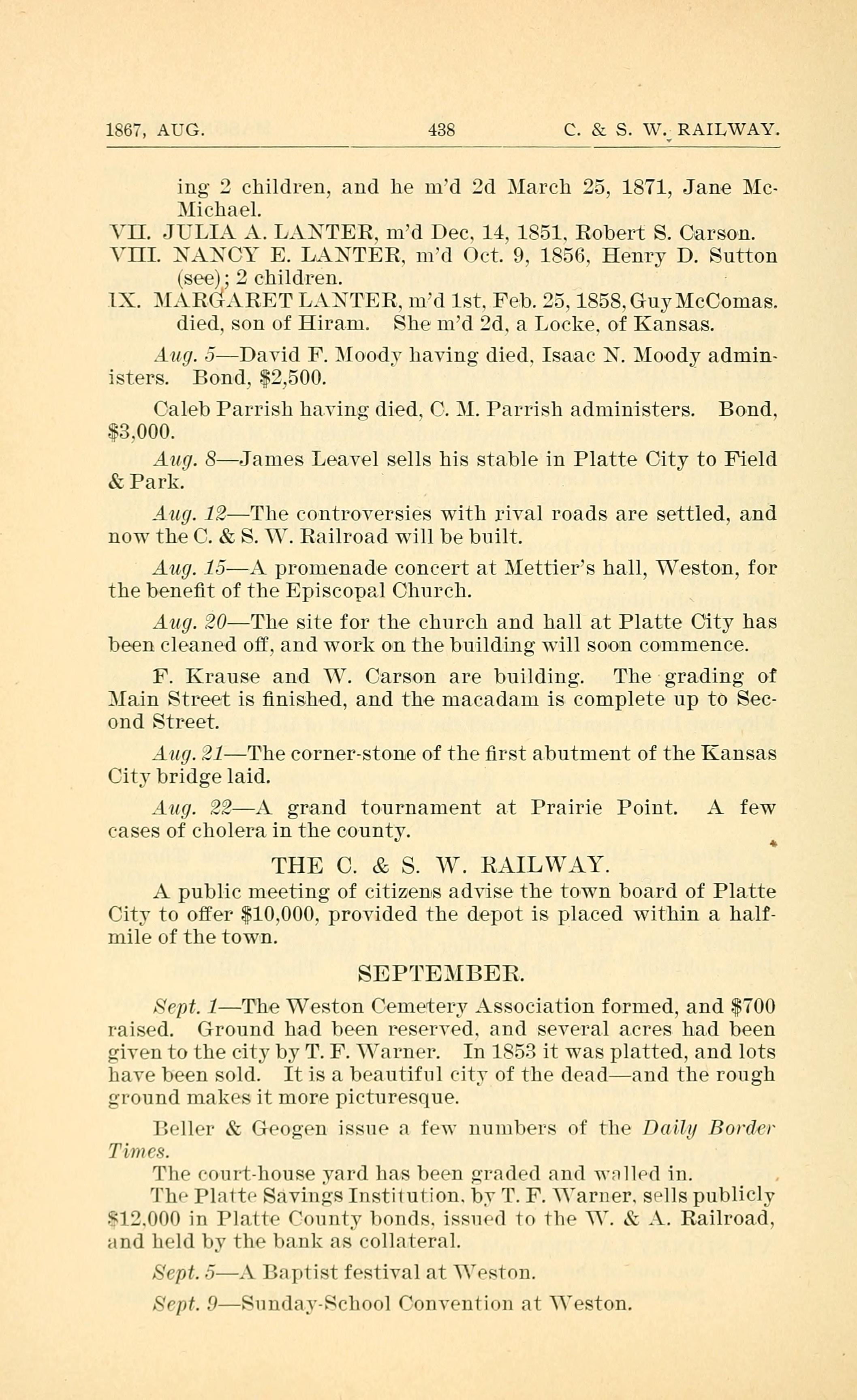 1867, AUG. 438 C. & S. W. RAILWAY. ing 2 children, and he in-d 2d March 25, 1871, Jane Mc- Michael. VII. JULIA A. LANTER, md Dec. 14, 1851. Robert S. Carson. VIII. NANCY E. LANTER, n1d Oct. 9, 1856, Henry D. Sutton tseez; 2 children. A IX. MARLTARET LANTER, md 1st, Feb. 25, 1858.GuyMcComas. died, son of Hiram. She married second. a Locke. of Kansas. Aug. 5David F. )Ioodv having died. Isaac N. Moody admin~ isters. Bond, $2,500. Caleb Parrish having died, C. )1. Parrish administers. Bond, -$3.000. Aug. 8 & Park. Aug. 12The controversies with rival roads are settled, and now the C. & S. W. Railroad will be built. Aug. 15A promenade concert at Mettiers hall, Westo~n, for the benet of the Episcopal Church. Aug. 20The site for the church and hall at Platte City has been cleaned off, and work on the building will soon commence. F. Krause and W. Carson are building. The grading of Main Street is nished, and the macadam is complete up to Sec- ond Street. ~llu(/. 21The cornerstone of the rst abutment of the Kansas City bridge laid. .1u(/. 22A grand tournament at Prairie Point. A few cases of cholera in the county. THE C. & S. W. RAILWAY. A public meeting of citizens advise the town board of Platte City to offer $10,000, provided the depot is placed Within a half- mile of the town. James Leavel sells his stable in Platte City to Field 4 SEPTEMBER. Sept. 1The Weston Cemetery Association formed, and $700 raised. Ground had been reserved. and several acres had been given to the city by T. F. Warner. In 1853 it was platted, and lots have been sold. It is a beautiful citv of the deada11d the rough ground makes it more picturesque. lieller & Geogen issue a few numbers of the D(Ii.lg/ Border Tzmc.-. lhe c-ourthouse yard has been graded and Walled in. . The Plaite Savings Institution. by T. F. Warner. sells publicly .71.2.000 in Platte (ounty bonds. issued to the NY. & A. Railroad, and held by the bank as collateral. Sept. 5. Baptist festival at. \eston. Sept. .0Su11dav-School Convention at Weston.