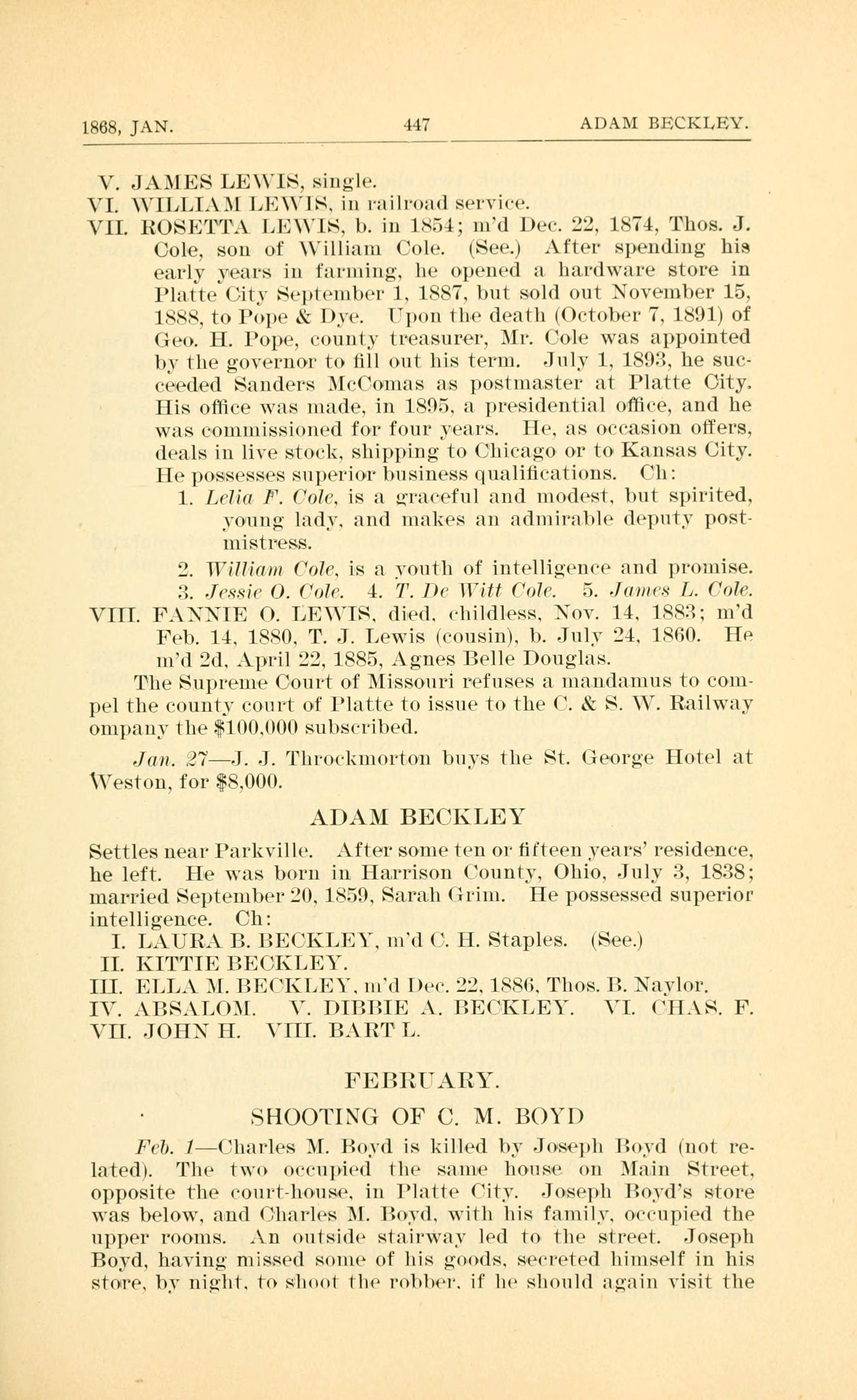 1868, JAN. 447 ADAM BECKLEY. V. JAMES LEWIS, single. VI. VILLI.)l Ll3\lh. in rziilroud serviee. VII. l{OSEl"J..- l.E\.lh. 1). in 1854; 1nd Dee. 22.. 1874, Thos. J. Cole, son of \illi:un Cole. (See) After spending his e:1.rlV years in t:u1ui11g. he opened :1 l1:udw:ire store in Platte (?-it September 1. 1887, but sold out November 15. 1889, to Pope & Dye. Ipon the death tOetoleI 7. 1501) of Geo. H. Pope, eountv trezisurer. .Ir. (ole was appointed by the governor to till out his tern}. July 1. 1802-}. he sue- eeeded Sanders ;Ie(om:1s as postinaster at Platte City. His office was made. in 1805. :1 presidential oiee, and he was eoinmissioned for four years. He. as oe(:l.Si()11 otters. deals in live stoek. shipping to (,l1i(-agzo or to Kansais City. He possesses superior business (]l1{1lI(f21il()1lS. (h: 1. Lelia I". (lole. is :1 u;rz1eeful and modest. but spirited. o1111;: laid). and makes an admirable (lep11t post- mistress. 2. William (ioIe. is :1 outh of intelli,:enee and promise. 2%. -Tessie O. Vole. 4. T. IN Witt Ooh. 5. James I]. (Vile. VIII. F..,IE O. LEVIS. died. eliildless. Nov. 14. 188?; 1nd Feb. 14. 18.90. T. J. Lewis (eousin). 1). July 24. 1960. He u1d 2d. April 22, 1885, Agnes Belle Doilglus. The Supreine Court of Missouri refuses :1 mmldunius to C0111- pel the county court of 1lutte to issue to the t. & S. V. Railwzly onipany the $100,000 sillist-1iled. Jun. .27J. J. Il1ro(-k1no1ton buys the St. Ge~orge Hotel at Weston. for $8.000. ADAM BECKLEY Settles near Parkville. After some ten or fteen yen rs residence. he left. He was born in Harrison (ount). Ohio. July 3, 1838; married September 20. 1.859. Szirzili (:1-in1. He possessed superior intelligence. Children: I. LAURA B. IIECKLEY, md t. H. Staples. (See) II. KITTIE BECKLEY. III. ELLA M. IlE(I{LEY. uid Dee. 22. 1386, Thos. P. Naiylor. IV. .BI.I.().[. V. DIl3lIE .. PE(I{LEY. VI. tIl.S. F. VII. JOHN H. VIII. BART L. FEBRYARY. SHOOTING OF C. M. BOYD Feb. I(}h:1rles M. Boyd is killed by Joseph lloytl mot re- lated). The two oeeupied the szune house. on Main Street. opposite the eourt-house. in ll:1tte (it. Josepli lovds store was below. and 0l1mles M. lod. with his family. oeeupied the upper rooms. . outside st:i.irw:1v led to the street. Joseph Boyd. having missed some of his gomls. seereted himself in his store. by night. to shoot the rolvlier. if he should :i,,1:1i1i visit the
