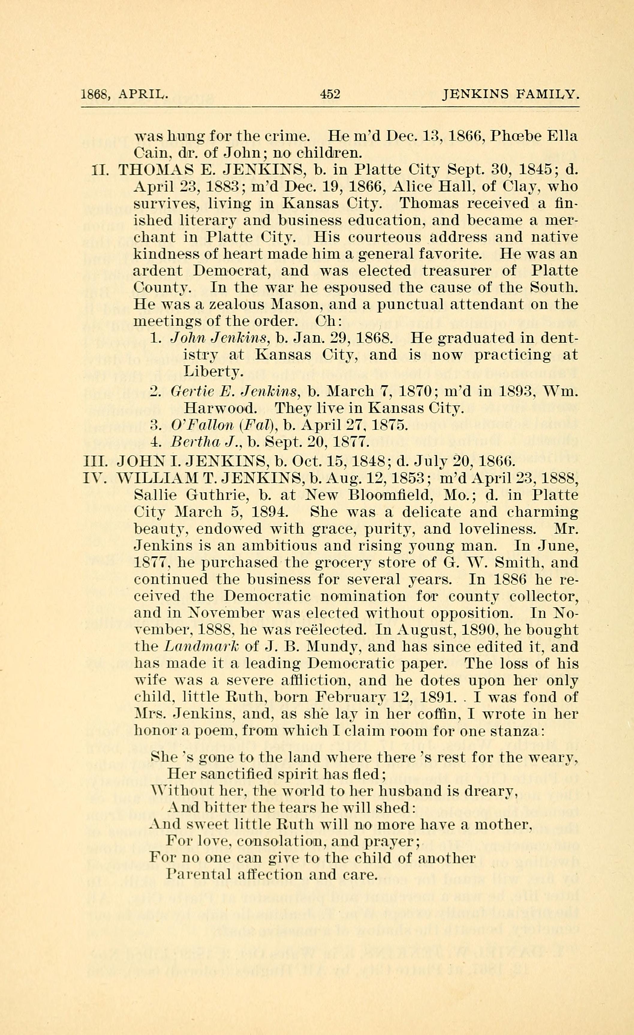 1868, APRIL. 452 JENKINS FAMILY. was hung for the crime. He md Dec. 13, 1866, Phoebe Ella Cain. dr. of John; no children. 11. THOMAS E. JENKINS, b. in Platte City Sept. 30, 1845; d. April 23, 1883; md Dec. 19, 1866, Alice Hall, of Clay, who survives, living in Kansas City. Thomas received a n- ished literary and business education, and becam-e a mer- chant in Platte City. His courteous address and na.tive kindness of heart made him a general favorite. He was an ardent Dem-ocrat, a.nd was elected treasurer of Platte County. In the war he espoused the cause of the South. He was a zealous Mason. and a punctual attendant on the meetings of the order. Children: 1. Jolm Je72k/ms, b. Jan. 29, 1868. He graduated in dent- istrry at Kansas City, and is now practicing at Liberty. 2. Gertie E. Jenkinls, b. March 7, 1870; md in 1893. Wm. Harwood. They live in Kansas City. 3. OFallo42, (Fail), b. April 27. 1875. 4. Bertha J.. b. Sept. 20, 1877. III. JOHN I. JENKINS, b. Oct. 15, 1848; d. July 20, 1866. IV. WILLIAM T. JENKINS, b. Aug. 12, 1853; md April 23, 1888, Sallie Guthrie, b. at New Bloomeld, Mo.; (1. in Platte City .Iarch 5, 1894. She was a delicate and charming beauty, endowed with grace, purity, and loveliness. Mr. Jenkins is an ambitious and rising young man. In June, 1877. he purchased the grocery store of G. W. Smith. and continued the business for several years. In 1886 he re- ceived the Democratic nomination for county collector, and in November was elected without opposition. In No- vember. 1888. he was reelected. In August, 1890. he bought the Lmzclmmk of J. B. Mundy, and has since edited it, and has made it a leading Democratic paper. The loss of his wife was a severe aflliction. and he dotes upon her only child. little Ruth. born February 12, 1891. . I was fond of Mrs. Jenkins, and. as she lay in her coin. I wrote in her honor a poem. from which I claim room for one stanza: She s gone to the land where there s rest for the weary. Her sanctied spirit has ed; Without her. the world to her husband is dreary, A ml bitter the tears he will shed: And sweet little Ruth will no more have a mother. For love. covnsolatioun, and prayer; For no one can give to the child of another la1-c11t:n1 z1e-tion and care.