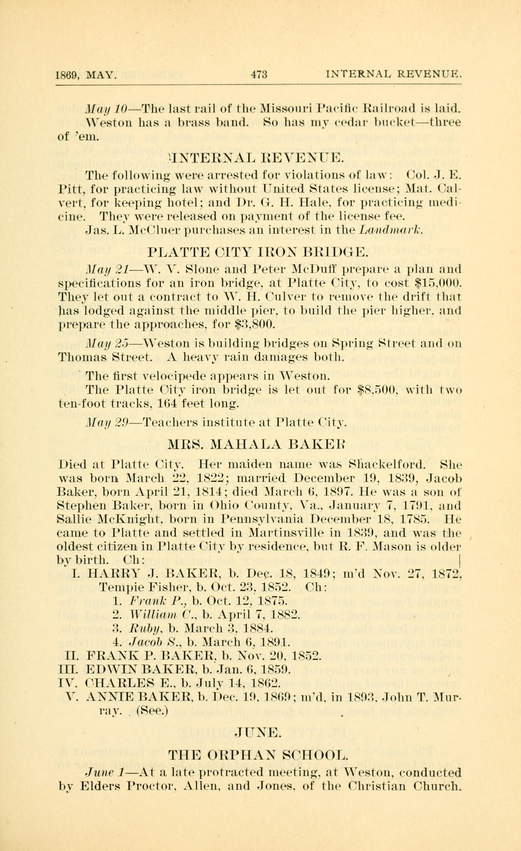 1869, MAY. 473 INTERNAL REVENUE May 10 - The last rail of the Missouri Pacific Railroad is laid. INTERNAL REVENUE Col. J. E. Pitt Mat. Calvert Dr. G. H. Hale Jas. L. McCluer the Landmark PLATTE CITY IRON BRIDGE W. V. Slaon and Peter McDuff W. H. Culver Weston is building bridges on Spring Street and on Thomas Street A heavy rain damages both The first velocipede appears in Weston Teachers institute at Platte City MRS. MAHALA BAKER died at Platte City. Shackelford Jacob Baker Stephen Baker Sallie Knight R. F. Mason I. HARRY J. BAKER Tempe Fisher 1. Frank P. Baker 2. William C. Baker 3. Ruby Baker 4. Jacob S. Baker II. FRANK P. BAKER III. EDWIN BAKER IV. CHARLES E. BAKER V. ANNIE BAKER JUNE THE ORPHAN SHCOOL Weston Elders Proctor, Allen, and Jones Christian Church
