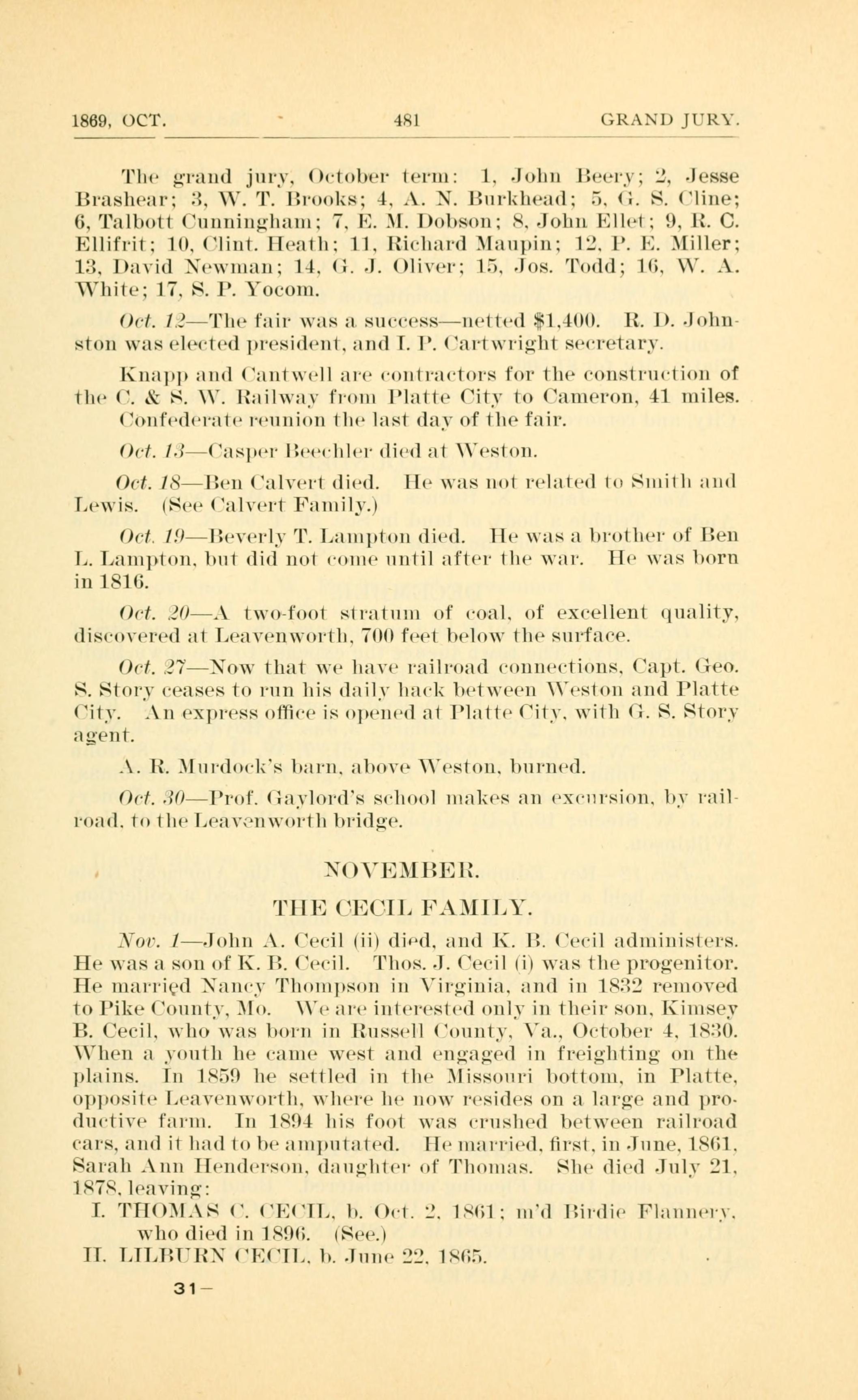 1869, OCT. 481 GRAND JURY Grand Jury October Term 1. John Beery 2. Jesse Brashear 3. W. T. Brooks 4. A. N. Burkhead 5. G. S. Cline 6. Talbott Cunningham 7. E. M. Dobson 8. John Ellet 9. R. C. Ellifrit 10. Clint. Heath 11. Richard Maupin 12. P. E. Miller 13. David Newman 14. G. J. Oliver 15. Jos. Todd 16. W. A. White 17. S. P. Yocum Oct. 12 - The fair was a success - netted $1,400. R. D. Johnston was elected president, and I. P. Cartwright secretary. Knapp and Cantwell are contractors for the construction of the C. & S. W. Railway from Platte City to Cameron, 41 miles. Confederate reunion the last day of the fair. Oct. 13 - Casper Beechler died at Weston. Oct. 18 - Ben Calvert died. Oct. 19 - Beverly T. Lampton died. He was a brother of Ben L. Lampton. Capt. Geo. S. Story express office opened at Platte City A. R. Murdock's barn, above Weston, burned. Prof. Gaylord school NOVEMBER THE CECIL FAMILY Nov. 1 - John A. Cecil (ii) died K. B. Cecil Thos. J. Cecil (i) Nancy Thompson Kimsey B. Cecil Sarah Ann Henderson Thomas Henderson I. THOMAS C. CECIL Birdie Flannery II. LILBURN CECIL