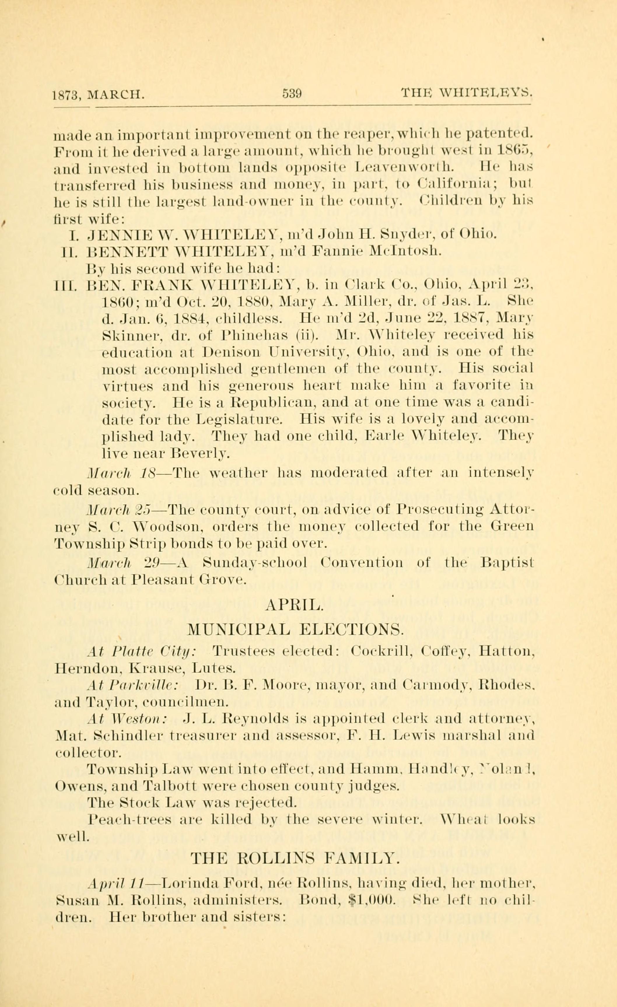 1873. MARCH. 539 THE WHITELEYS I. JENNIE W. WHITELEY, married John H. Snyder, of Ohio II. BENNETT WHTTELEY, married Fannie McIntosh By his second wife he had: III. BEN. FRANK WHITELEY, b. in Clark Co., Ohio, April 23, 1860; married October 20, 1880, Mary A. Miller, dr. of Jas. L. Miller. She d. January 6, 1884, childless. He married, second, June 22, 1887, Mary Skinner, daughter of Phinehas Skinner (ii). Mr. Whiteley received his education at Denison University, Ohio, and is one of the most accomplished gentlemen of the county....They live near Beverly. March 18 - The weather has moderated after an intensely cold season. March 25 - The county court, on advice of Prosecuting Attorney S. C. Woodson, orders the money collected for the Green Township bonds to be paid over. March 29 - A Sunday-school Convention of the Baptist Church at Pleasant Grove. APRIL MUNICIPAL ELECTIONS At Platte City: Trustees elected: Cockrill, Coffey, Hatton, Herndon, Krause, Lutes. At Parkville: Dr. B. F. Moore, mayor, and Carmody, Rhodes, and Taylor, councilmen. At Weston: J. L. Reynolds is appointed clerk and attorney, Mat. Schindler treasurer and assessor, F. H. Lewis marshall and collector. Township Law went into effect, and Hamm, Handley, Noland, Owens, and Talbott were chosen county judges. Peach trees are killed by the severe winter. Wheat looks well. THE ROLLINS FAMILY April 11 - Lorinda Ford, nee Rollins, having died, her mother, Susan M. Rollins, administers. Bond, $1,000. She left no children. Her brothers and sisters: