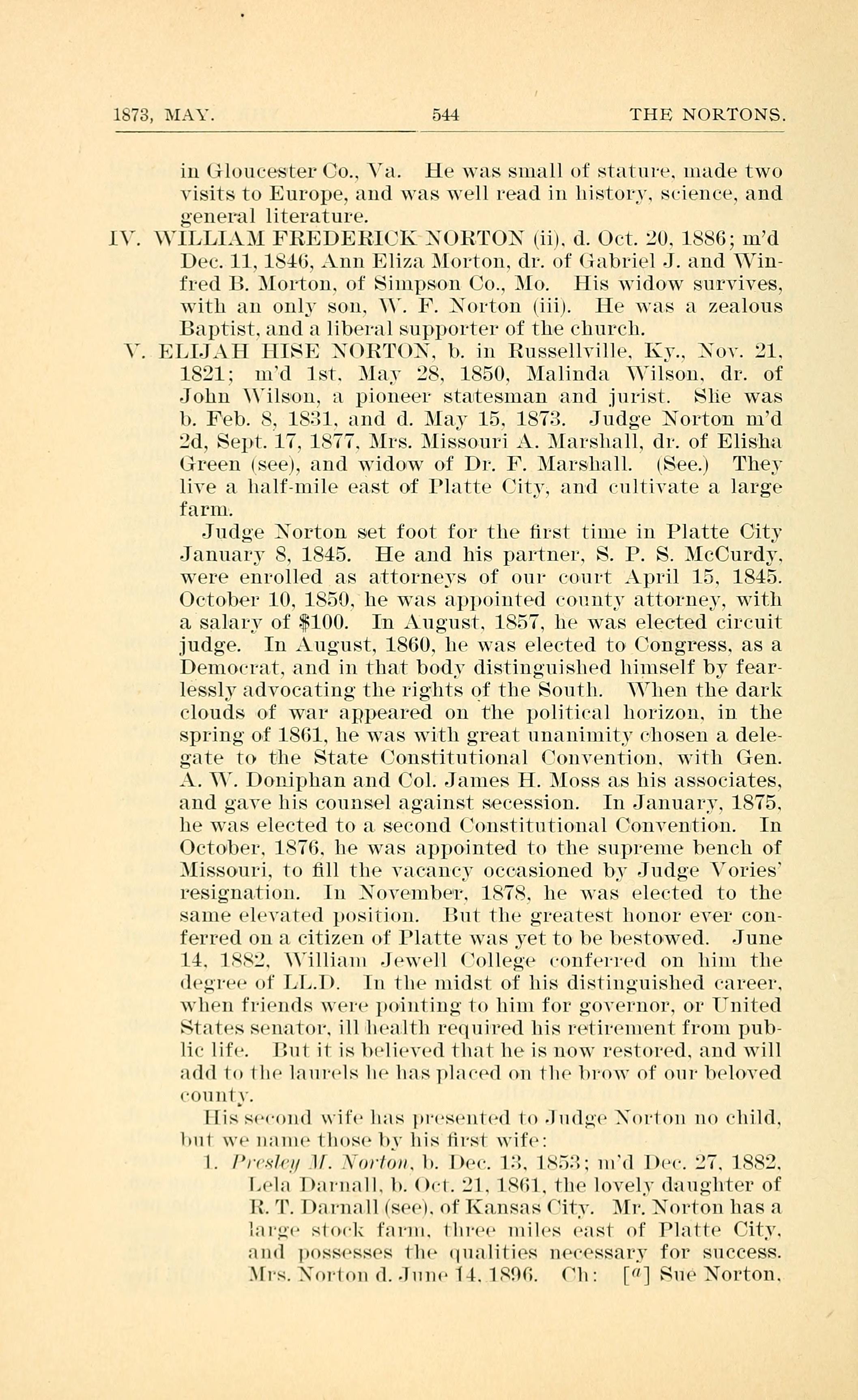 1873, MAY. 544 THE NORTONS. in Gloucester Co., Va. He was small of stature. made two visits to Europe, and was well read in historv. science. and general literature. 1. WILLIAM FREDERICK NORTON (ii), d. Oct. 20. 1886; m'd Dec. 11. 1846. Ann Eliza Morton. dr. of Gabriel J. and Win- fred B. Morton. of Simpson Co., Mo. His widow survives, with an only son. W. F. Norton (iii). He was a zealous Baptist. and a liberal supporter of the church. V. ELIJAH HISE NORTON. b. in Russellville. Ky.. Nov. :31. 1821: m'd 1st. May 28. 1850. Malinda Wilson. dr. of John Wilson. a pioneer statesman -and jurist. She was b. Feb. 8. 1831. and d. May 15. 1873. Judge Norton m'd 2d. Sept. 17. 1877. Mrs. Missouri A. Marshall, dr. of Elisha Green (see). and widow of Dr. F. Marshall. (See) They live a half-mile east of Platte City. and cultivate a large farm. Judge Norton set foot for tl1e first time in Platte City January 8. 1845. He and his partner. S. P. S. McCurdy. were enrolled as attorneys of our court April 15. 1845. October 10. 1850, he was appointed county attorney. with a salary of $100. In August. 1857. he was elected circuit judge. In August. 1860. he was elected to Congress. as a Democrat. and in that body distinguished himself by fear- lessly advocating the rights of the South. When the dark clouds of war appeared on the political horizon. in the spring of 1861. he was with great unanimity chosen a dele- gate to the State Constitutional Convention. with Gen. A. Y. Doniphan and Col. James H. Moss as his associates. and gave his counsel against secession. In January 1875, he was elected to a second Constitutional Convention. In October. 1876. he was appointed to the supreme bench of Missouri. to fill the vacancy occasioned by Judge Vories resignation. In November 1878, he was elected to the same elevated position. But the greatest honor ever con- ferred on a citizen of Platte was yet to be bestowed. June 14. 1882, William Jewell college conferred on him the degree of LL.D. In the midst of his distinguished career. when friends were pointing to him for governor. or United States senator, ill health required his retirement from pub- lic life. But it is believed that he is now restored and will add to the laurels he has placed on the brow of our beloved county. His second wife has presented to Judge Norton no child. but we name those by his first wife: 1. Presley M. Norton b. Dec. 13, 1853; m'd Dec 27, 1882, Lela Darnall b. Oct 21, 1861 the lovely daughter of R. T. Darnell (see), of Kansas City. Mr. Norton has a large stock farm, three miles east of Platte City, and possesses the qualities necessary for success. Mrs. Norton died June 14, 1896 Ch. [a] Sue Norton,