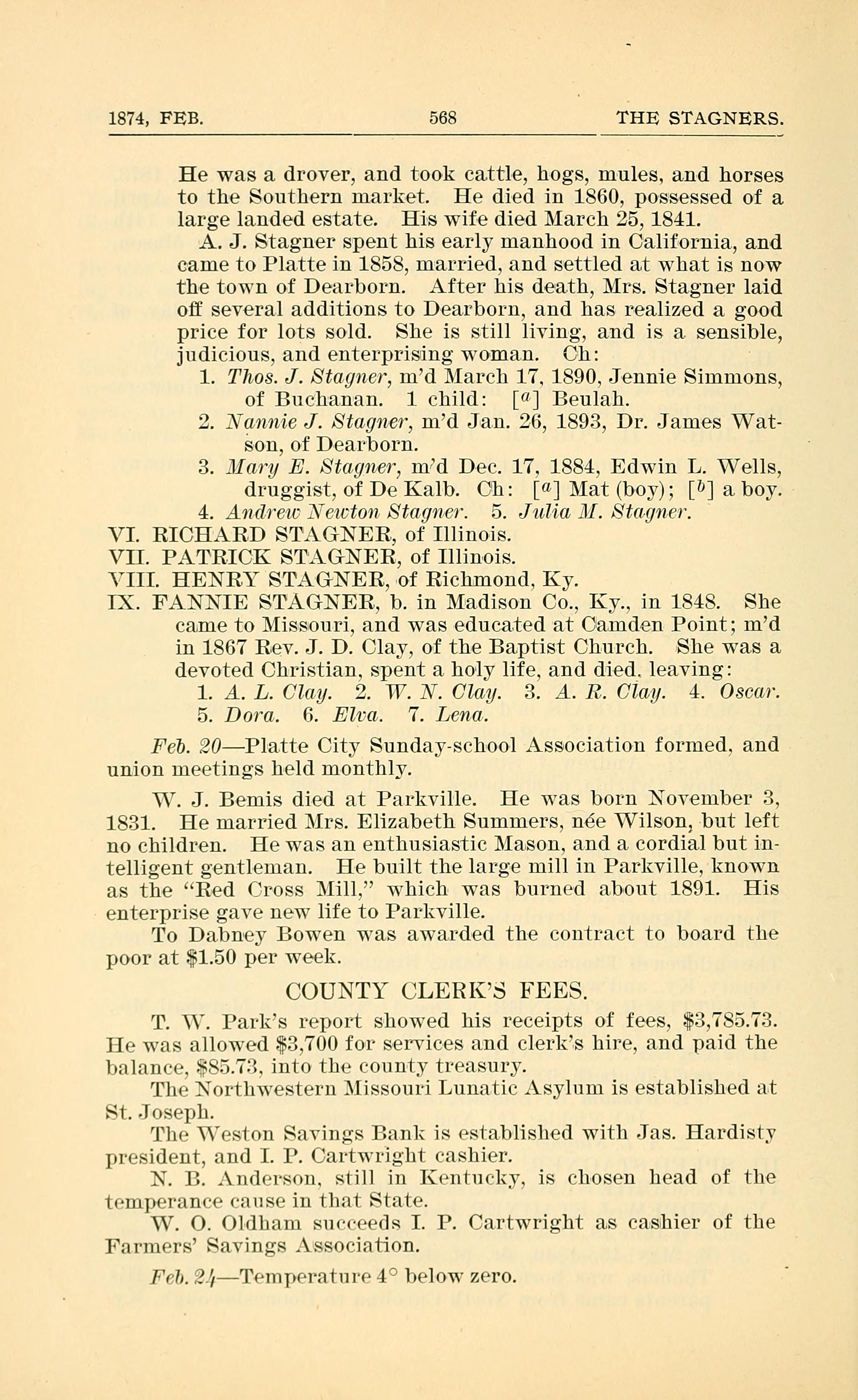 1874, FEB. 568 THE STAGNERS. He was a drover, and took cattle, hogs, mules, and horses to the South-ern market. He died in 1860, possessed of a large landed estate. His wif-e died March 25, 1841. A. J. Stagner spent his early manhood in California, and came to Platte in 1858, married, and settled at what is now the town of Dearborn. After his death, Mrs. Stagner laid off several additions to Dearborn, and has realized a good price for lots sold. She is still living, and is a. sensible, judicious, and enterprisring woman. Children: 1. Thos. J. Sta,(/net), md March 17 , 1890, Jennie Simmons, of Buchanan. 1 child: [0] Beulah. Nmzme J. Stagner, md Jan. 26, 1893, Dr. James Wat- son, of Dearborn. 3. Mary E. Stag/ner, md Dec. 17, 1884, Edwin L. Wells, druggist, of De Kalb. Children: [1] Mat (boy); [9] a boy. 4. Andmew Newton Stagmar. 5. Julia. M. Stayner. VI. RICHARD STAGNER, of Illinois. VII. PATRICK STAGNER, of Illinois. VIII. HENRY STAGNER, of Richmond, Ky. IX. FANNIE STAGNER, b. in Madison Co., Ky., in 1848. She came to Missouri, and was educated at Camden Point; md in 1867 Rev. J. D. Clay, of the Baptist Church. She was a devoted Christian, spent a holy life, and died, leaving: 1. A. L. Clay. 2. W. N. Clay. 3. A. R. Clay. 4. Oscar. 5. Dora. 6. Elm. 7. Lena. Feb. 20Platte City Sunday-school Association formed, and union meetings held monthly. W. J. Bemis died at Parkville. He was born November 3, 1831. He married Mrs. Elizabeth Summers, ne Wilslon, -but left no children. He was an enthusiastic Mason, and a cordial but in- telligent gentleman. He built the large mill in Parkville, known as the Red Cross Mill, which was burned about 1891. His enterprise gave new life to Parkville. To Dabn-ey Bowen was awarded the contract to board the poor at $1.50 per week. COUNTY CLERKS FEES. 1. W. Parks report showed his receipts of fees, $3,785.73. He was allowed ...-3,700 for services and clerkis hire, and paid the balance. $85.73. into the county treasury. The Io1-tliwestern Missouri Lunatic Asylum is established at Joseph. The Weston Savings Bank is established with Jas. Hardisty president, and I. P. Cartwright cashier. N. B. .mle1-so11, still in Keiitiicky, is chosen head of the temperance cause in that State. IV. 0. Oltlham sm-ree(ls I. P. Cartwright as cashier of the Farmers Savings Association. Fr-h. .?./.le-niperature 40 below zero.