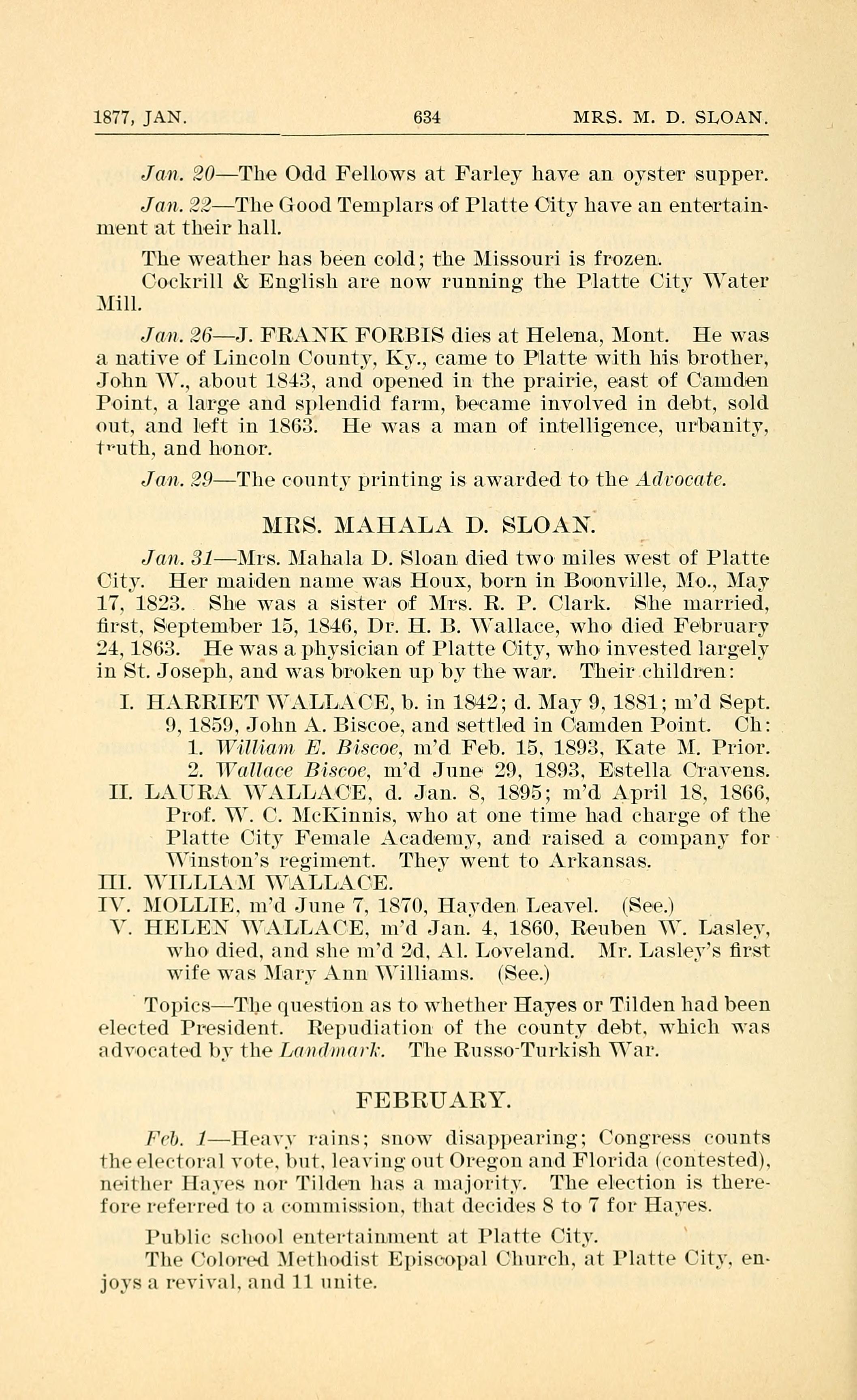 1877, JAN. 634 MRS. M. D. SLOAN. Jan. 20 - The Odd Fellows at Farley have an oyster supper. Jan. 22 - The Good Templars of Platte City have an entertainment at their hall. The weather has been cold; the Missouri is frozen. Cockrill & English are now running the Platte City Water Mill. Jan. 26 J. FRANK FORBIS dies at Helena, Mont. He was a native of Lincoln County, Ky., came to Platte with his brother, John W., about 1843, and opened in the prairie, east of Camden Point, a large and splendid farm, became involved in debt, sold out, and left in 1863. He was a man of intelligence, urbanity, truth, and honor. Jan. 29 The county printing is awarded to the Advocate. MRS. MAHALA D. SLOAN. Jan. 31Mrs. Mahala D. Sloan died two miles west of Platte City. Her mai-den name was Houx, born in Bo-onyille, M0,, May 17, 1823. She was a sister of Mrs. R. P. Clark. She married. rst. September 15, 1816, Dr. H. B. Ya.lla.ce, who died February 24, 1863. He was a physician of Platte City, who invested largely in St. Joseph, and was b~ro~ken up by the war. Their children: I. HARRIET WALL.ACE, b. in 1842; d. May 9, 1881; md Sept. 9, 1859. John A. Biscoe, and settled in Camden Point. Children: 1. William E. Biscoe, married Feb. 15, 1893, Kate M. Prior. 2. Wallace Biscoe, married June 29. 1893, Estella Cravens. II. LAURA VWALLACE, d. Jan. 8, 1895; married April 18, 1866, Prof. W. C. McKinnis, who at one time had charge of the Platte City Female Academy, and raised a company for Winston's regiment. They went to Arkansas. III. WILLIAM WALLACE. IV. MOLLIE WALLACE, d. June 7, 1870, Hayden Leavel. (See) V. HELEN WALLACE, married Jan. 4, 1860, Reuben W. Lasley, who died, and she married 2nd Al. Loveland. Mr. Lasley's first wife was Mary Ann Williams. (See) Topics - The question as to whether Hayes or Tilden had been elected President. Repudiation of the county debt, which was advocated by the Landmark. The Russo-Turkish War. FEBRUARY. Feb. 1 - Weather - Heavy rains: snow disappearing; Congress counts the electoral vote, but, leaving out Oregon and Florida (contested), neither Hayes nor Tilden has a majority. The election is therefore referred to a commission, that decides 8 to 7 for Hayes. Public School entertainment at Platte City. The Colored Methodist Episcopal Church, at Platte City, enjoys a revival, and 11 unite.