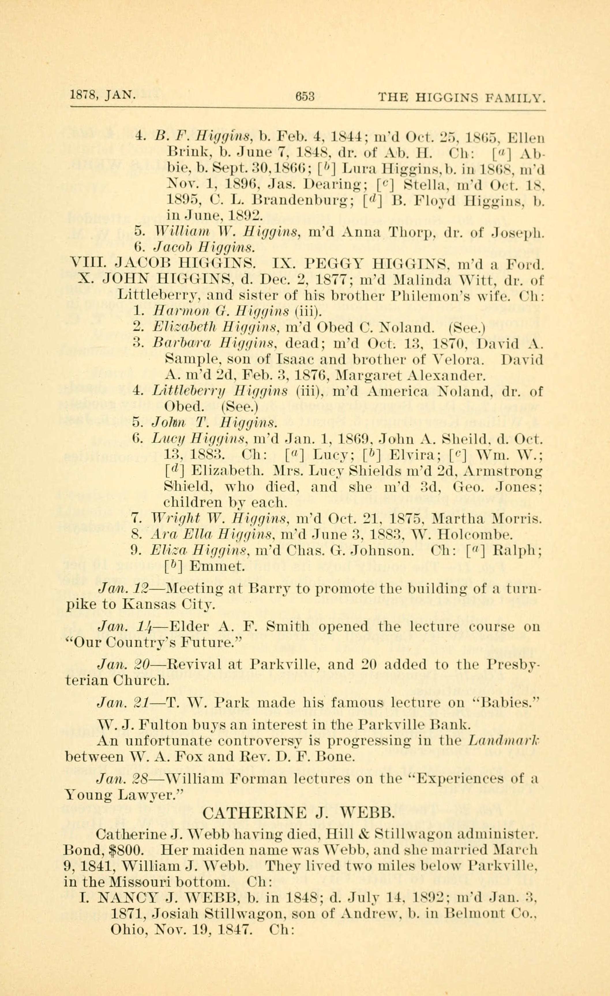 1878, JAN 653 THE HIGGINS FAMILY. 4. B. F. Higgins, b. Feb. 4, 1844; married Oct. 25, 1865, Ellen Brink, b. June 7, 1848, daughter of Ab. H. Brink. Children: [a] Abbie Higgins, b. Sept. 30, 1866 [b] Lura Higgins, b. in 1868, married Nov. 1, 1896, Jas. Dearing [c] Stella Higgins, married Oct. 18, 1895, C. L. Brandenburg [d] B. Floyd Higgins, b. in June, 1892 5. William W. Higgins, married Anna Thorp, daughter of Joseph Thorp 6. Jacob Higgins VIII. JACOB HIGGINS IX. PEGGY HIGGINS, married a Ford. X. JOHN HIGGINS, d. Dec. 2, 1877; married Malinda Witt, daughter of Littleberry, and sister of his brother Philemon's wife. Children: 1. Harmon G. Higgins (iii) 2. Elizabeth Higgins, married Obed C. Noland (see) 3. Barbara Higgins, dead; married Oct. 13, 1870, David A. Sample, son of Isaac Sample and brother of Velora. David A. married second, Feb. 3, 1876, Margaret Alexander. 4. Littleberry Higgins (iii), married America Noland, daughter of Obed Noland (see). 5. John T. Higgins 6. Lucy Higgins, married Jan. 1, 1869, John A. Shield, d. Oct. 13, 1883. Children: [a] Lucy Shield [b] Elvira Shield [c] William W. Shield [d] Elizabeth Shield Mrs. Lucy Shields married second, Armstrong Shield, who died, and she married third, George Jones; children by eaChildren: 7. Wright W. Higgins, married Oct. 21, 1875, Martha Morris 8. Ara Ella Higgins, married June 3, 1883, W. Holcombe 9. Eliza Higgins, married Chas. G. Johnson Children: [a] Ralph Johnson [b] Emmet Johnson Jan. 12 - Meeting at Barry to promote the building of a turnpike to Kansas City. Jan. 14 - Elder A. F. Smith opened the lecture course on "Our Country's Future" Jan. 20 - Revival at Parkville, and 20 added to the Presbyterian Church. Jan. 21 - T. W. Park made his famous lecture on "Babies". W. J. Fulton buys an interest in the Parkville Bank An unfortunate controversy is progressing in the Landmark between W. A. Fox and Rev. D. F. Bone. Jan. 28 - William Foreman lectures on the "Experiences of a Young Lawyer" CATHERINE J. WEBB Catherine J. Webb having died, Hill & Stillwagon administer. Bond, $800. Her maiden name was Webb, and she married March 9, 1841, William J. Webb. They lived two miles below Parkville, in the Missouri bottom. Children: I. NANCY J. WEBB, b. in 1848; d. July 14, 1892; married Jan. 3, 1871, Josiah Stillwagon, son of Andrew, b. in Belmont Co., Ohio, Nov. 19, 1847. Children: