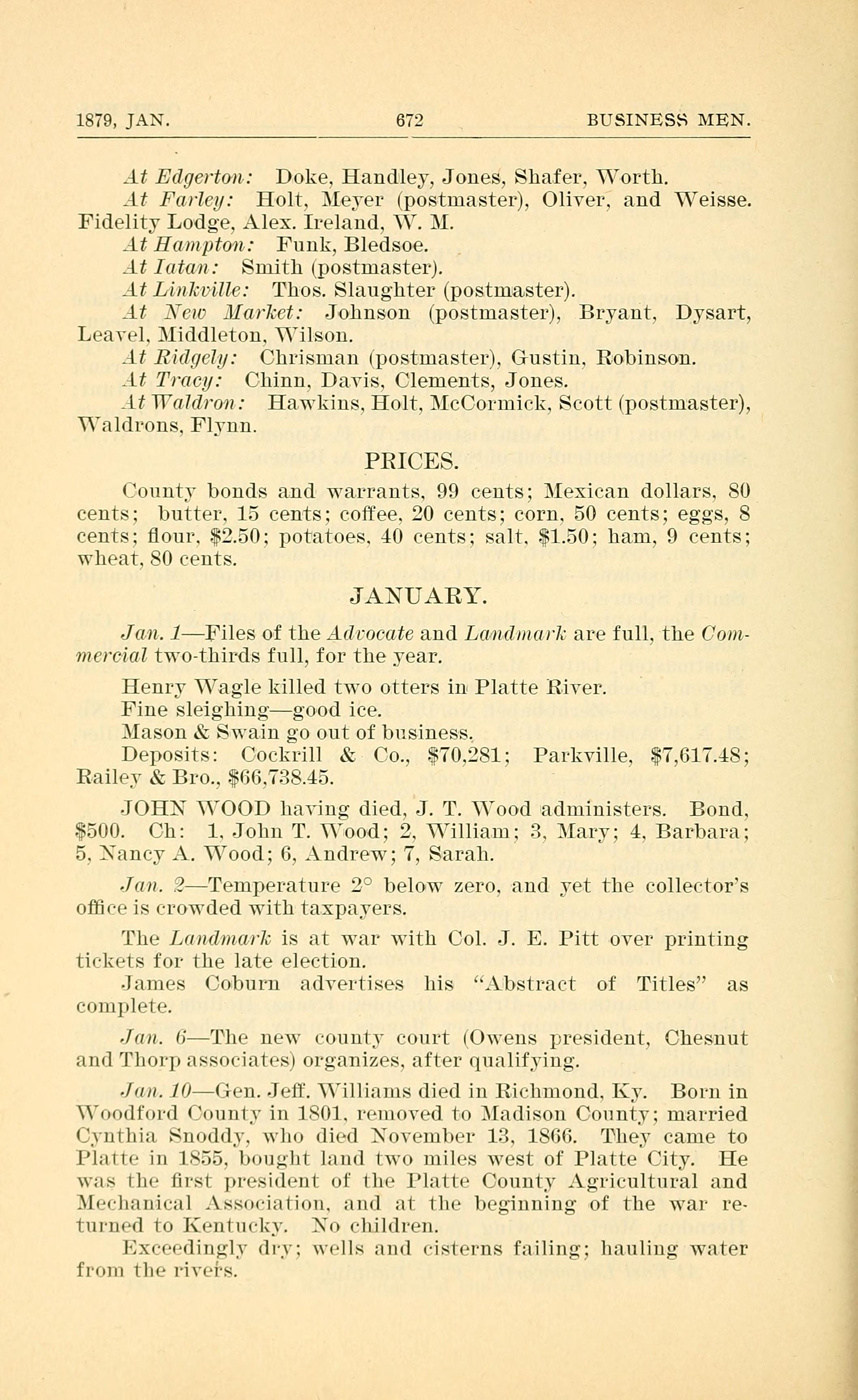 1879, JAN. 67.? BUSINESS MEN. At Edgerton: Doke, Handley, Jones, Shafer, YVorth. At Farlcg/. Holt, Meyer (postmaster), Oliver, and Weisse. Fidelity Lodge, Alex. Ireland, W. M. At Ham ptcm: Funk, Bledsoe. At I atom : Smith (postmaster). .1tLinkviZle. Thos. Slaughter (postmaster). At N010 rllarket: Johnson (postmaster), Bryant, Dysart, Leave]. Middleton, Wilson. .1tRidgely: Chrisman (postmaster), Gustin, Robinson. At Tracy: Chinn, Davis. Clements, Jones. At Waldrcm : Hawkins, Holt, McCormick, Scott (postmaster), Waldrons, Flynn. PRICES. County bonds and warrants. 99 cents; Mexican dollars. 80 cents: butter. 15 cents; coee, 20 cents; corn. 50 cents; eggs, 8 cents; our. $2.50; potatoes. 40 cents; salt. $1.50; ham, 9 cents; wheat, 80 cents. JANUARY. J (m. 1Files of the Advocate and La,-n-cln2(uI. are full, the Com- mercial two-thirds full, for the year. Henry Wagle killed two otters in- Platte River. Fine slei0hinpcrood ice. Mason &bSwai3n 0 out of business. . Deposits: Cockrill & Co., $70,281; Parkville, $7,617.48; Railey & Bro., $66,738.45. JOHN WOOD having died, J. T. Vood administers. Bond, $500. Children: 1. John T. Wood; 2-. Willia.m; 3. Mary; 4. Barbara; 5. Nancy A. Wood; 6, Andrew; 7, Sarah. Jun. .?Temperature 20 below zero. and yet the collectors ofrre is crowded with taxpayers. The Lamlnziaark is at war with C01. J. E. Pitt over printing tickets for the late election. James Coburn advertises his Abstract of Titles as complete. Jun. (iTl1e new county court (Owens president. Chesnut and T1lOlp{1SS()(i21T(S) organizes. after qualifying. Jun. 10Gen. Jeff. \i1lian1s died in Richmond. Ky. Born in \nm1tord Cmiiity i11 1801. removed to Madison County; married C1itl1ia Snoddy, who (lied Noveinher 13. 1866. They came to Platte in 1855. bouglit land two miles west of Platte City. He was the i-st presideiit of the Platte County Agricultural and ;Ie.-hanical .ssm-iatiou. and at the beginning of the war re- turned to I{tl1ill(l{. No chiltlren. ]Cxcemling1v dry: wells and eisterns failing; hauling water from the liLiS.