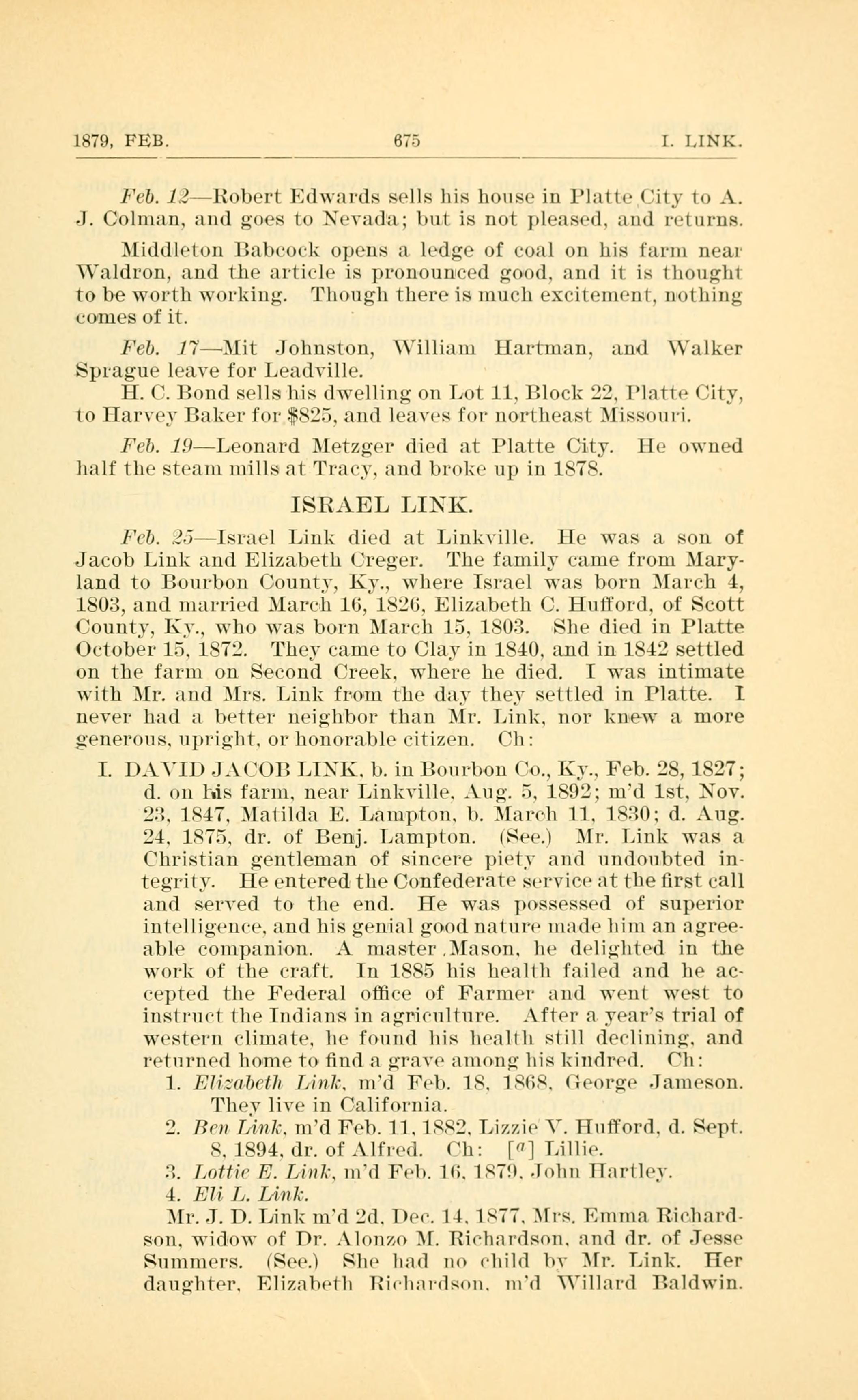 1879, FEB. 675 I. LINK. Fcb. 12 Robert Edwards sells his house in Platte City to A. J. Colman. and goes to Nevada; but is not pleased. and returns. Middleton Babcock opens a ledge of coal on his farm near Valdron, and the article is pronounced good. and it is thought to be worth working. Though there is much excitement. nothing comes of it. Feb. 17 Mit Johnston, William Hartman, and Walker Sprague leave for Leadville. H. C. Bond sells his dwelling on Lot 11, Block 22. Platte City, to Harvey Baker for $825 and leaves for nortlheast Missouri. Feb. .19 Leonard Metzger died at Platte City. He owned half the steam mills at Trae. and broke up in 1878. ISRAEL LINK. Feb. .2.3Israel Link (lied at Linkville. He was a son of Jacob Link an(l Elizabeth t,rege1. The family came from Mary- land to Bourbon County. KY. where Israel was born March 4, 1803, and 1n-arried Mart-l1 10, 1826. Elizabeth C. Hutlord. of Scott County, KY, who was born March 15. 1803. She died in Platte October 15. 1872. They came to Clay in 1840. and in 1842 settled on the farm on Second Creek. where he died. I was intimate with Mr. and .Irs. Link from the day thev settled in Platte. I never had a better nei;:;l1bor than Mr. Link. nor knew a. more generous. upri,Qht. or honorable citizen. Children: I. DAVID -J.(;OB LINK. b. i11 Bourbon ()o., Ky.. Feb. 28, 1827; d. on his farm. near Linkville. -ug. 1892; Ind 1st, Nov. 23. 1947. Matilda E. La111pto11. b. Mareh 11. 1930; d. Aug. 24. 1875. dr. of Benj. Lampton. (See) Mr. Link was a Christian gentleman of sincere pietv and undoubted in- tegritv. He entered the Confederate service at the rst call and served to the end. He was possessed of superior i11telligenee. and his genial good nature made him an agree- able companion. A n1as~ter.Mason. he delighted in the work of the craft. In 1885 his health failed and he ac~ eepted the Federal office of Farmer and went west to instruet the Indians in agrieulture. After a years trial of western climate. he found his health still deelining. and returned home to nd a ;.,l.1e among: his kindred. Children: 1. Elisabet]: Link. md Feb. 19. 1.969. George Jameson. ll1ev live in California. 2. Ben I/l.V7l]. md Feb. 11. 199:3. Lizzie V. Hutford. d. Sept. 1894. dr. of .-lf1ed. Children: [7] Lillie. 3. Lottie F}. Link. md Fell. HS. 1979. John llartlev. 4. Eli L. L/ink. Mr. J. D. Link married second. her. 14. 1977. Hrs. Emma Rie.hard- son. widow of Dr. Alon/.o M. Riehardson. and dr. of Jesse Summers. (See) She had no ehild hv Mr. Link. Her daughter. Eli/.aheth lliehardson. md Villard Baldwin.