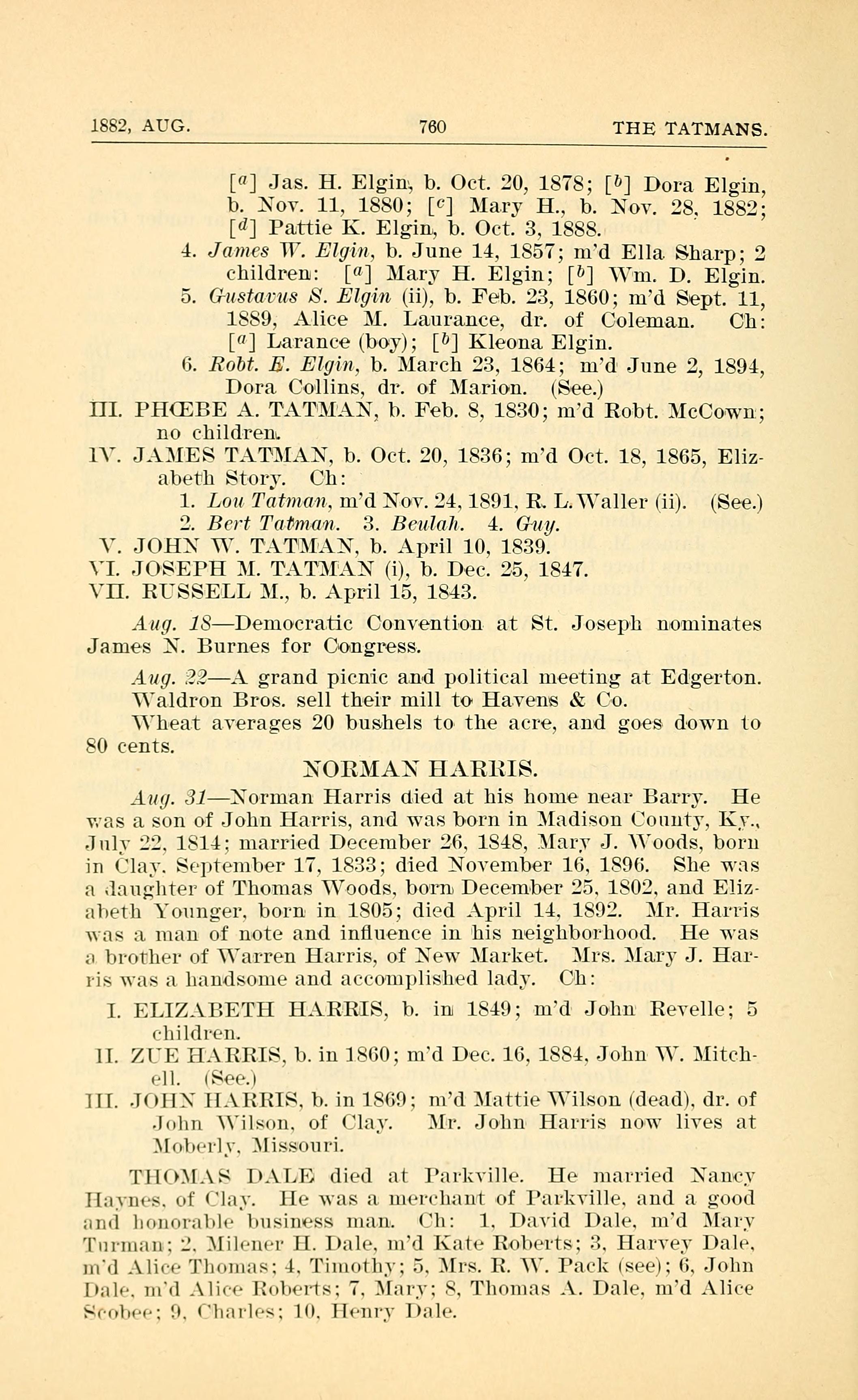 1882, AUG. 760 THE TATMANS, [0] Jas. H. Elgin, b. Oct. 20, 1878; [b] Dora Elgin, b. Nov. 11, 1880; [0] Mary H., b. Nov. 28, 1882; [C1] Pattie K. Elgin, b. Oct. 3, 1888. 4. James W. Elg/in, b. June 14, 1857; md Ella. Sharp; 2 children: [0] Mary H. Elgin; [5] Vn1. D. Elgin. 5. Gztstarus S. Elgin (ii), b. Feb. 23, 1860; md Sept. 11, 1889, Alice M. Laurance, dr. of Coleman. Children: [0] Larance (boy); [0] Kleona Elgin. 6. Robt. E. Elgin, b. March 23, 1864; md June 2, 1894, Dora Collins, dr. of Marion. (See) III. PHGSBE A. TATMAN, b. Feb. 8, 1830; md Robt. McCoWn; no children 1. JAMES TAIMAN, b. Oct. 20, 1836; md Oct. 18, 1865, Eliz- abeth Story. Children: 1. Lou. Tatmtm, md Nov. 24, 1891. R. L. Waller (ii). (See.) 2. BcrtTat1m-tm. 3. Beulalh. 4. G413/. Y. J OHN IV. IATMAN, b. April 10, 1839. VI. JOSEPH M. TATMAN (i), b. D-ec. 25, 1847. VII. RUSSELL M., b. April 15, 1843. Aug. 18Democratic Convention. at St. Joseph nominates James N. Burnes for Congress. Aug. :2;2A grand picnic and political meeting at Edgerton. Valdron Bros. sell their mill to Havens & Co. VYhea.t averages 20 bushels to the acre, and goes down to 80 cents. NORMAN HARRIS. Aug. 31 Norman Harris died at his home near Barry. He was a son of John Harris, and was born in Madison County, July 22. 1814; married December 2-6, 1848, 1Iar) J. Voods, born in Clay. Se;-pteniber 17, 1833; died November 16. 1896. She was a Jaugliter of Thomas Woods. born. December 25. 1802. and Eliz- abeth Younger. born in 1805; died April 14. 1892. Mr. Harris was a man of note and inuence in his neighborhood. He was a brother of Ya~rren Harris, of New Market. Mrs. Mary J. Har- 1-is was a handsoine and accomplislied lady. Children: I. ELIZABETH HARRIS, b. in 1849; md John Revelle; 5 (11il(l1-c11. II. /.I,F. HARRIS, b. in 1800; md Dec. 10, 1884. John IV. Hitch- vll. (f((.D lll. J()Il. ll. KRIS. b. in 1869; md Mattie Yilson (dead). dr. of John \i1.nn. of Clay. Mr. John Harris now lives at .lnlu-1-l. llissouri. Tll(.l.S l.LE died at larlille. He married 1ancv ll:11n-s. of Play. He was :1. I1lLl(ll&l11t of Iarl{Ville. and a good and lmlm1:llr lmsiiiess man. C11: 1. David Dale. 1nd Mary lu1-man: 2. Milo-nvr II. Dale. n1(l Kate Roberts; 3. Harvey Dale, md ..1lI-l Tlminas; 4. Ti1notl1; 5. Mrs. H. \. Pack (See); 6. John [om]:- ml .li-(- liulne-r1s: 7. Mary; 8, Tlioinas A. Dale. n1d Alice S(-alum-: 9. (l1211l~.~: I0. Il-111) Dale.