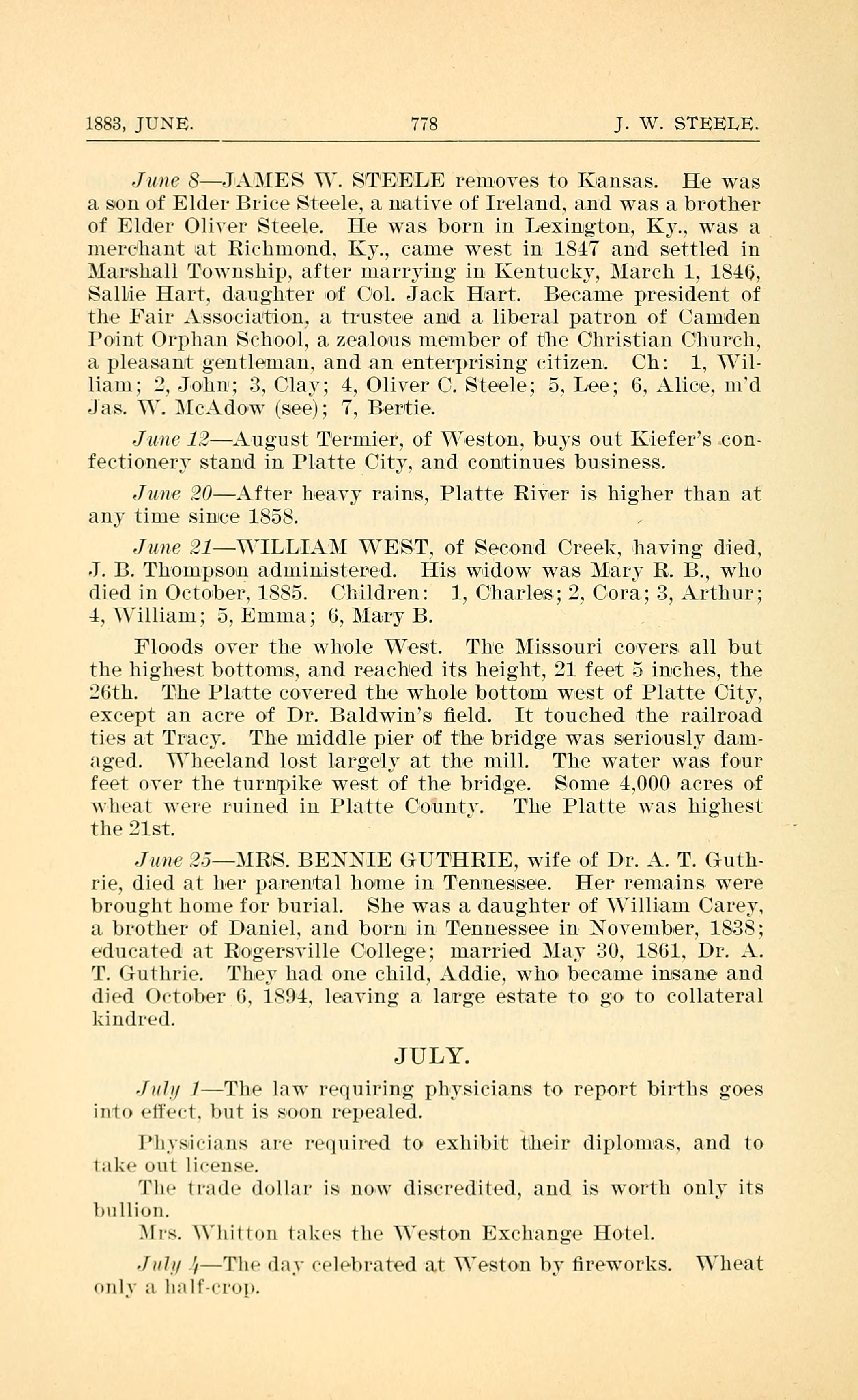 1883, JUNE. 778 J. W. STEELE. June 8 - JAMES W. STEELE removes to Kansas. He was a son of Elder Brice Steele, a native of Ireland, and was a brother of Elder Oliver Steele. He was born in Lexington, Ky., was a merchant at Richmond. Ky., came west in 1847 and settled in Marshall Township, after marrying in Kentucky, March 1, 1846, Sallie Hart, daughter of Col. Jack Hart. Became president of the Fair Association, a. trustee and a. liberal patron of Camden Point Orphan School, a zealous member of the Christian Church, a pleasant gentleman. and an enterprising citizen. Children: 1. William Steele 2. John Steele 3. Clay Steele 4. Oliver C. Steele 5. Lee Steele 6. Alice Steele, 1nd Jas. W. McAdow (see); 7. Bertie Steele June 12 - August Termier, of Weston, buys out Kiefer's confectionary stand in Platte City, and continues business. June 20 - Weather - After heavy rains, Platte River is higher than at any time since 1858. June 21 - WILLIAM WEST of Second Creek, having died, J. B. Thompson adiministered. His Widow was Mary R. B., who died in October, 1885. Children: 1. Charles West 2. Cora West 3. Arthur West 4. William West 5. Emma West 6. Mary B. West Floods over the whole West. The Missouri covers. all but the highest bottoms, and reached its height, 21 feet 5 inches, the 26th. The Platte covered the Whole bottom West of Platte City, except an acre of Dr. Baldwins eld. It touched the railroad ties at Tracy. The middle pier of the bridge Was seriously dam- aged. Wheeland lost largely at the mill. The water was four feet over the turnpike west of the bridge. Some 4,000 acres of wheat were ruined in Platte County. The Platte was highest the 21st. June 25 - MRS. BENNIE GUTHRIE, wife of Dr. A. T. Guthrie, died at her parenrtal home in Tennessee. Her remains were brought home for burial. She was a daughter of William Carey, a brother of Daniel, and born in Tennessee in November, 1838; educated at Rogersville College; married May 30. 1861. Dr. A. T. Guthrie. They had one child, Addie, who became insane and died October 3, 1894, leaving a large estate to go to collateral kindred. JULY. July 1 - The law requiring physicians to report births goes into effect, but is soon repealed. Phsyicians are required to exhibit their diplomas. and to take out license. The trade dollar is now discredited, and is worth only its bullion. Mrs. Whitton takes the Weston Exchange Hotel. July 4 - The day celebrated at Weston by fireworks. Wheat only half-crop.