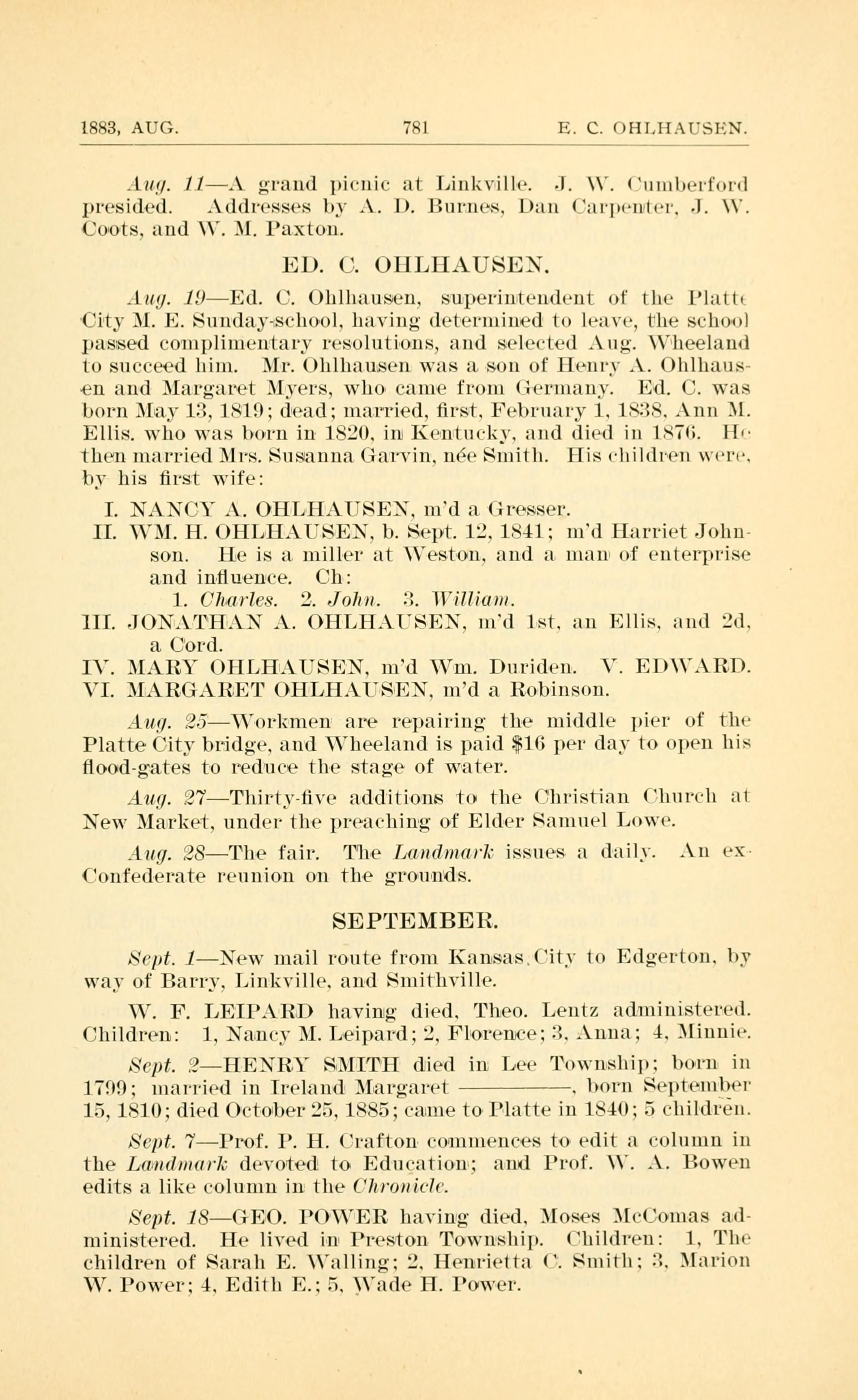 1883. AUG. 781 E. C. OHLHAUSEN Aug. 11 - grand picnic Linkville J. W. Cumberford A. D. Burnes Dan Carpenter J. W. Coots W. M. Paxton ED. C. OHLHAUSEN Platte City M. E. Sunday-school Aug. Wheeland Henry A. Ohlhausen Margaret Myers Ann M. Ellis Mrs. Susanna Garvin, nee Smith I. NANCY A. OHLHAUSEN Gresser II. WILLIAM H. OHLHAUSEN Harriet Johnson miller at Weston 1. Charles Ohlhausen 2. John Ohlhausen 3. William Ohlhausen III. JOHNATHAN A. OHLHAUSEN Ellis Cord IV. MARY OHLHAUSEN William Duriden V. EDWARD OHLHAUSEN VI. MARGARET OHLHAUSEN Robinson Aug. 25 - Workmen are repairing the middle pier of the Platte City bridge, and Wheeland is paid $16 per day to open his flood-gates to reduce the stage of water. Aug. 27 - Thirty five additions to the Christian Church at New Market, under the preaching of Elder Samuel Lowe. Aug. 28 - The fair. The Landmark issues a daily. An ex-Confederate reunion on the grounds. SEPTEMBER Sept. 1 - New mail route from Kansas City to Edgerton, by way of Barry, Linkville, and Smithville. W. F. LEIPARD having died. Theo. Lentz 1. Nancy Leipard 2. Florence Leipard 3. Anna Leipard 4. Minnie Leipard HENRY SMITH Ireland Margaret ____ Prof. P. H. Crafton Landmark Prof. W. A. Bowen Chronicle GEORGE POWER Moses McComas Sarah E. Walling Henrietta C. Smith Marion W. Power Edith E. Wade H. Power