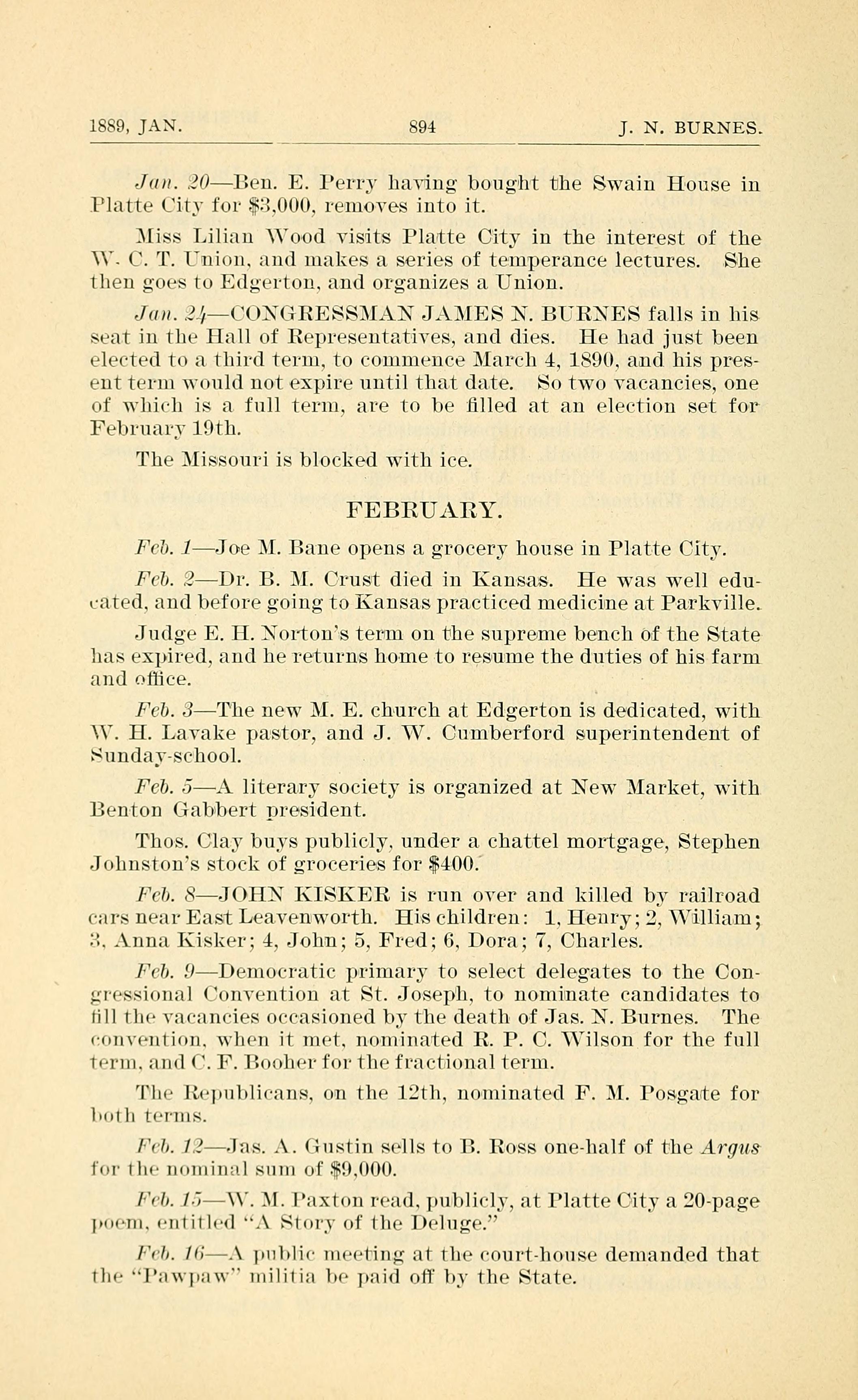 1889, JAN. 894 J. N. BURNES. January 20 - Benjamin E. Perry having bought the Swain House in Platte City for $3,000, removes into it. Miss Lilian Wood visits Platte City in the interest of the W. C. T. Union, and makes a series of temperance lectures. She then goes to Edgerton, and organzies a Union. Jan. 24 - CONGRESSMAN JAMES N. BURNES falls in his seat in the Hall of Representatives and dies. He had just been elected to a third term, to commence March 4, 1890, and his present term would not expire until that date. So two vacancies, one of which is a full term, are to be filled at an election set for February 19th. The Missouri river is blocked with ice. FEBRUARY Feb. 1 - Joe M. Bane opens a grocery house in Platte City. Feb. 2 - Dr. B. M. Crust dies in Kansas. He was well educated, and before going to Kansas, practived medicine at Parkville. Judge E. H. Norton's term on the supreme bench of the State has expired, and he returns home to resume the duties of his farm and office. Feb. 3 - The new M. E. church at Edgerton is dedicated, with W. H. Lavake pastor, and J. W. Cumberford superintendent of Sunday-school. Feb. 5 - A literary society is organized at New Market, with Benton Gabbert president. Thomas Clay buys publicly, under a chattel mortgage, Stephen Johnson's stock of groceries for $400. Feb. 8 - JOHN KISKER is run over and killed by railroad cars near East Leavenworth. His children: 1. Henry Kisker 2. William Kisker 3. Anna Kisker 4. John Kisker 5. Fred Kisker 6. Dora Kisker 7. Charles Kisker Feb. 9 - Democratic primary to select delegates to the Congressional Convention at St. Joseph, to nominate candidates to fill the vacancies occasioned by the death of James N. Burnes. The convention, when it met, nominated R. P. C. Wilson for the full term, and C. F. Booher for the fractional term. The Republicans, on the 12th, nominated F. M. Posgate for both terms. Feb. 12 - James A. Gustin sells to B. Ross one-half of the Argus for the nominal sum of $9,000. Feb. 15 - W. M. Paxton read, publicly, at Platte City at 20-page poem, entitled "A Story of the Deluge". Feb. 16 - A public meeting at the court-house demanded that the "Pawpaw" militia be paid off by the State.