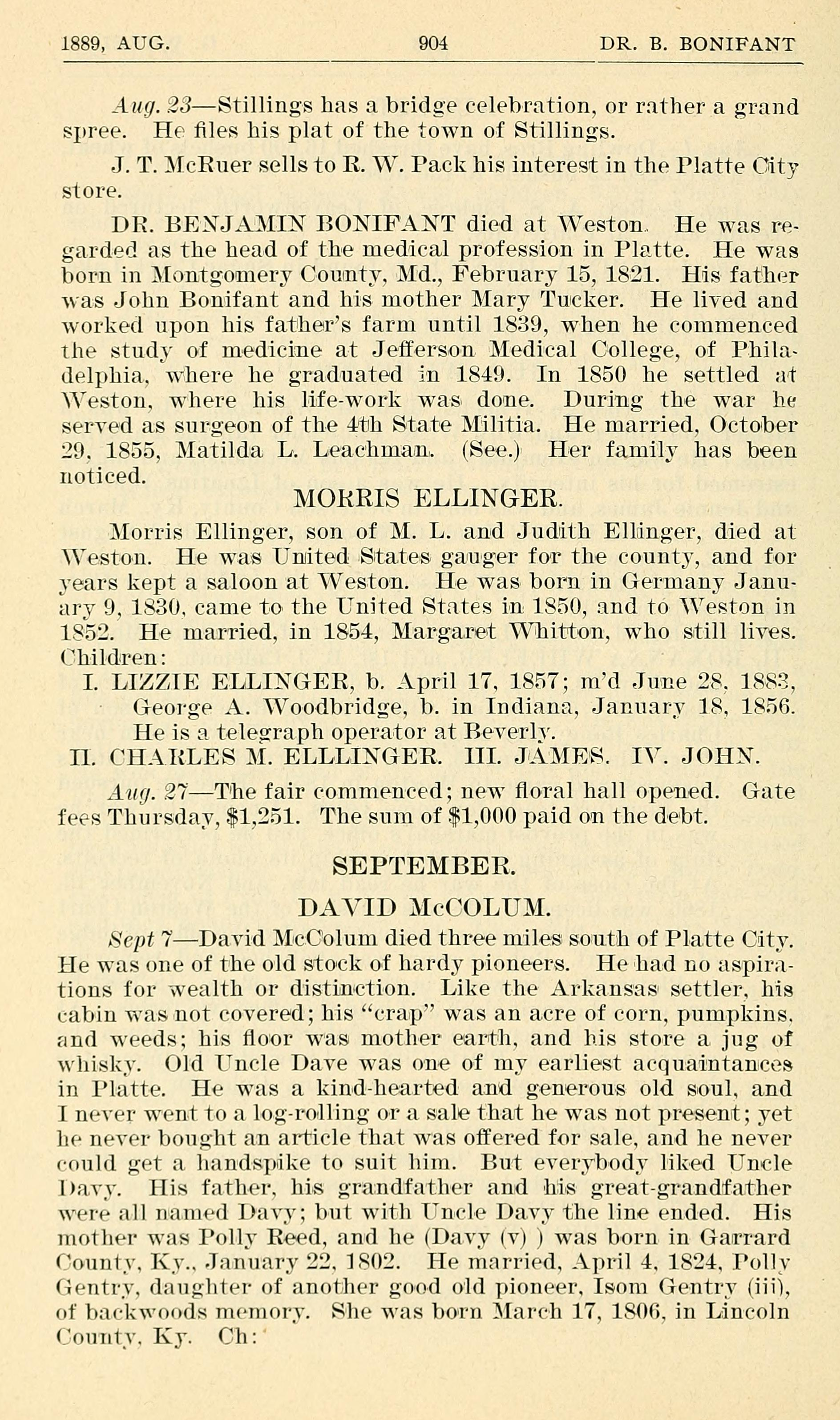 1889, AUG. 904 DR. B. BONIFANT Aug. .23Stillings has a bridge celebration, or rather a grand spree. He les his plat of the town of Stillings. J. T. )IcRuer sells to R. XV. Pack his interest in the Platte Oity store. DR. BENJAMIN BONIFANT die-d at Weston.. He was re- garded as the head of the medical profession in Platte. He was born in Xiontgoimery County. Md., February 15, 1821. His father was John Bonifant and his mother Mary Tueker. He lived and worked upon his fathers farm until 1839, when he commenced the study of medicine a-t Jetl7erso-n Medical College, of P.hila~ delphia. where he graduated in 1849. In 1850 he settled at \eston. Where his life-WOIl{ was done. During the War he served as surgeon of the 4t1h State Militia. He married, October 29. 1855, Matilda L. Lleaelimain. (See) Her family has been noticed. MORRIS ELLINGER. Morris Ellinger, son of M. L. and Judith Ellinger, died at \eston. He was Unlited .Seta.tes ganuger for the county, and for years kept a saloon at West0n. He was born in Germany Ja.nu- ary 9. 1830. came to the United States in 1850, and to Weston in 1852. He married, in 1854, lIar-ga.ret Whitrto~n, who still lives. Children : I. LIZZIE ELLINGER, b. April 17, 1857; n1d June 28. 1883, George A. V00-dbridge. b. in Indiana, January 18, 1856. He is a telegraph operator at Beverly. 11. CHARLES M. ELLLINGER. III. JvAlIE~S. IV. JOHN. Aug. 27The fair commenced; new oral hall open-ed. Gate fees Thursday, $1,251. The sum of $1,000 paid on the debt. SEPTEMBER. DAVID MCCOLUM. Sept 7David McColum died three miles SOl11tl1 of Platte City. He was one of the old stock of hardy pioneers. He had no aspira- tions for wealth or distiinc-tion. Like the Arkansas settler. his cabin was not covered; his crap" was an acre of corn, pumpkins. and weeds; his floor was mother ea1tl1, and his store a. jug of whisky. Old Fncle Dave was one of my earliest acquaintanlces in Platte. He was a kind~-hearted and generous old soul, and I never went to a log-roalling o-r a sale that he was 11ot present; yet he never bought an article that was offered for sale, and he never muld get :1. liamlspdke, to suit him. But eerybod liked Uncle lbayy. His father. his grazndfatlier and his great-grandfatlier were all naim-l Davy; but with Uncle Dayy the line ended. His mother was Polly Reed, and he (Davy (V) ) was born in Garrard (,ount. I{.. January 22. 1802. He married. April 4. 1824. Polly (ientry. daughter of another good old pioneer. Isom Gentry (iii), of bmj-kw(md. memory. She was born l[ar(--11 17, 1806. in Lincoln (A()l]Ili. Ky. C111