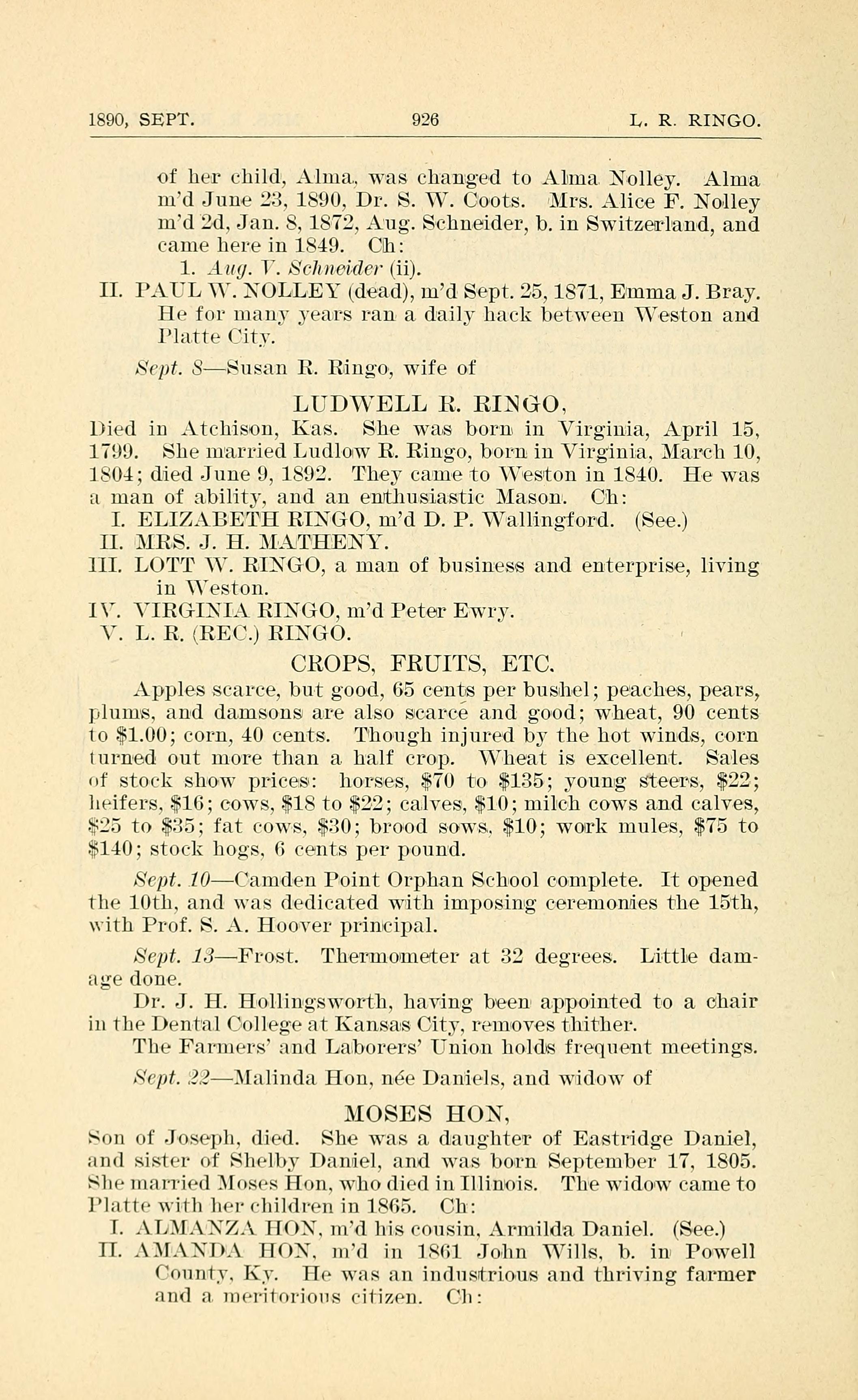 1890, SEPT. 926 L. R. RINGO. of her child, Alma, was changed to Alma Nolley. Alma married June 23, 1890, Dr. S. W. Coots. Mrs. Alice F. Nolley married second, Jan. 8, 1872, Aug. Schneider, b. in Switzerland, and came here in 1849. Children: 1. Aug. V. Schneider (ii) II. PAUL W. NOLLEY (dead), married Sept. 25, 1871, Emma J. Bray. He for many years ran a daily hack between Weston and Platte City. Sept. 8 - Susan R. Ringo, wife of LUDWELL R. RINGO Died in Atchison, Kas. She was born in Virginia, April 15, 1799. She married Ludlow R. Ringo, born in Virginia, March 10, 1084; died June 9, 1892. They came to Weston in 1840. He was a man of ability, and an enthusiastic Mason. Children: I. ELIZABETH RINGO, married D. P. Wallingford (see) II. MRS. J. H. MATHENY III. LOTT W. RINGO, a man of business and enterprise, living in Weston IV. VIRGINIA RINGO, married Peter Ewry V. L. R. (REC.) RINGO CROPS, FRUITS, ETC. Sept. 10 - Camden Point Orphan School complete. Prof. S. A. Hoover principal Sept. 13 - Weather - Frost. 32 degrees Dr. J. H. Hollingsworth having been appointed to a chair in the Dental College at Kansas City, removes thither. The Farmers' and Laborers' Union holds frequent meetings. Sept. 22 - Malinda Hon, nee Daniels, and widow of MOSES HON, Son of Joseph, died. She was a daughter of Eastridge Daniel, and sister of Shelby Daniel, and was born September 17, 1805. She married Moses Hon, who died in Illinois. The widow came to Platte with their children in 1865. Children: I. ALMANZA HON, married his cousin, Armilda Daniel (see) II. AMANDA HON, married in 1861 John Wills, b. in Powell County, Ky.
