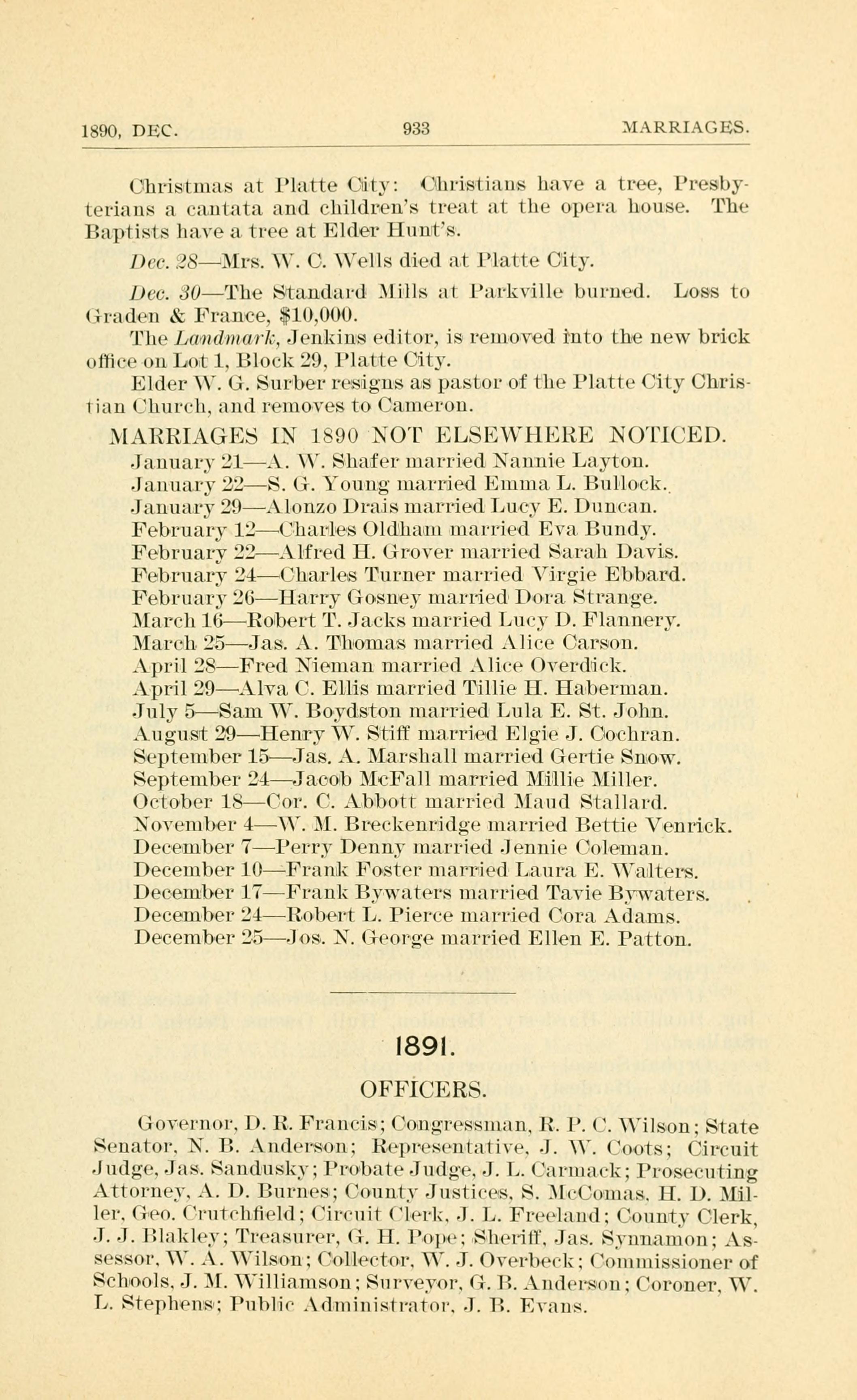 1890, DEC. 933 MARRIAGES Dec. 28 - Mrs. W. C. Wells died at Platte City. Dec. 30 - The Standard Mills at Parkville burned. Loss to Graden & France, $10,000. The Landmark, Jenkins editor, is removed into the new brick office on Lot 1, Block 29, Platte City. Elder W. G. Surber resigns Platte City Christian Church MARRIAGES IN 1890 NOT ELSEWHERE NOTICED January 21 - A. W. Shafer married Nannie Layton January 22 - S. G. Young married Emma L. Bullock January 29 - Alonzo Drais married Lucy E. Duncan February 12 - Charles Oldham married Eva Bundy February 22 - Alfred H. Grover married Sarah Davis February 24 - Charles Turner married Virgie Ebbard February 26 - Harry Gosney married Dora Strange March 16 - Robert T. Jacks married Lucy D. Flannery March 25 - Jas. A. Thomas married Alice Carson April 28 - Fred Nieman married Alice Overdick April 29 - Alva C. Ellis married Tillie H. Haberman July 5 - Sam W. Boydston married Lula E. St. John August 29 - Henry W. Stiff married Elgie J. Cochran September 24 - Jacob McFall married Millie Miller October 18 - Cor C. Abbott married Maud Stallard November 4 - W. M. Breckenridge married Bettie Venrick December 7 - Perry Denny married Jennie Coleman December 10 - Frank Foster married Laura E. Walters December 17 - Frank Bywaters married Tavie Bywaters December 24 - Robert L. Pierce married Cora Adams December 25 - Jos. N. George married Ellen E. Patton 1891 OFFICERS D. R. Francis R. P. C. Wilson N. B. Anderson J. W. Coots Jas. Sandusky J. L. Carmack A. D. Burnes S. McComas H. D. Miller George Crutchfield J. L. Freeland J. J. Blakley G. H. Pope James Synnamon W. A. Wilson W. J. Overbeck J. M. Williamson G. B. Anderson W. L. Stephens J. B. Evans