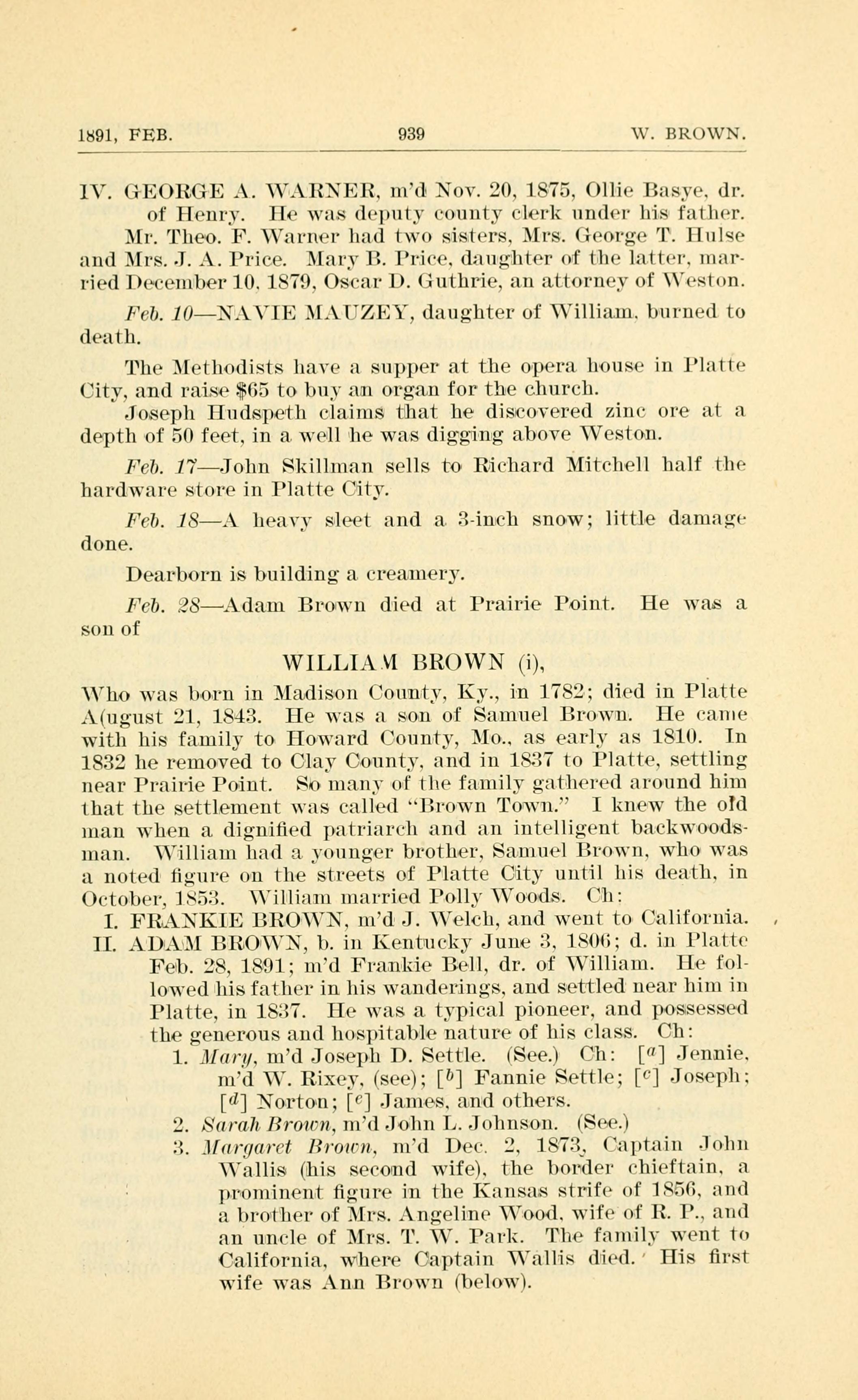 1891, FEB. 939 V. BR()VN. IV. GEORGE A. V.RNER, n1d- Nov. 20. 1875, Ollie Bas.v-, dr. of Henry. He was deputy county clerk under his father. Hr. Theo. F. Varner had two sisters. Mrs. George 1. llulse and Mrs. J. A. Price. Mary B. lrive. (1:fll1g?llt(I of the latter. mar- ried December 10. 1879. Oscar D. G uthrie. a11 attornev of Weston. Feb. 10N.XIE .LlTZEY, daughter of Willia.1n. burned to death. The Bletliodists have a supper at the opera house in Platte City, and raise $65 to buy an organ for the church. Joseph Hudspeth claims that he discovered zine ore at a depth of 50 feet. in a. well he was diggi-nvg above Weston. Feb. 17John Skilhnan sells to Richard Mitchell half the hardware store in Platte City. Feb. 18A heavy sleet and a. 3-inch snow; little damage done. Dearborn is building a Creamery. Feb. .28~Adan1 Brown died at Prairie Point. He was a son of WILLIA .v1 BROWN (i), Vho was born in Maldison County. Ky., in 1782; died in Platte A(ugust 21. 1843. He was a son of Samuel Brown. He came with his family to Howard County, Mo.. as early as 1810. In 1832 he removed to Clay County. and in 1837 to Platte. settling near Prairie Point. So 1na.n of the family gatliered around him that the settlement was called Brown Town. I knew the old man when a dignied patriarch and an intelligent backwoods- nian. Yillian1 had a. younger brother. Saniuel Brown. who was a noted figure on the streets of Platte City until his death. in October, 1353;. Villia1n married Polly Voods. Children: I. FRANKIE BROWN. 1nd J. Velch. and went to California. II. ADAM BROWN, b. i11 Kentlucky June 3. 18013; d. in Platte Feb. 28, 1891; n1d Fra.n~k~ie B-ell. dr. of Villian1. He fol- lowed his father in his wanderings, and settled near him in Platte, in 1837. He was a typical pioneer, and possessed the generous and hospitable nature of his class. Children: 1. 111(1);/, md Joseph D. Settle. (See.) Children: [0] Jennie. n1d W. Rixey. (see); [5] Fannie Settle; [0] Joseph; [(1] Norton; [0] James. and others. 2. S(ua.h Brown, md John L. Johnson. (See) 3. l[urgmct BlrounA. 1nd Dec. 2. 1S73. (aptain John Yal1is (his second wife). the border c-hieftain. a p.ron1inenrt gure in the Kansas strife of 1.956, and a brother of Mrs. Angeline Vood. wife of R. l.. and an uncle of Mrs. 1. W. Park. The fan1il went to California. Where Captain Wallis d~ie(l. His rst wife was Ann Brown (below).