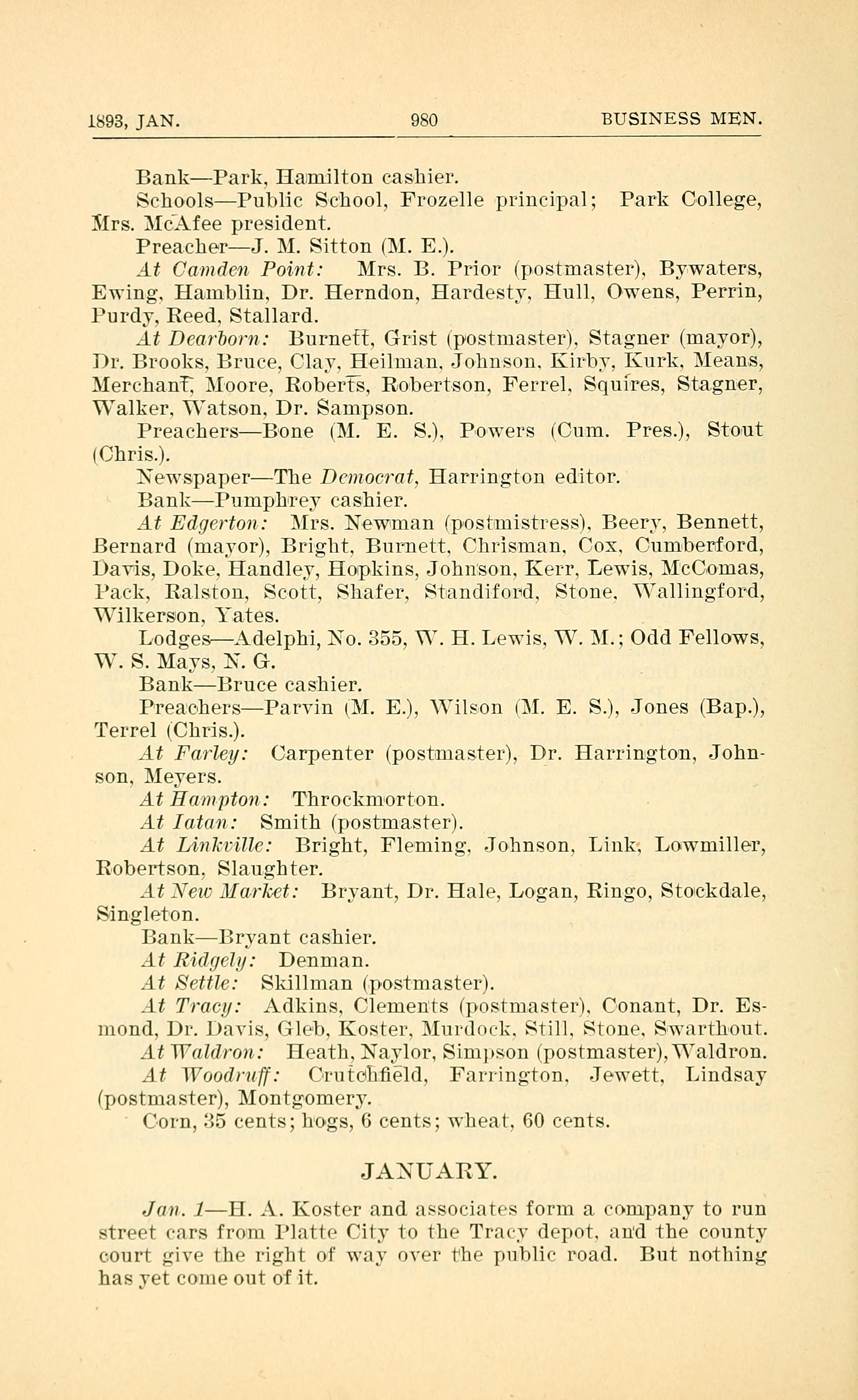 1393, JAN. 980 BUSINESS MEN. Ba.nkPark, Hamilton cashier. Schoo1sPublic School, Frozelle principal; Park College, Mrs. McAfee president. PreacherJ. M. Sitton (1I. E.). At Camde2.. Point: Mrs. B. Prior (postmaster), Bywaters, Ewing. Hamblin, Dr. Herndon, Hardesty, Hull, Owens, Perrin, Purdy. Reed, Stalla-rd. At Dearborm Burnett, Grist tpostinaster), Stagner (mayor), Dr. Brooks, Bruce, Clay, Heilm-an. Johnson. Kirby, Kurk. Means, Merchant, Moore, Roberts, Robert-son, Ferrel, Squires, Stagn-er, Wall;er. Watson, Dr. Sampson. PreachersBone (M. E. S.), Powers (Cum. Pres.), St-out (Chris). NGWSPHPBI-Th Democrat, Harrington editor. BankPnmphtrey cashier. At Edgcrton: Mrs. Newman (pOSUJliSt1SS). Beery, Bennett, Bernard (mayor), Bright. Burnett, Chrisman. Cox. Cumber.f-ord, Davis, Doke, Handley, Hopkins, Johnson, Kerr, Lewis, McC.omas, Pack, Ralston, Scott, Shafer, St-andifond, Stone. Vallingfor~d, Wilkerson, Yates. LodgesAde1phi, No. 355, V. H. Lewis. W. M.; Odd Fellows, W. S. Mays, N. G. Bank Bruce cashier. Preac~hersParvin (M. E.), Vilson (M. E. S.), Jones (Bap), Terrel (Chris). At Farley: Carpenter (postmaster), Dr. Harrington, John- son, Meyers. B At Hampton . Throckm-orton. At Iatcm: Smith (pvostmaster). At Lt1zlcL~ille. Bright, Fleming. Johnson, Link; Lowmiller, Robertson, Slaughter. At New Market: Bryant, Dr. Hale, Logan, Ringo, Stockdale, Singleton. BankBryant cashier. At R-iclgclg/. Denman. At Settle: Skillman (postmaster). At Ttracg/: Adkins. Clements tpostinaster). Conant, Dr. Es- mond, Dr. Davis, Gleb. Koster. M111-dock. Still. Stone. Swarthout. .1tTValzlron: Heath. Naylor, Simpson (postmaster),Yaldron. At Woodru/"f. C-rntohfield, F-arrington. Jewett, Lindsay (postmaster), Montgomery. Corn, 353 cents; hogs, 6 cents; wheat, 60 cents. JANUARY. Jan. 1-H. A. Kostcr and associates form a company to run street cars from Platte City to the Tracy depot. and the county court give the right of way over the public road. But nothing has yet come out of it.