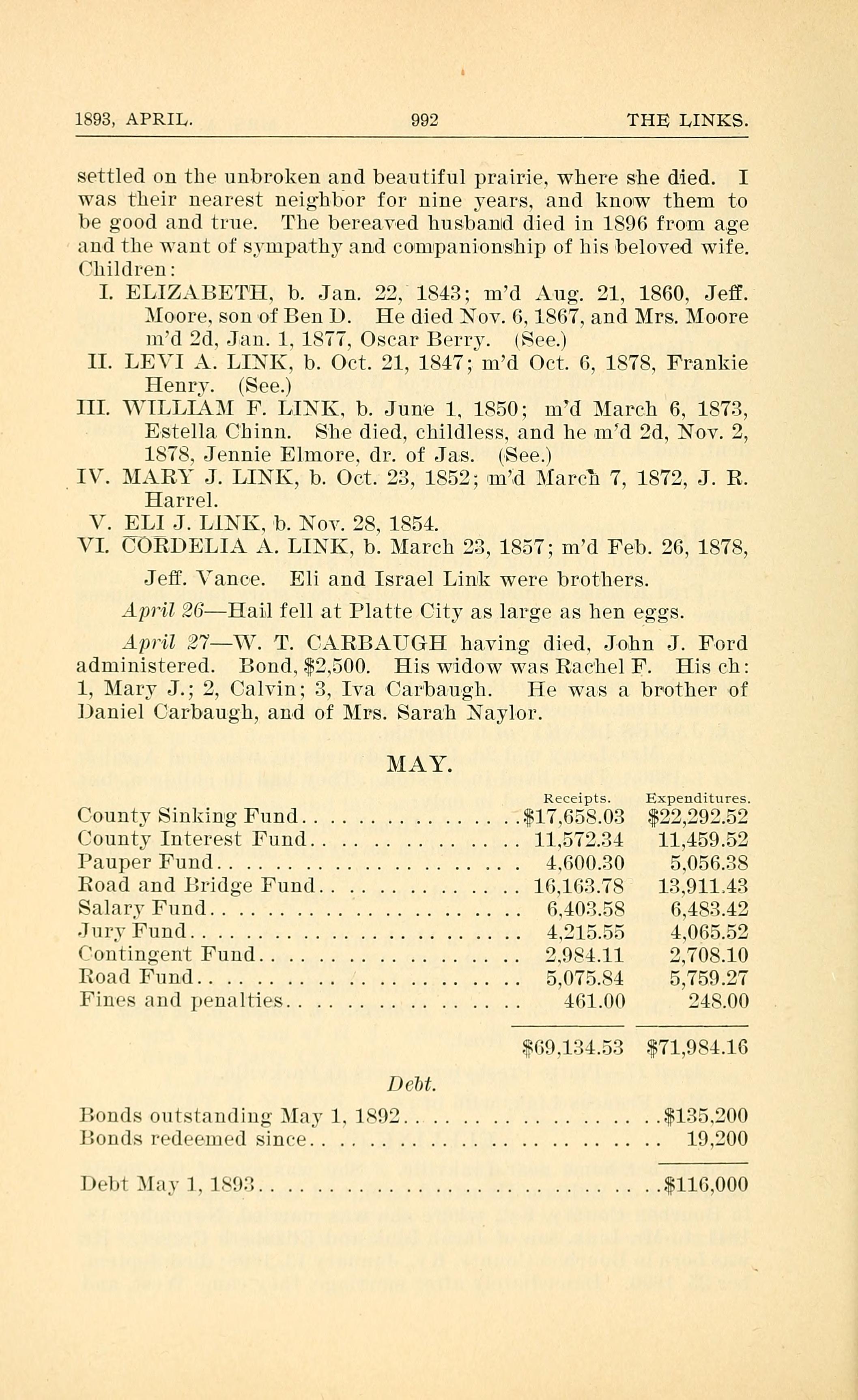 1893, APRIL. 992 THE LINKS. settled on the unbroken and beautiful prairie, Where she died. I was their nearest neighbor for nine years, and know them to be good and true. The bereaved husband died in 1896 from age and the want of sympathy and companionship of his beloved Wife. Children : I. ELIZABETH, b. Jan. 22, 1843; 1nd Aug. 21, 1860, Jeff Moore, son of Ben D. He died Nov. 6, 1867, and Mrs. Moore m'd 2d, Jan. 1, 1877, Oscar Berry. (See) II. LEVI A. LINK, b. Oct. 21, 1847; md Oct. 6, 1878, Frankie Henry. (See) III. WILLLAM F. LINK, b. June 1, 1850; m'd March 6, 1873, Estella Chinn. She died, childless, and he m'd 2d, Nov. 2, 1878, Jennie Elmore, dr. of Jas. (See) IV. MARY J. LINK, b. Oct. 23, 1852; r1nd March 7, 1872, J. R. Harrel. 7. ELI J. LINK, b. Nov. 28, 1854. VI. CORDELIA A. LINK, b. March 23, 1857; m'd Feb. 26, 1878, Jeff. Vance. Eli and Israel Link were brothers. April 26 - Weather - Hail fell at Platte City as large as hen eggs. April 27 - W.T. CARBAUGH having died, John J. Ford administered. Bond, $2,500. His widow Was Rachel F. His Children: 1, Mary J.; 2, Calvin; 3, Iva Carbaurgh. He was a brother of Daniel Carbaugh, and of Mrs. Sarah Naylor. MAY. Receipts. Expenditures. County Sinking Fund. . . . . . . . . . . . . . . $17,658.03 $22,292.52 Coilnty Interest Fund. . . . . . . . . . . . . . 11,572.34 11,459.52 Pauper Fund.. .. .. .. .. .. .. .. .. .. . 4,600.30 5,056.38 Road and Bridge Fund. . .. . . .. .. .. .. 16,163.78 13,911.43 Salary Fund. . .. .. .. .. .. .. .. .. .. .. 6,403.58 6,483.42 JurvFund.. .. .. .. .. .. .. .. .. .. .. .. 4,215.55 4,065.52 (ontingent Fund. . . . . . . . . . . . . . . . .. 2,984.11 2,708.10 Road Fund.. .. .. .. .. .. .. .. .. .. .. 5,075.84 5,759.27 Fines and penalties. . .. .. .. .. .. .. .. 461.00 248.00 -------------------------- $69,134.53 $71,984.16 If)cbt. Bonds outstanding May 1, 1892.. .. .. .. .. .. .. .. ..$135.200 Bonds redeemed since.. .. .. .. .. .. .. .. .. .. .. .. 19,200 Debt May 1, 1893............................$116,000