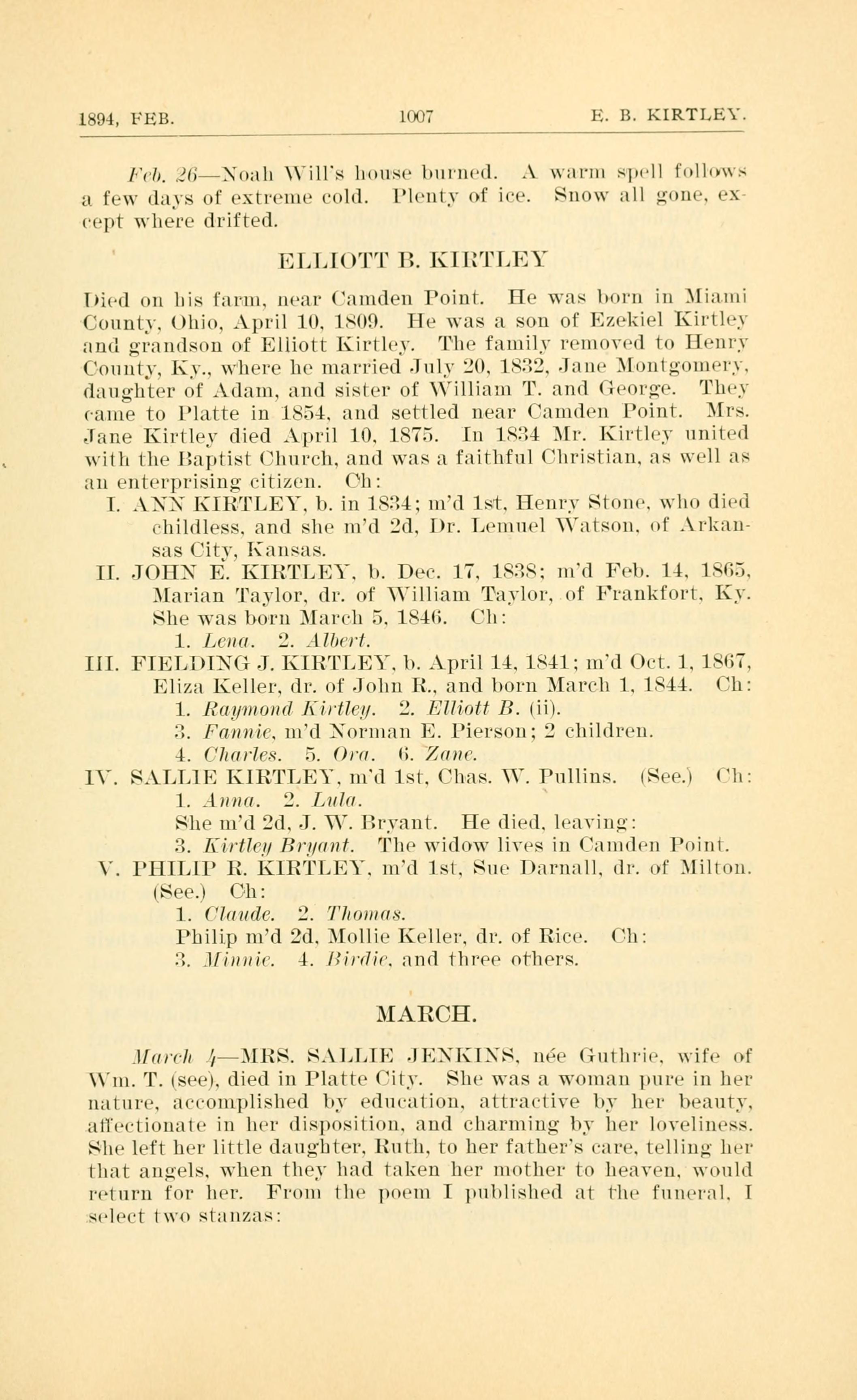 1894, FEB. 1007 E. B. KIRTLEY. Feb. 26 - Noal Will's house burned. Weather A warm spell follows a few days of extreme cold. Plenty of ice. Snow all gone, except where drifted. ELLIOTT B. KIRTLEY Died on his farm, near Camden Point. Ezekiel Kirtley Elliott Kirtley Jane Montgomery Adam Montgomery William Montgomery George Montgomery Jane Kirtley I. ANN KIRTLEY Henry Stone Dr. Lemuel Watson, of Arkansas City, Kansas II. JOHN E. KIRTLEY Marion Taylor William Taylor 1. Lena Kirtley 2. Albert Kirtley III. FIELDING J. KIRTLEY Eliza Keller John R. Keller 1. Raymond Kirtley 2. Elliott B. Kirtley (ii) 3. Fannie Kirtley Norman E. Pierson 4. Charles Kirtley 5. Ora Kirtley 6. Zane Kirtley IV. SALLIE KIRTLEY Chas. W. Pullins 1. Anna Pullins 2. Lula Pullins J. W. Bryant 3. Kirtley Bryant V. PHILIP R. KIRTLEY Sue Darnall Milton Darnall 1. Claude Kirtley 2. Thomas Kirtley Mollie Keller Rice Keller 3. Minnie Kirtley 4. Birdie Kirtley and three others MARCH March 4 - MRS. SALLIE JENKINS, nee Guthrie, wife of William T., died in Platte City. Ruth
