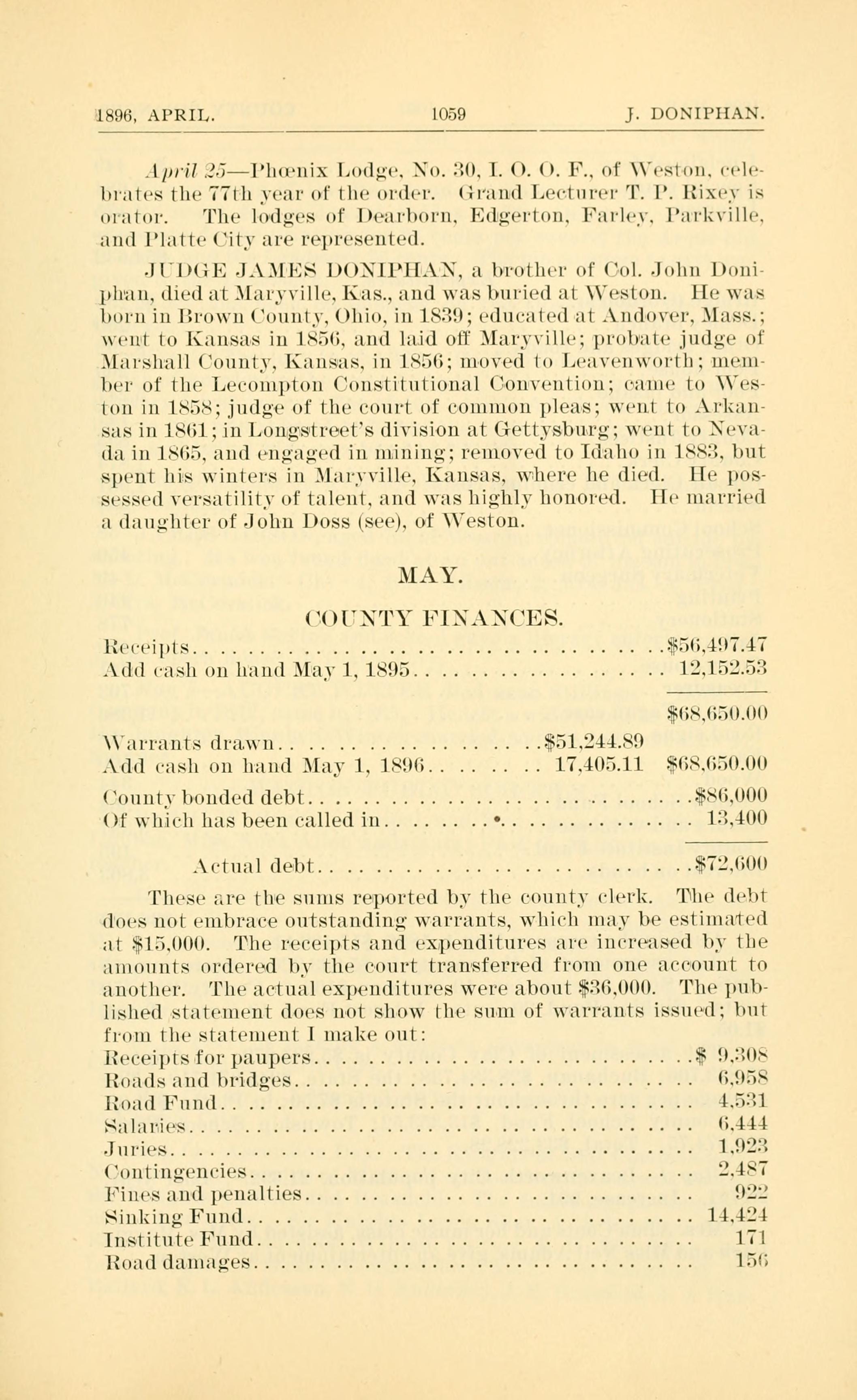 1896, APRIL. 1059 J. DONIPHAN Phoenix Lodge Weston T. P. Rixey JUDGE JAMES DONIPHAN Col. John Doniphan John Doss MAY COUNTY FINANCES