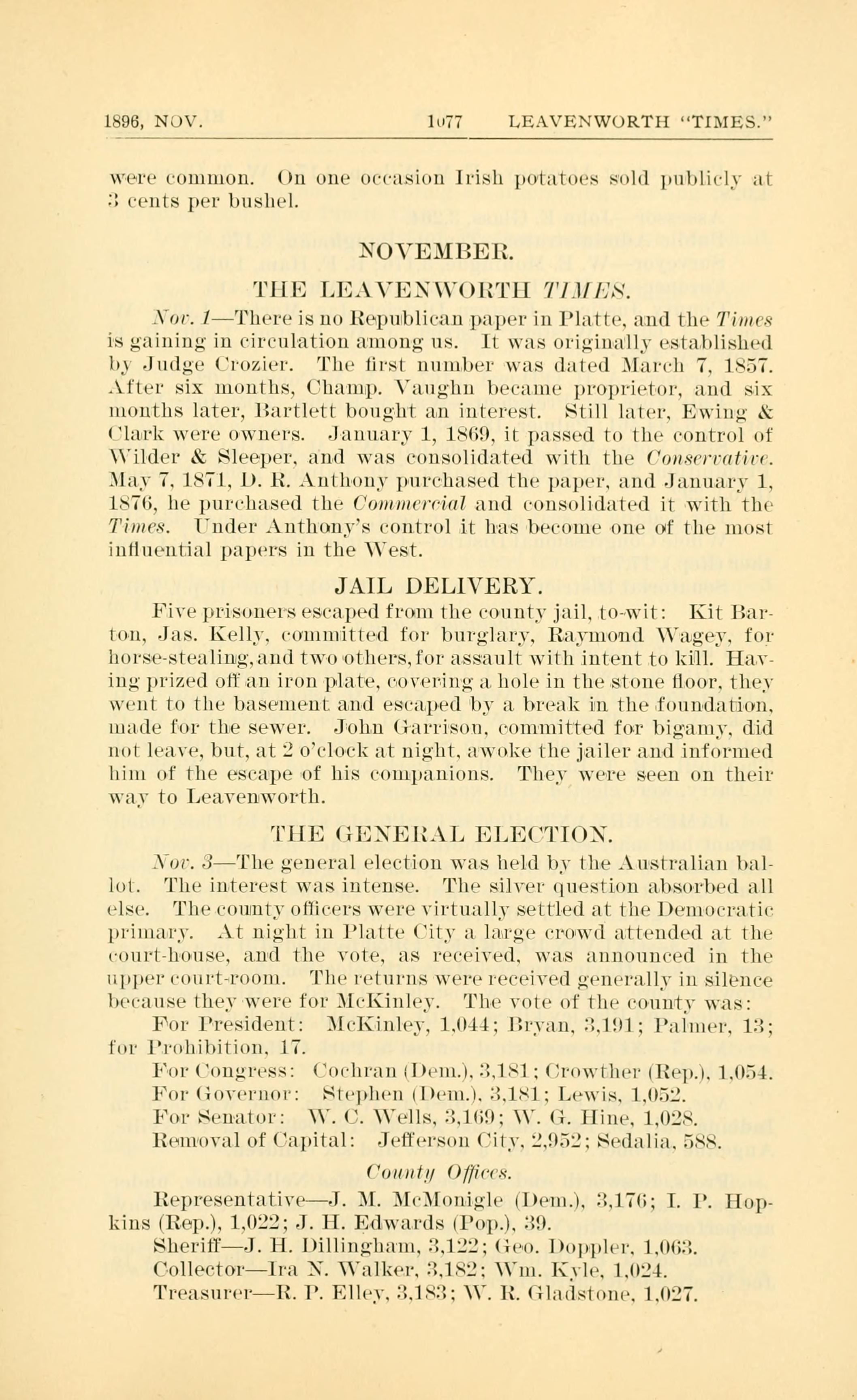 1896, NOV. 1077 LEAVENWORTH TIMES. Judge Crozier Champ. Vaughn Bartlett Ewing & Clark Wilder & Sleeper D. R. Anthony Jail Delivery Five prisoners escapted Kit Barton Jas. Kelly Raymond Wagey John Garrison THE GENERAL ELECTION