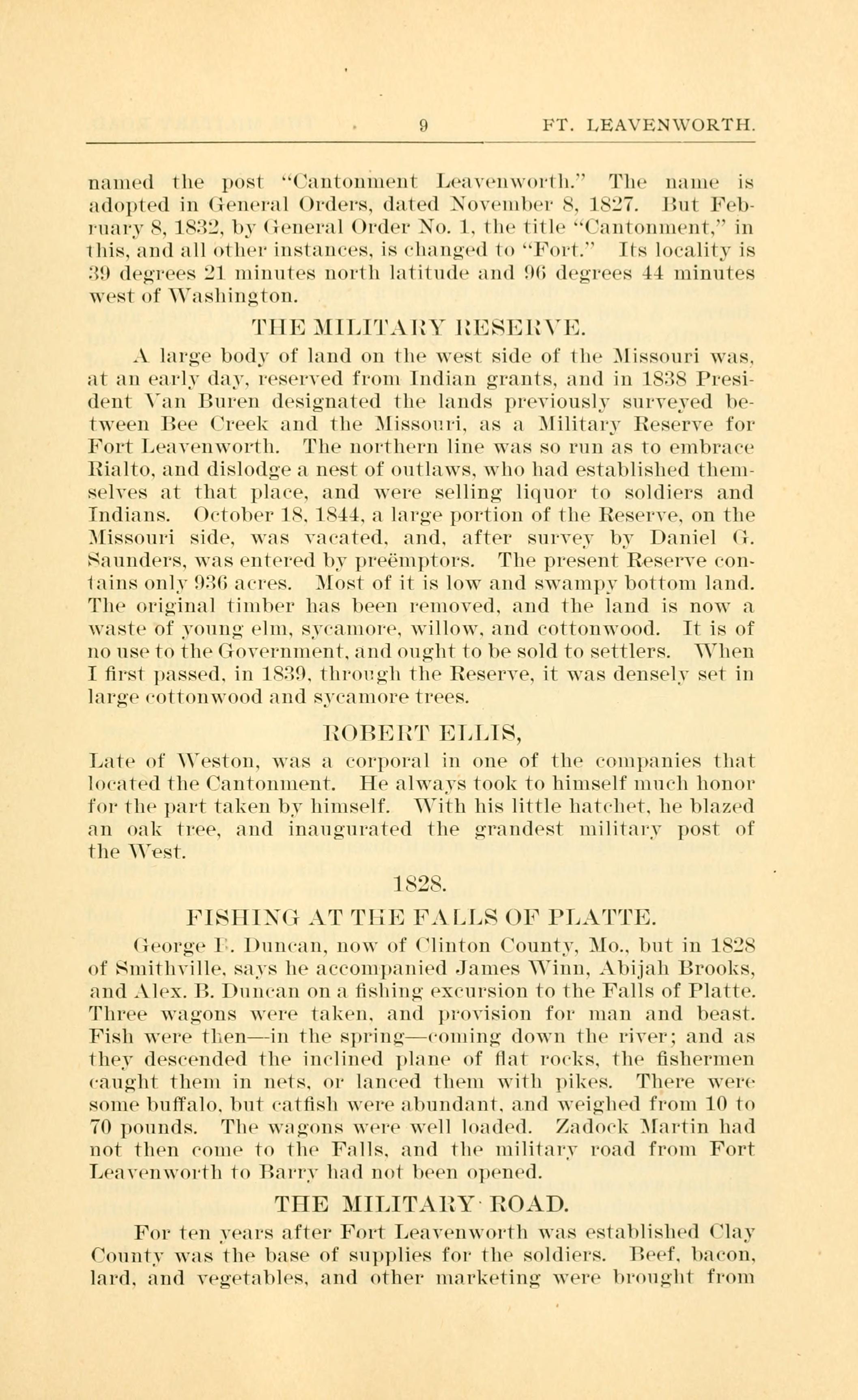 9 FORT LEAVENWORTH THE MILITARY RESERVE ROBERT ELLIS 1828 FISHING AT THE FALLS OF PLATTE THE MILITARY ROAD