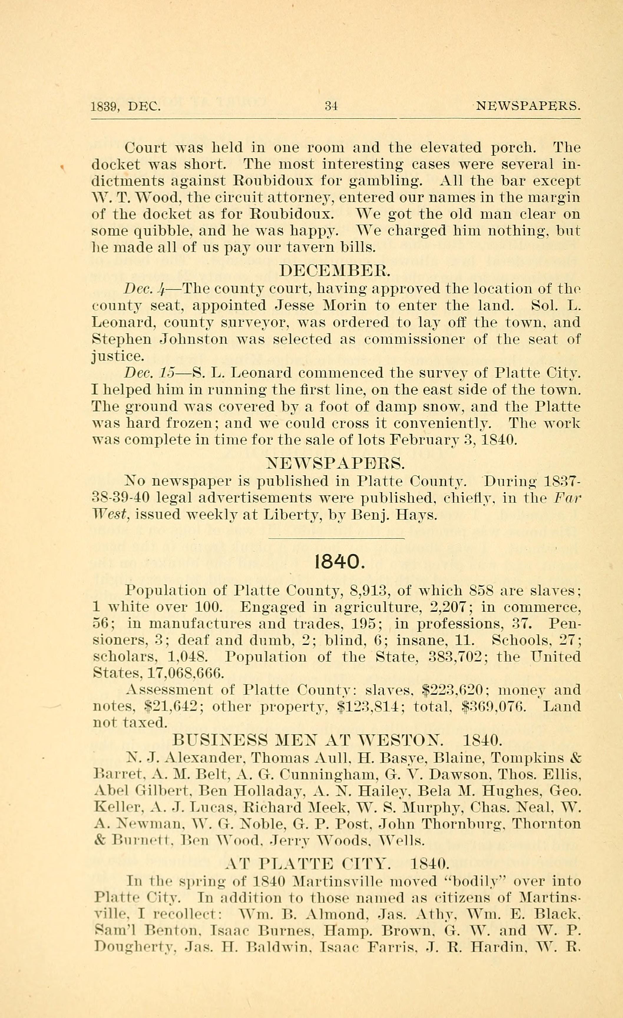Dec. 1JS. L. Leonard commenced the survey of Platte City.