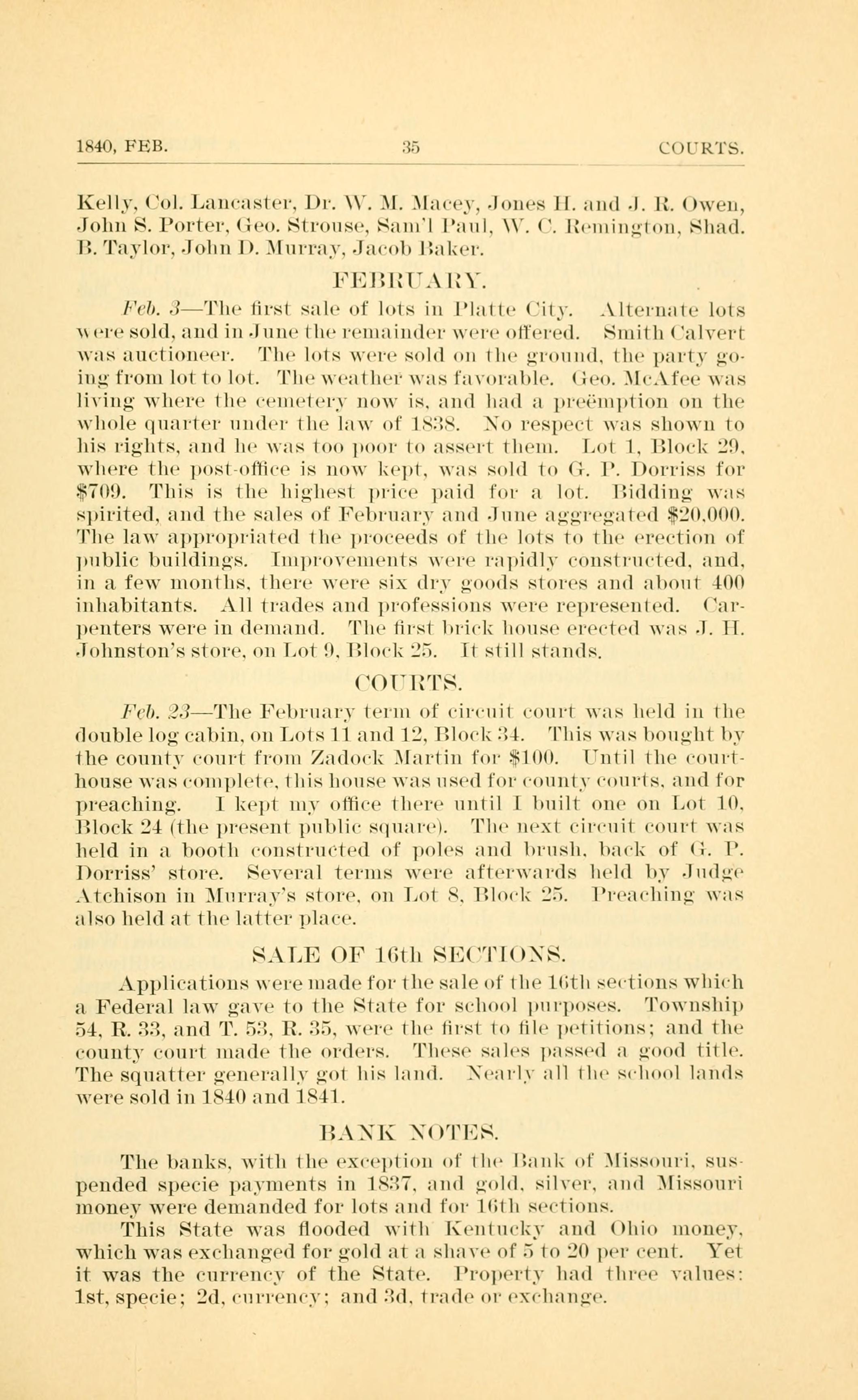 Feb 3 - The first sale of lots in Platte City. Alternate lots were sold. and in June the remainder were offered. Smith Calvert was auctioneer. The lots were sold on the ground, the party going from lot to lot. The weather was favorable. Geo. McAfee was living where the cemetery now is, and had a preemption on the whole quater under the law of 1838. No respect was shown to his rights, and he was too poor to assert them. Lot 1, Block 29, where the post-office is now kept, was sold to G. P. Dorriss for $709. This is the highest price paid for a lot. Bidding was spirited, and the sales of February and June aggregated $20,000. The law appropriarted the proceeds of the lots to the erection of public buildings. Improvements were rapidly constructed and in a few months, there were six dry goods stores and about 400 inhabitants. All trades and professions were represented. Carpenters were in demand. The first brick house erected was J. H. Johnston's store, on Lot 9, Block 25. It still stands.