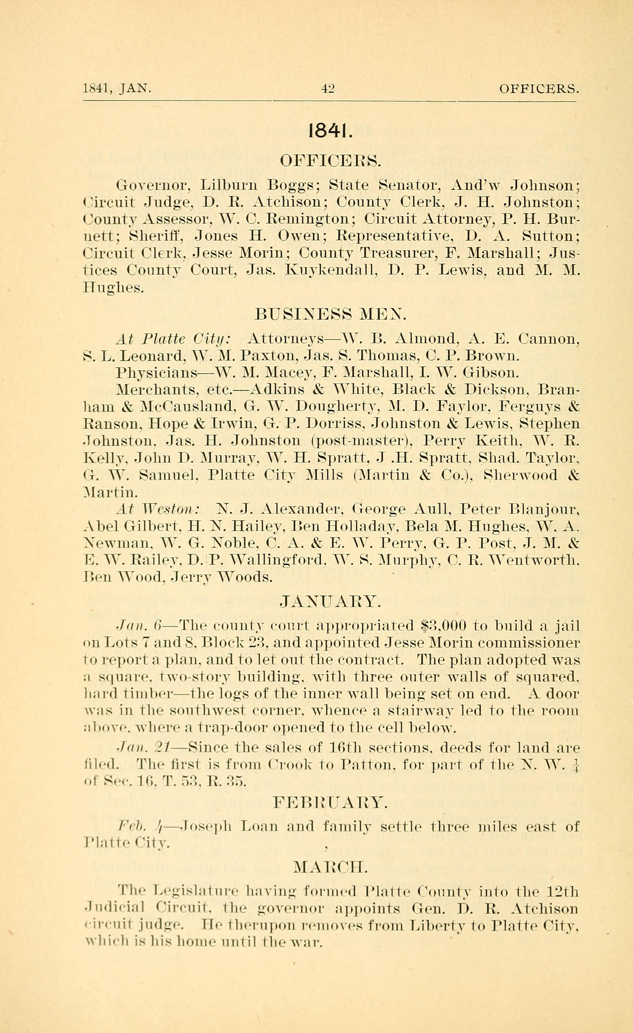 The Legislature having formed Platte County into the 12th Judicial Circuit, the governor appoints Gen. D. R. Atchison circuit judge. He therupon removes from Liberty to Platte City, which is his home until the war.